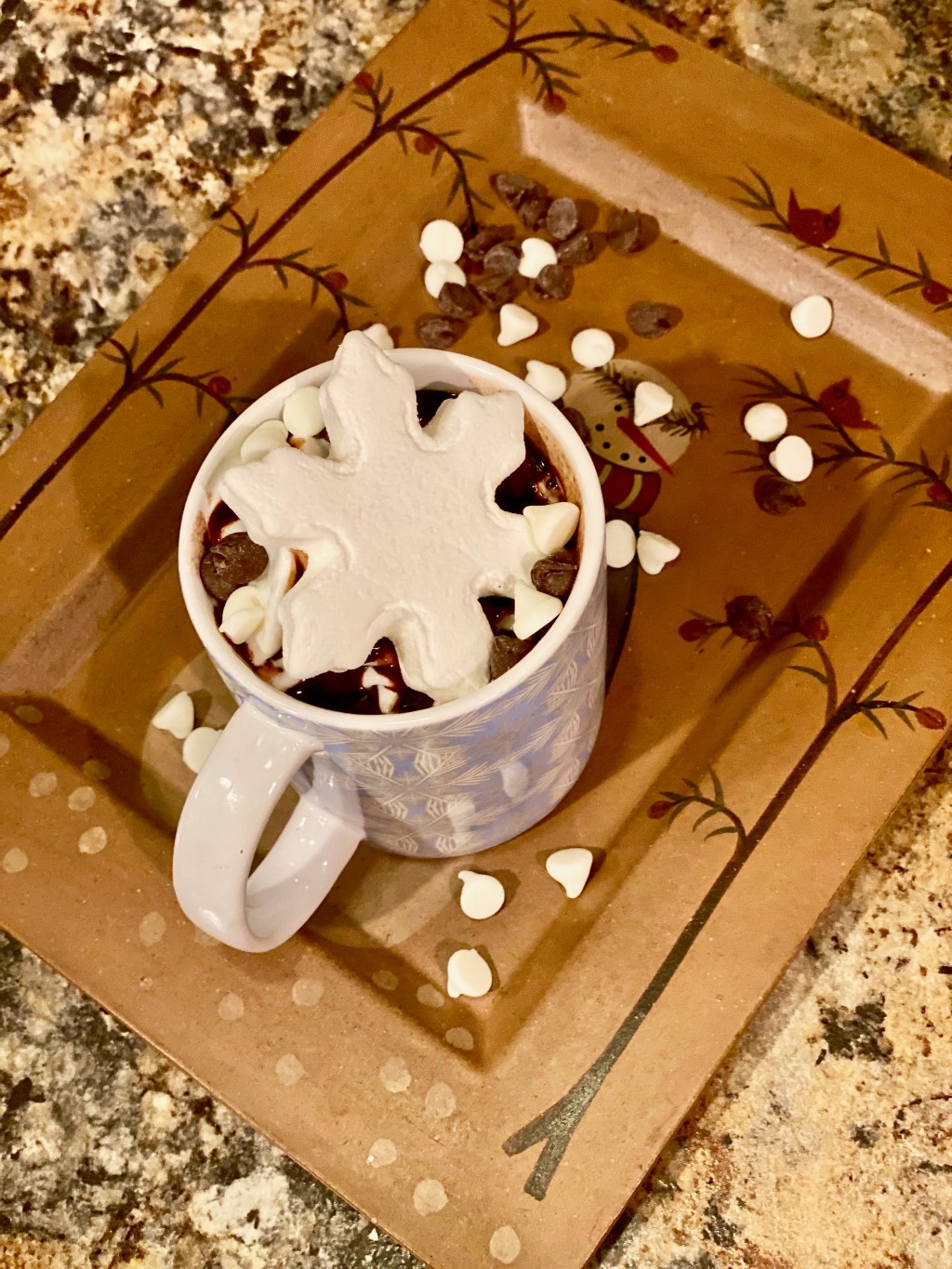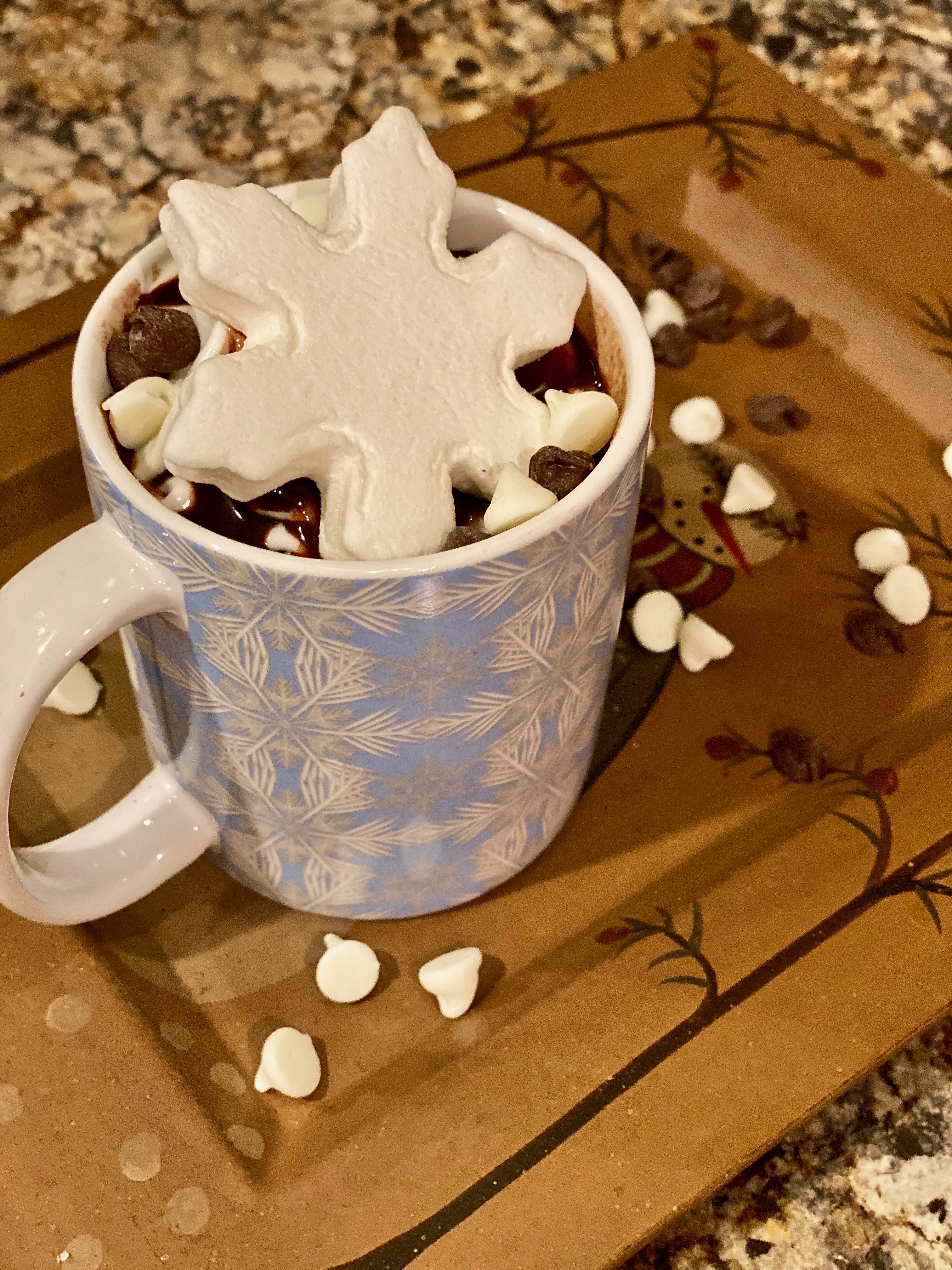 Grab a beautiful winter mug, fill up your cup. Top it off with whipped cream, chocolate syrup (the good kind (; ) a few of both chocolate morsels, and finally an oversized snowflake marshmallow to finish it off! There wasn’t anything more fitting than topping it off with a gigantic snowflake, am I right?! [: