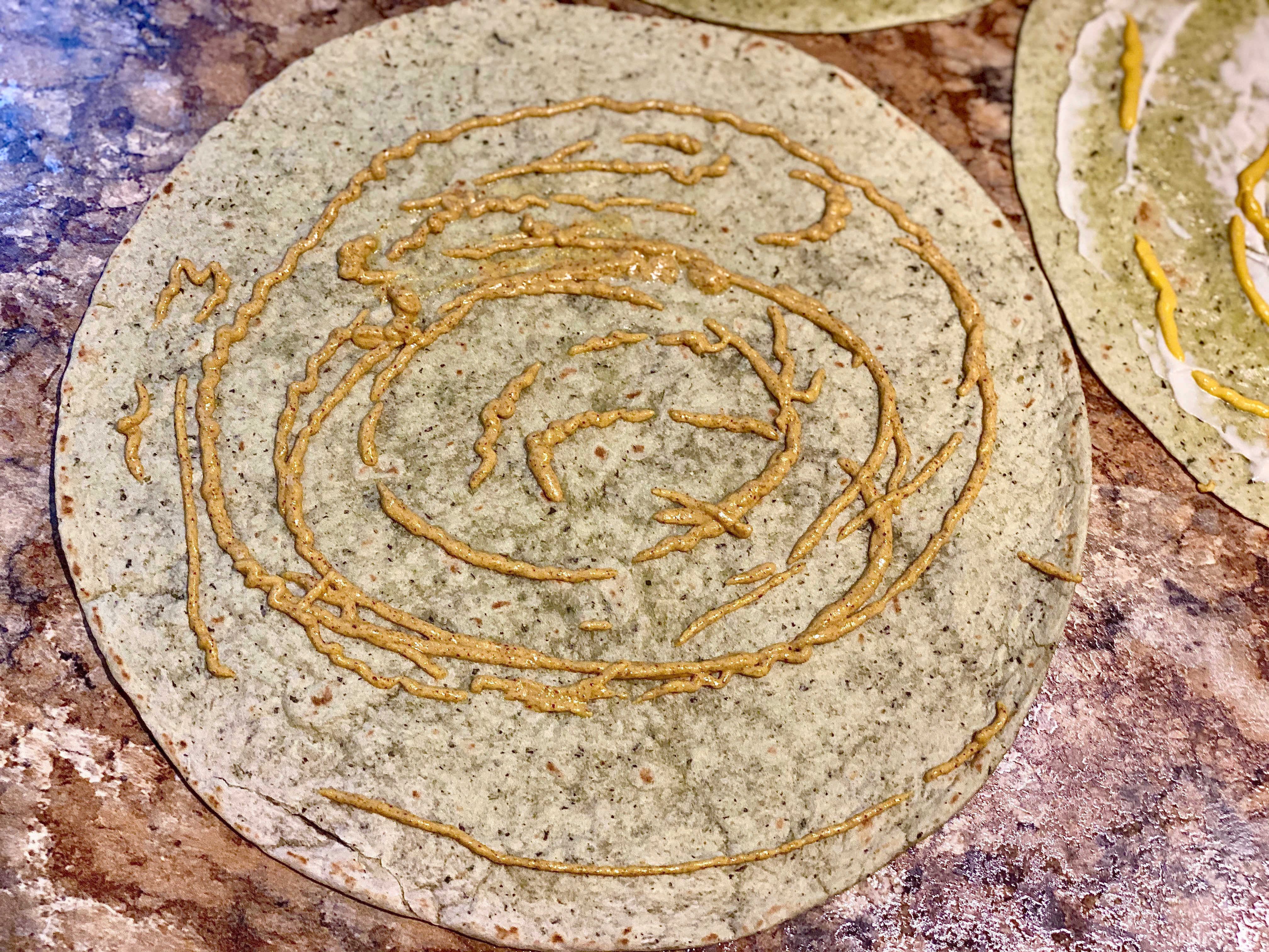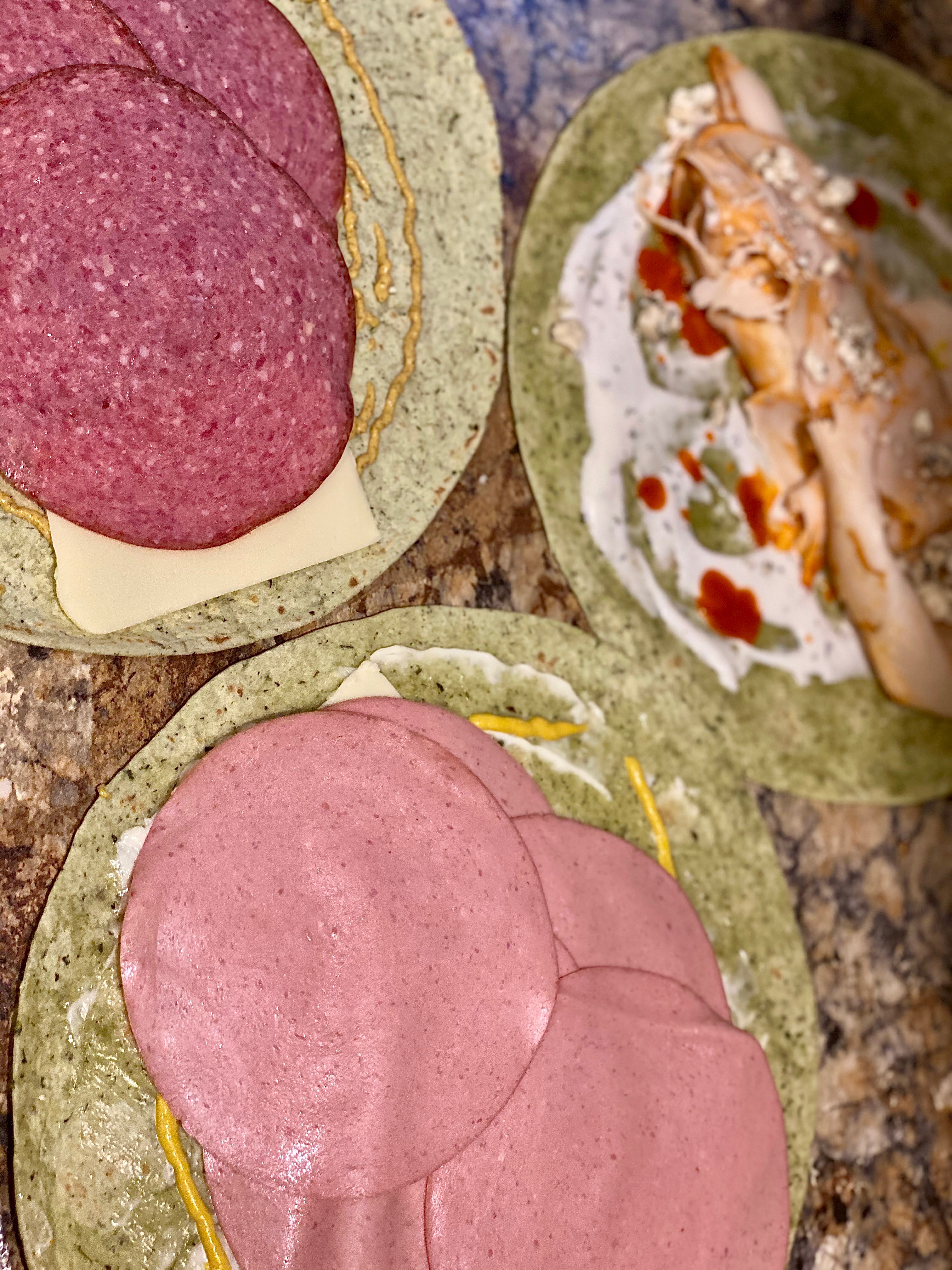 When you’re lounging all snuggled up on the couch.. you are some what rolled up in a ball.. SO I got a little creative and wanted to mimic that with the food we were eating in the special instance. I chose to make three different flavored wraps, and cut them into two inch pin wheels. This effect also makes for great presentation.