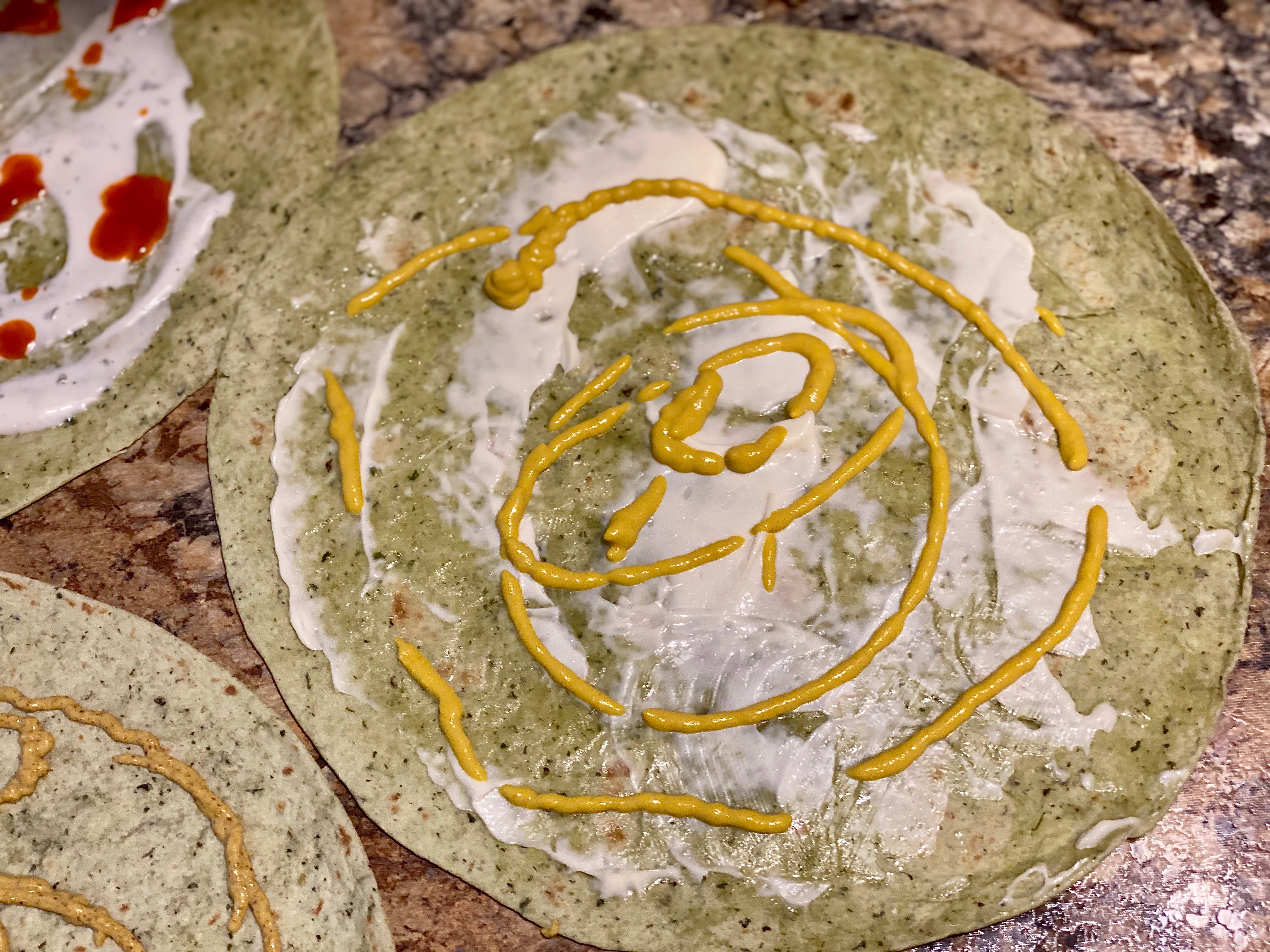 - Bottom right– A spread of good mayonnaise, then drizzled with yellow mustard.