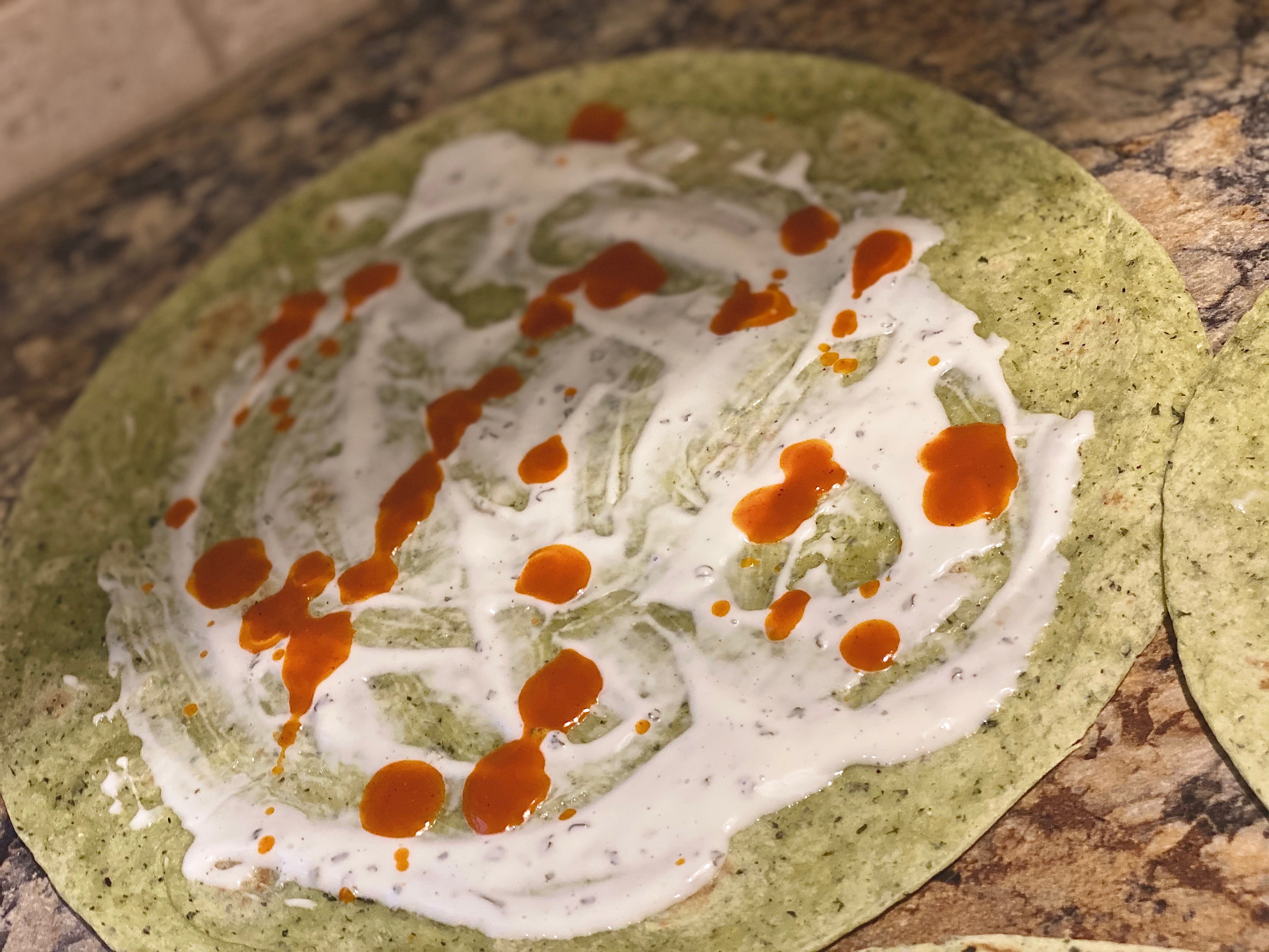 - Top middle- After the hot sauce I added buffalo chicken from the deli, and topped it with tangy blue cheese crumbles before rolling.