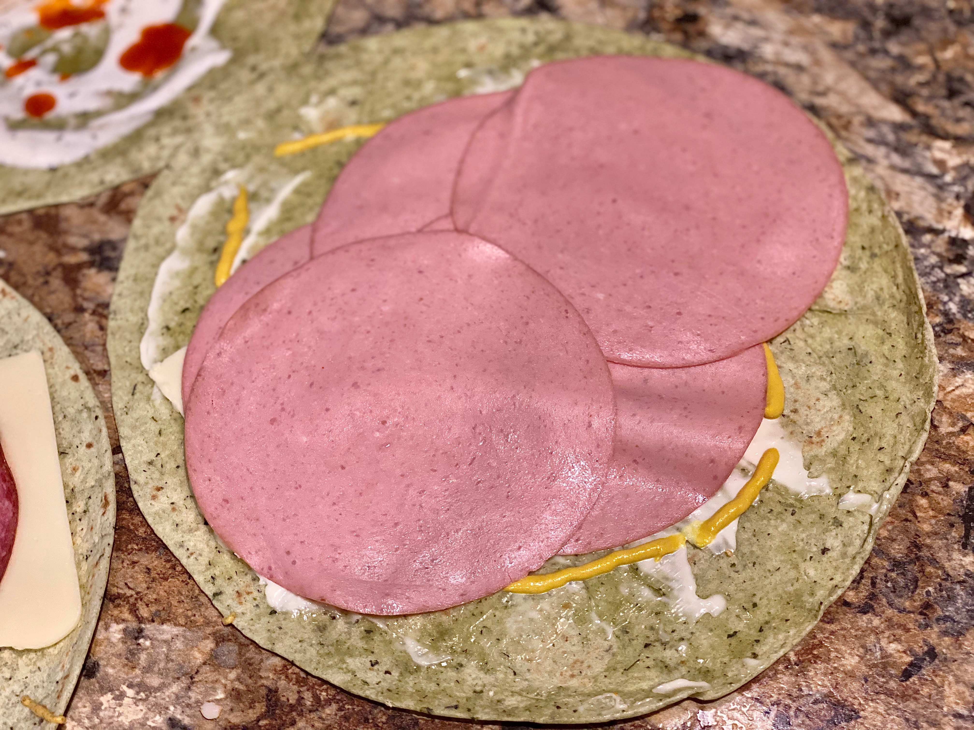 - Bottom right– On top of the mustard I added white American with slices of bologna.