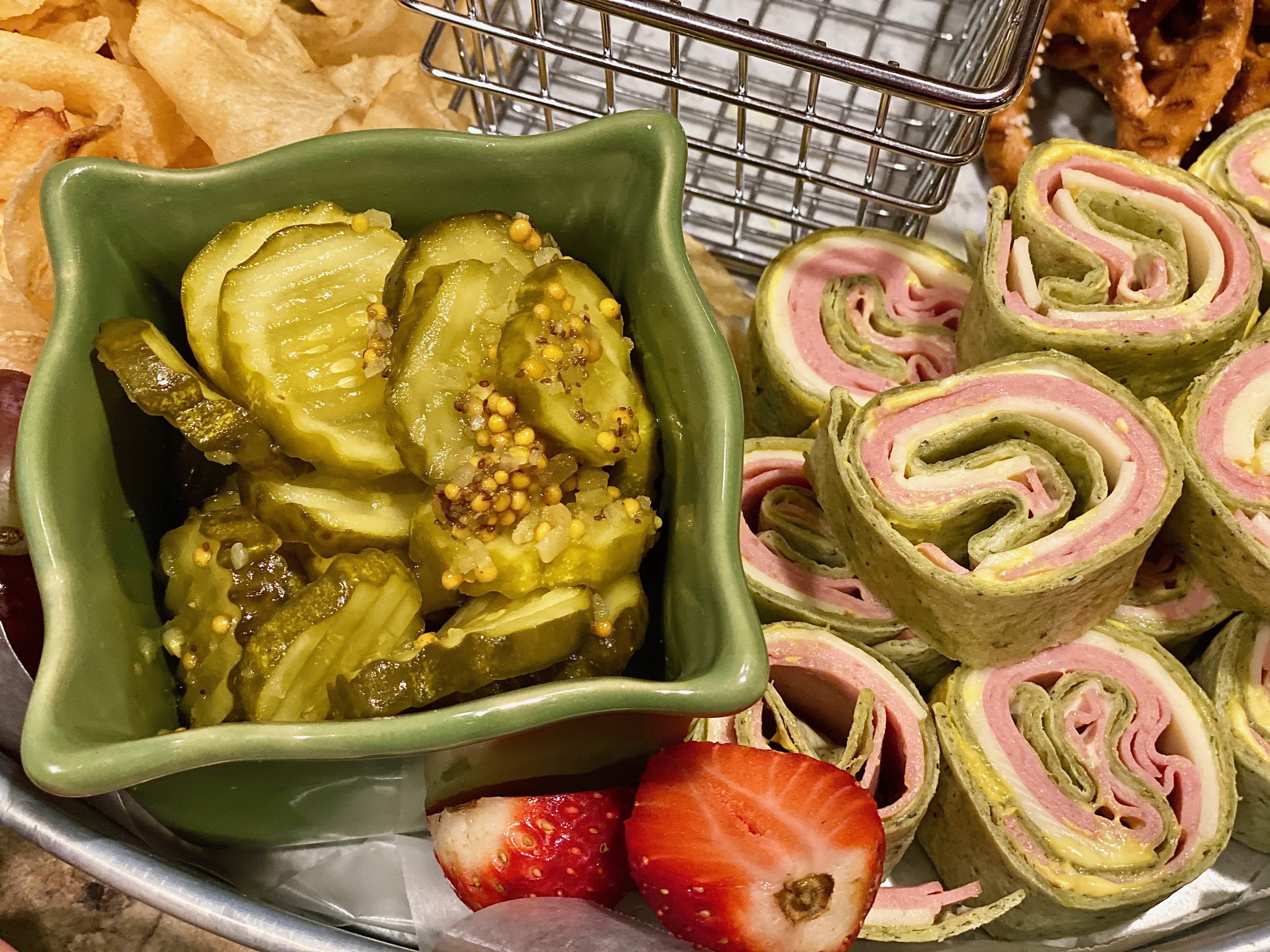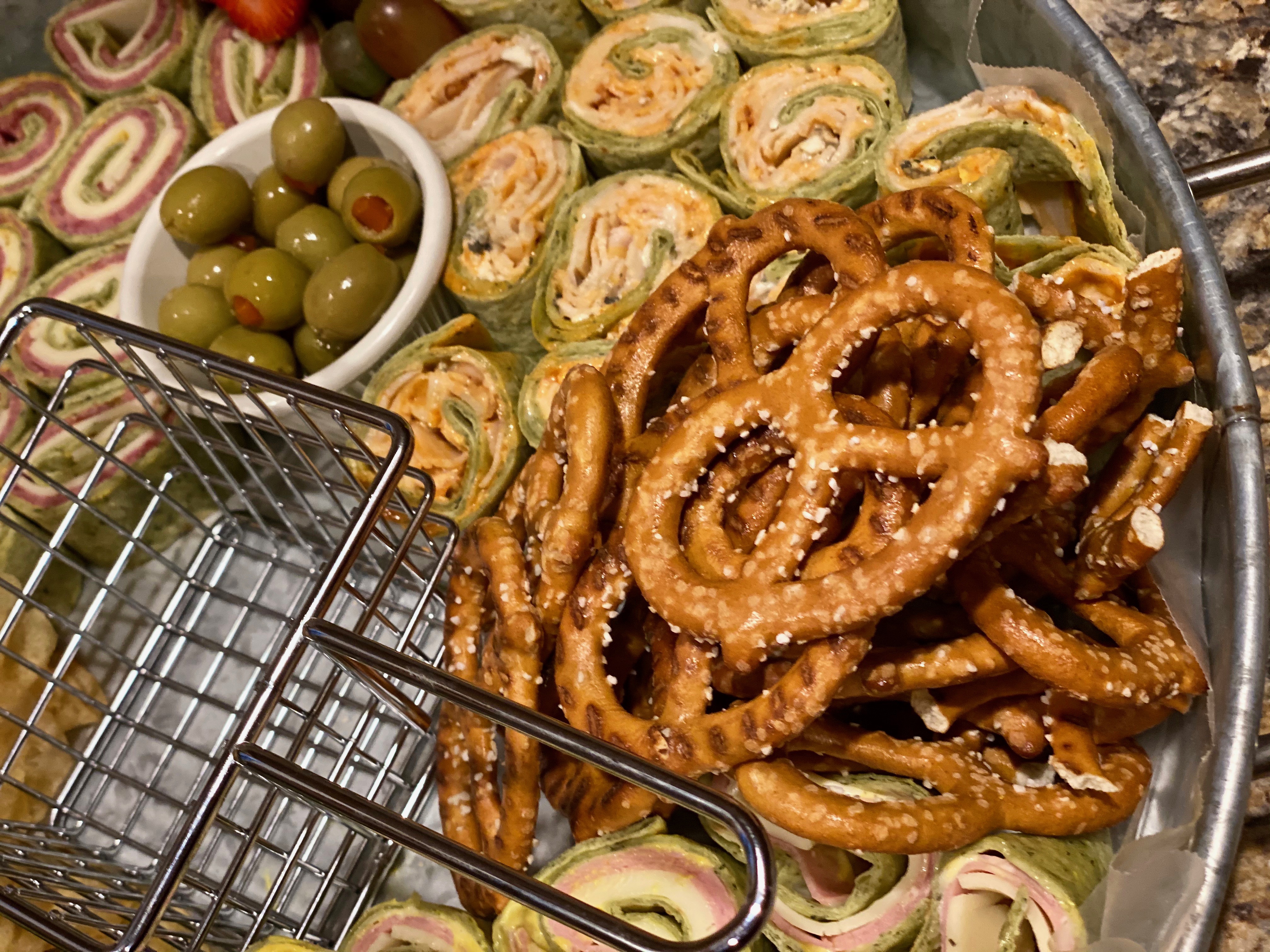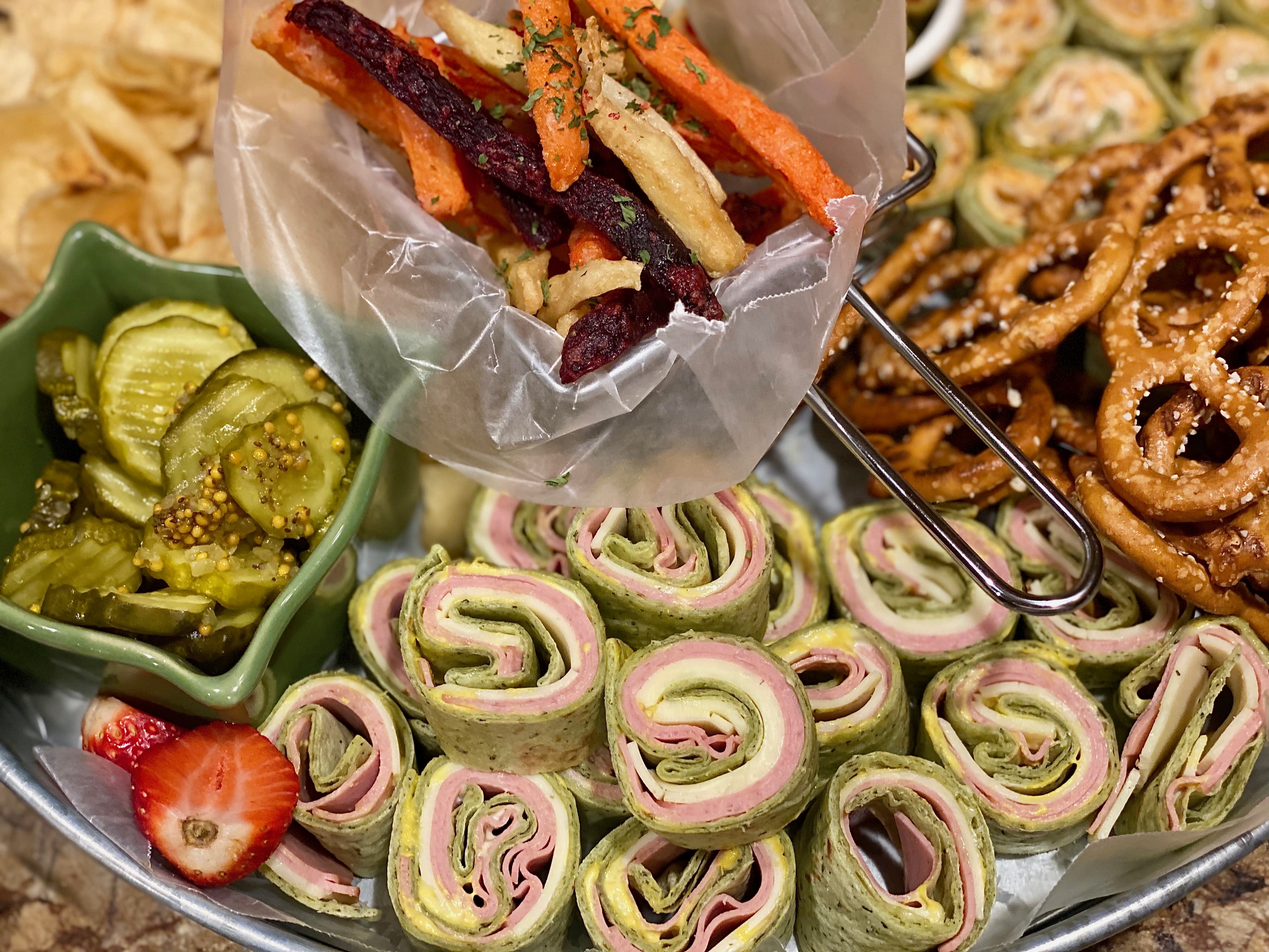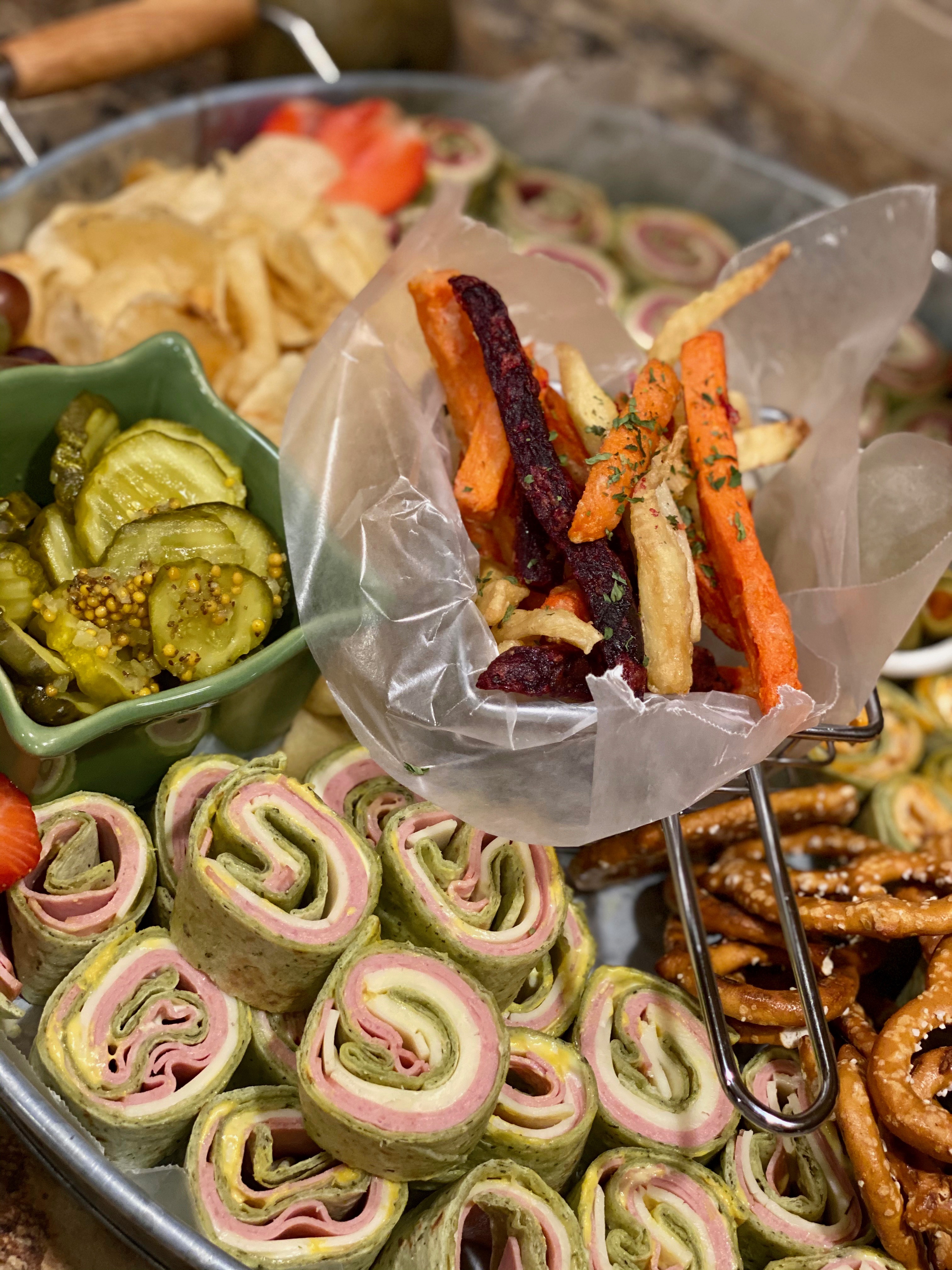 The arrangement before the fries arrived! I l enjoy placing the rolls sectioned off within their own flavors, across from each other. After piling the pinwheels onto the board, I decorated the platter with snacks that go extremely awesome with sandwich like goodies, and that of course has to be chips and pretzels. I chose plain sourdough pretzels, along with regular kettle cooked potato chips for that extra crunchy goodness.