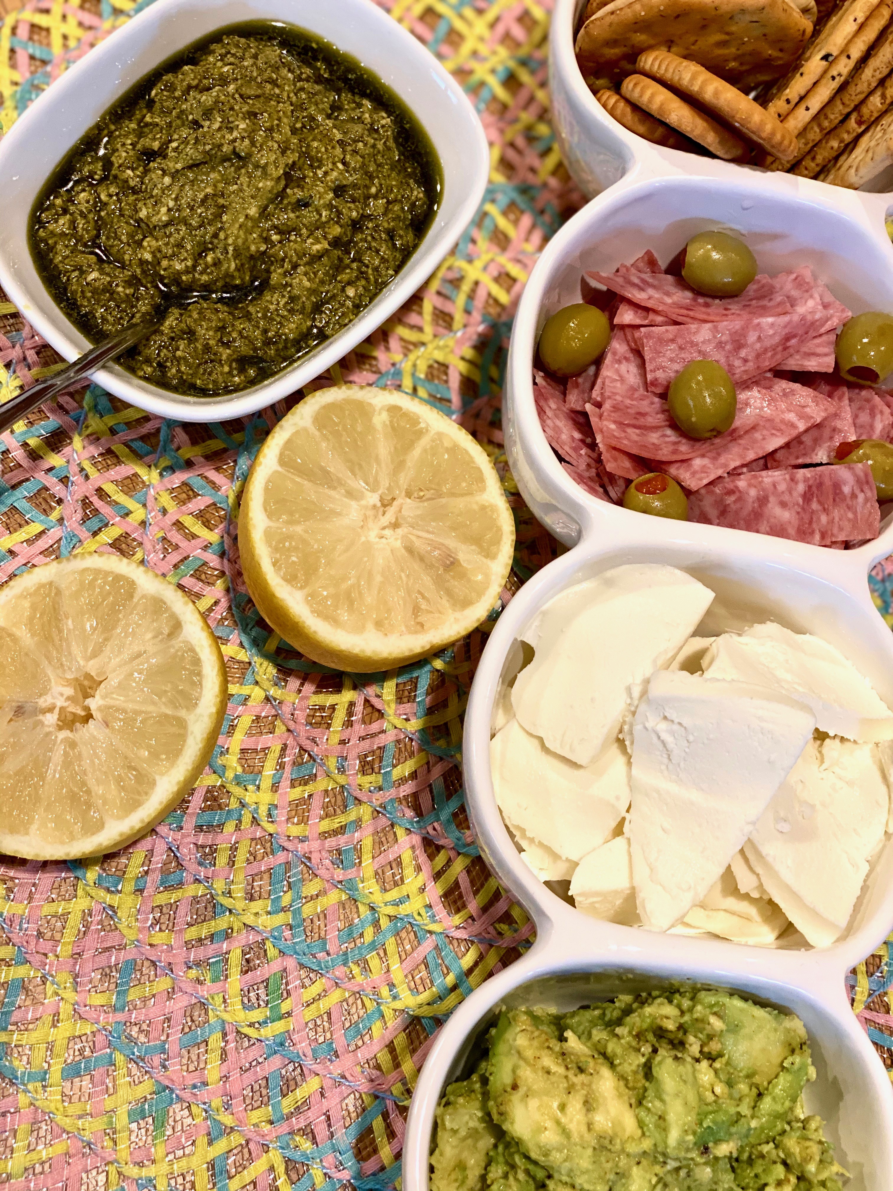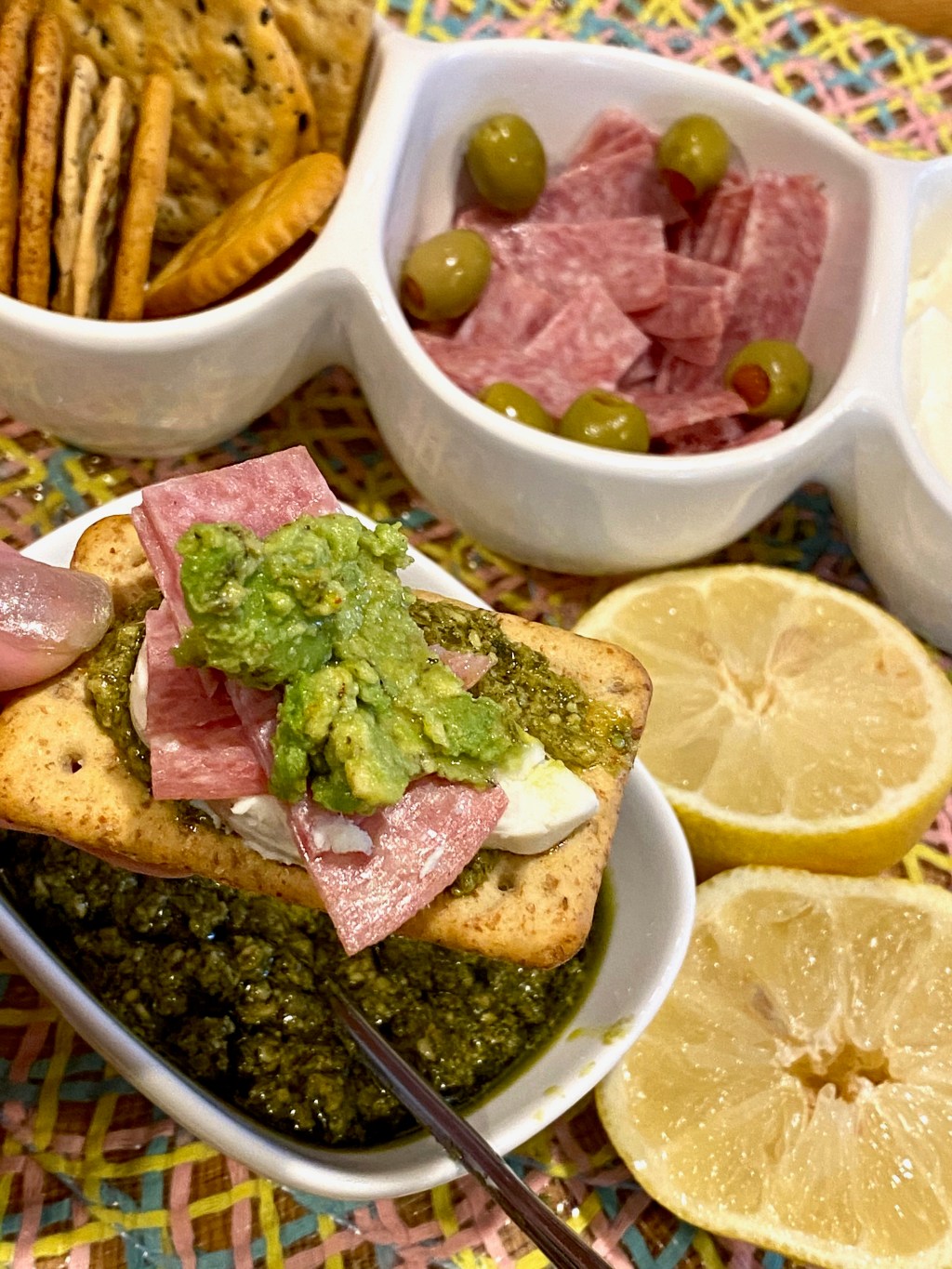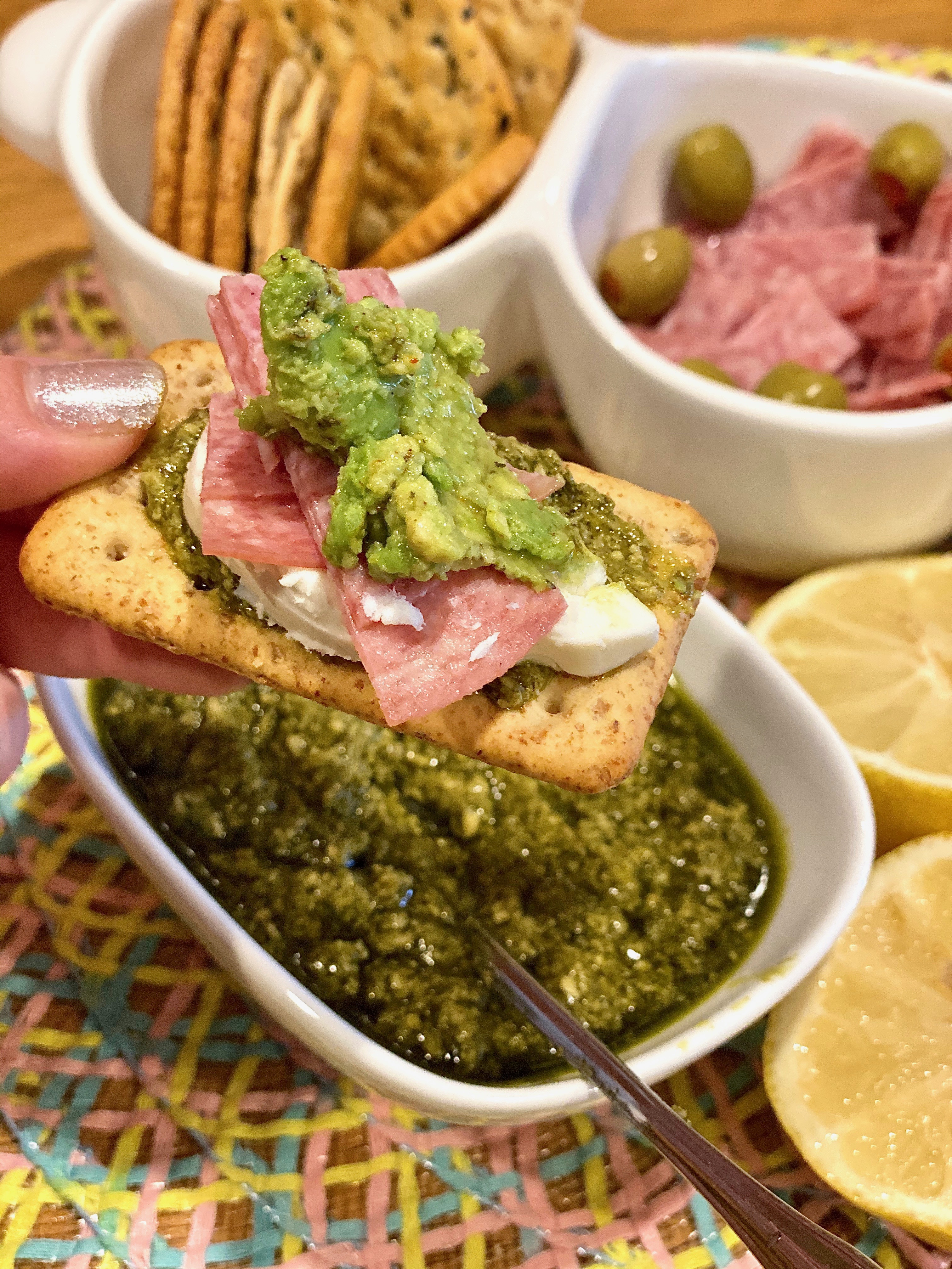 I have always been the type of person to try anything together, especially piled on top of a crispy, buttery cracker. Even more so, I love doing these things with cold food. I have such a love for experimenting with flavors that I adore, and seeing if they’ll work paired along with one another! Cold food is a passion of mine since it allows you to present things in such a way that no-one really see’s on a normal basis. Usually with these mini bites I use sopressata, but salami is something that’s always kept in my fridge. This crisp cracker topped with tangy pesto, salami & mozzarella, smothered with avocado, and finished with a light drizzle of lemon juice will just send your taste buds on a ride to Italy. I’m obsessed with little pick tray set ups like this because you can build the size of them however you want; with endless spreads, and toppings to please your household. Although.. when the world gets back to normal after all this craziness, this will be perfect to spread across your island in the middle of your kitchen to have everyone munch on while they’re having happy hour!
