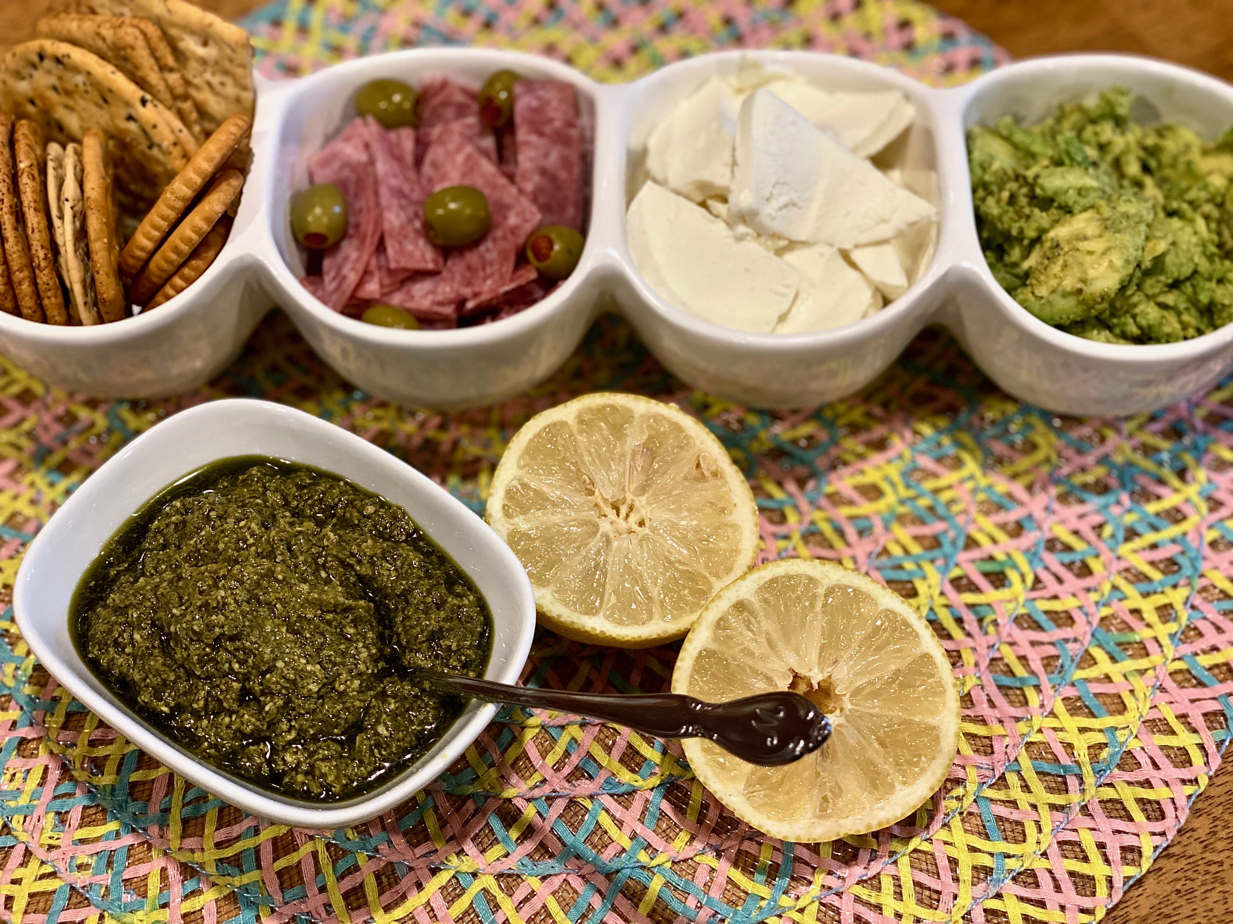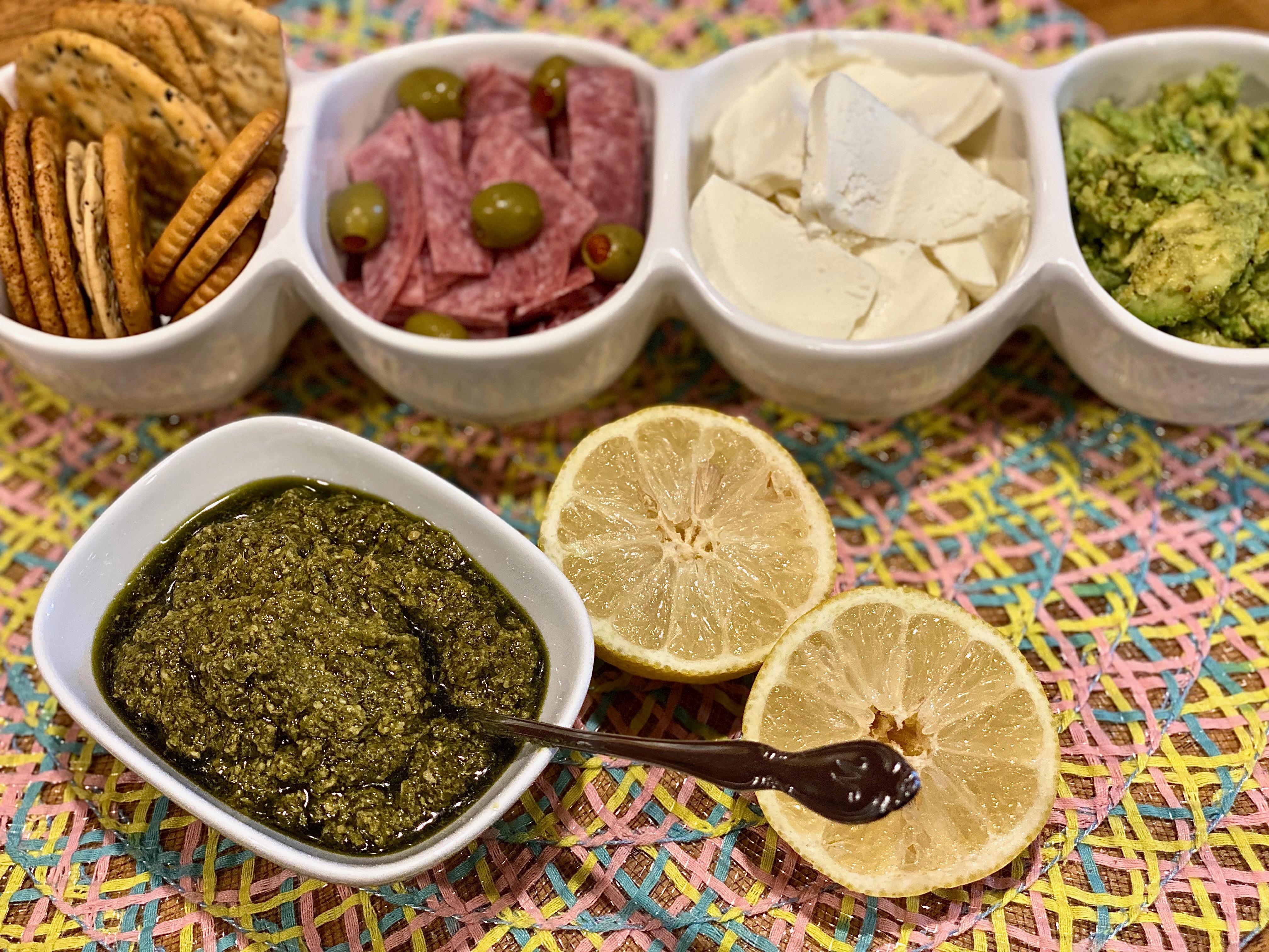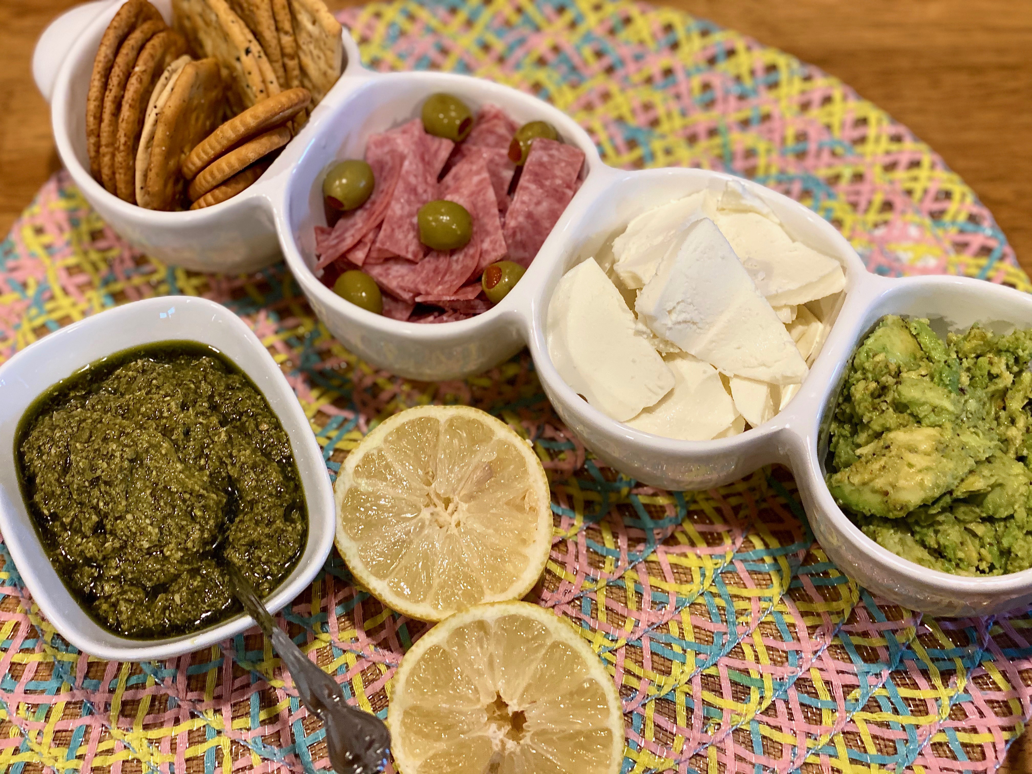 I have always been the type of person to try anything together, especially piled on top of a crispy, buttery cracker. Even more so, I love doing these things with cold food. I have such a love for experimenting with flavors that I adore, and seeing if they’ll work paired along with one another! Cold food is a passion of mine since it allows you to present things in such a way that no-one really see’s on a normal basis. Usually with these mini bites I use sopressata, but salami is something that’s always kept in my fridge. This crisp cracker topped with tangy pesto, salami & mozzarella, smothered with avocado, and finished with a light drizzle of lemon juice will just send your taste buds on a ride to Italy. I’m obsessed with little pick tray set ups like this because you can build the size of them however you want; with endless spreads, and toppings to please your household. Although.. when the world gets back to normal after all this craziness, this will be perfect to spread across your island in the middle of your kitchen to have everyone munch on while they’re having happy hour!