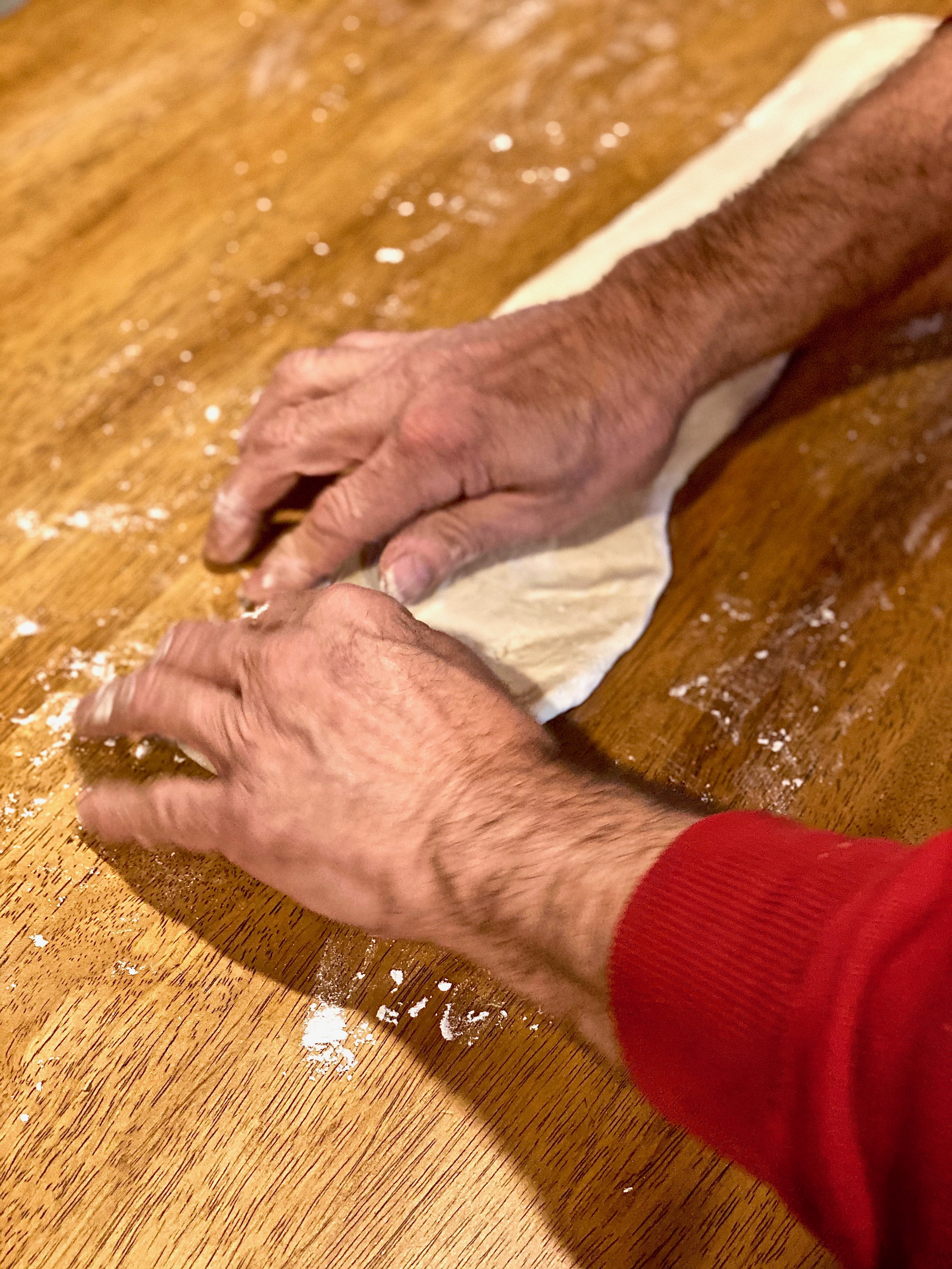My dad and I took turns trying to stretch the dough out because when pulling/lengthening the sides you must make sure you have enough room for all the ingredients you want to add, while being careful you’re not ripping the dough. Once you create those accidental holes in dough, they’re very hard to close for good again.