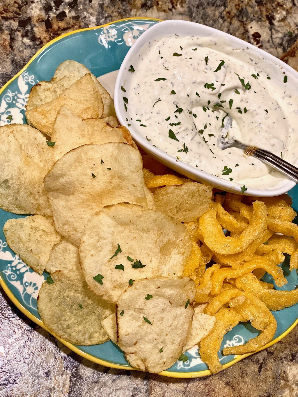 - I thought this was the perfect opportunity to decorate the plate with “onion rings” and some unsalted chips. Yes, I did say unsalted. For all you salt lovers out there, you can surely grab the saltiest chips you have to dunk into the dip, but for me I don’t need the salt since we are pairing it with the salty dip!