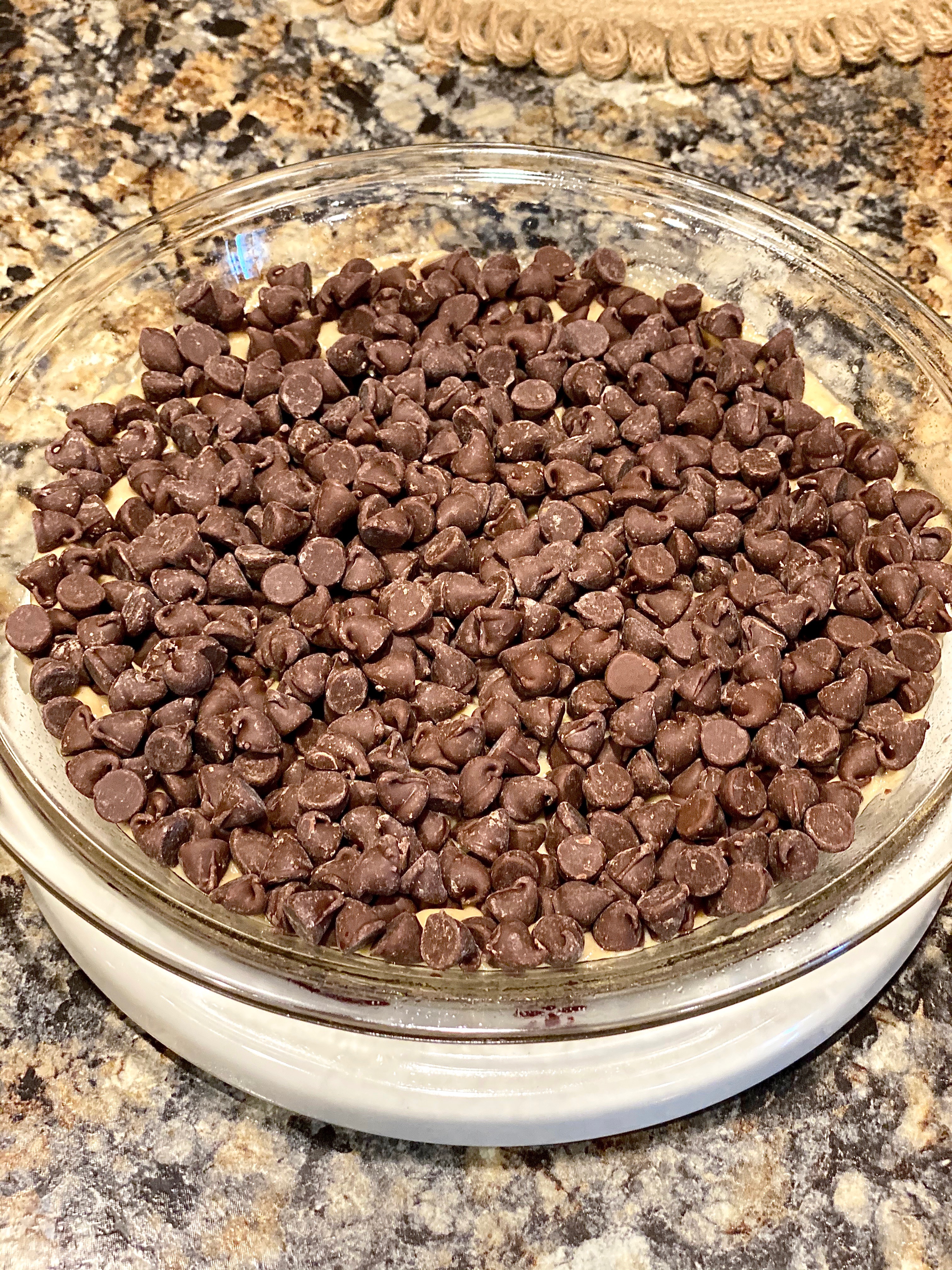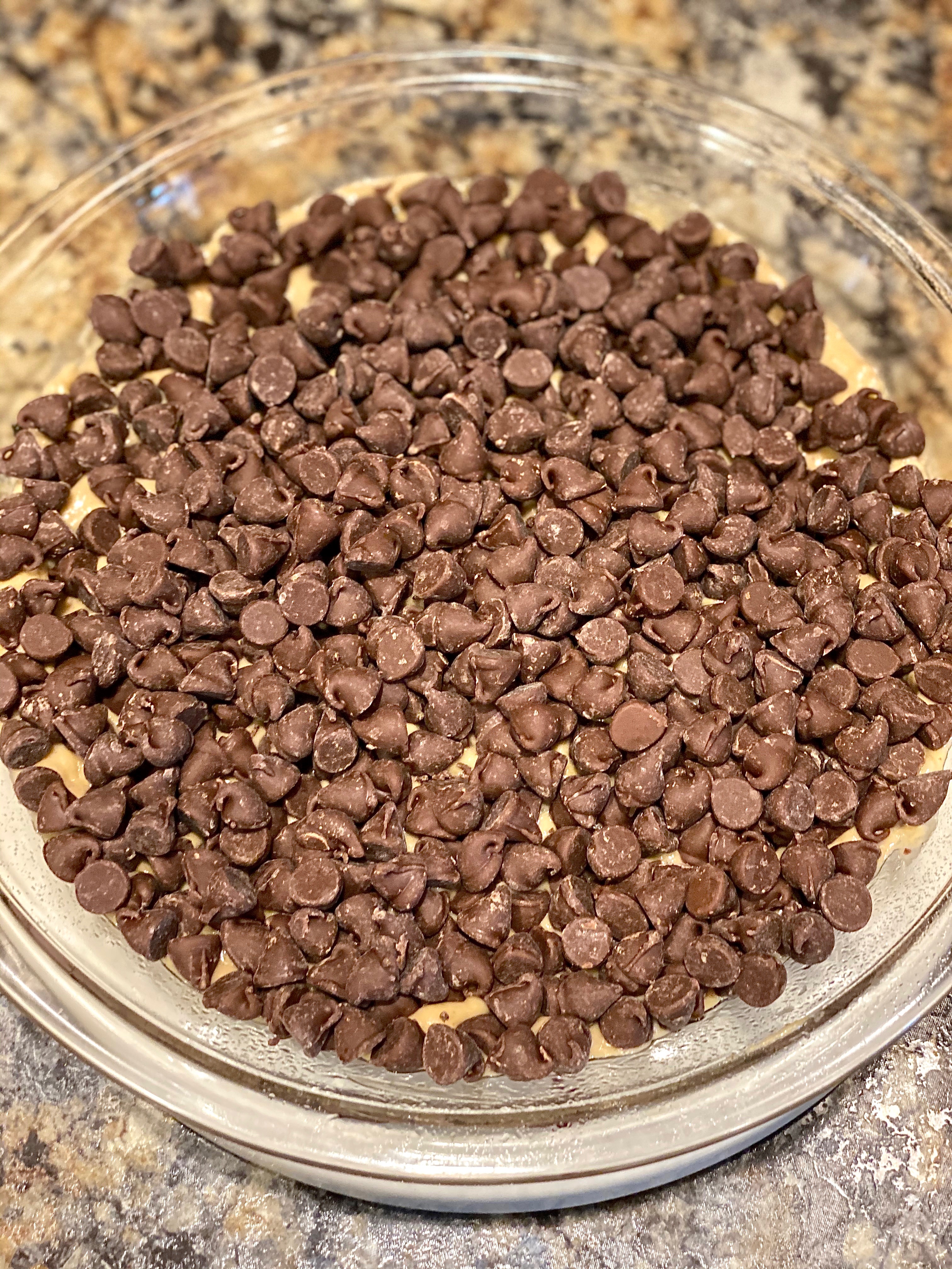For all you chocolate lovers out there.. this is the fun part! Pour an entire bag of milk chocolate chips all over the peanut butter and banana filling. Make sure you do use milk chocolate, and not semi-sweet or dark chocolate chips. Classic s’mores are piled together with a piece of milk chocolate, melting in between the marshmallows and graham cracker, so we want to replicate that smooth, irresistible taste! If you would use another kind of chocolate it’s going have a much more bitter taste, and you want this dip to be super sweet, but not overly sweet; which is why we aren’t using white chocolate either!