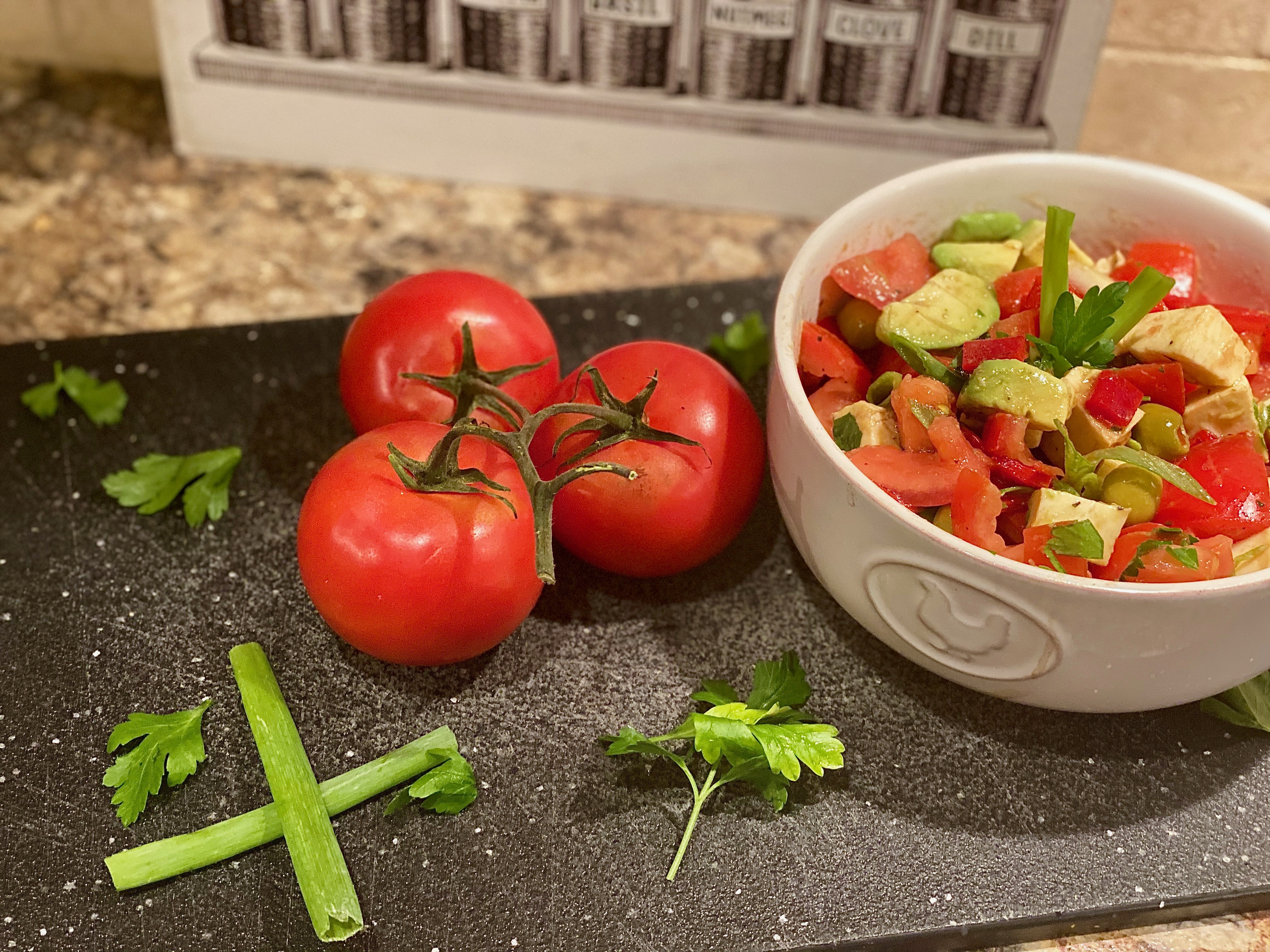 - I started out classically by just chopping up three garden tomatoes.