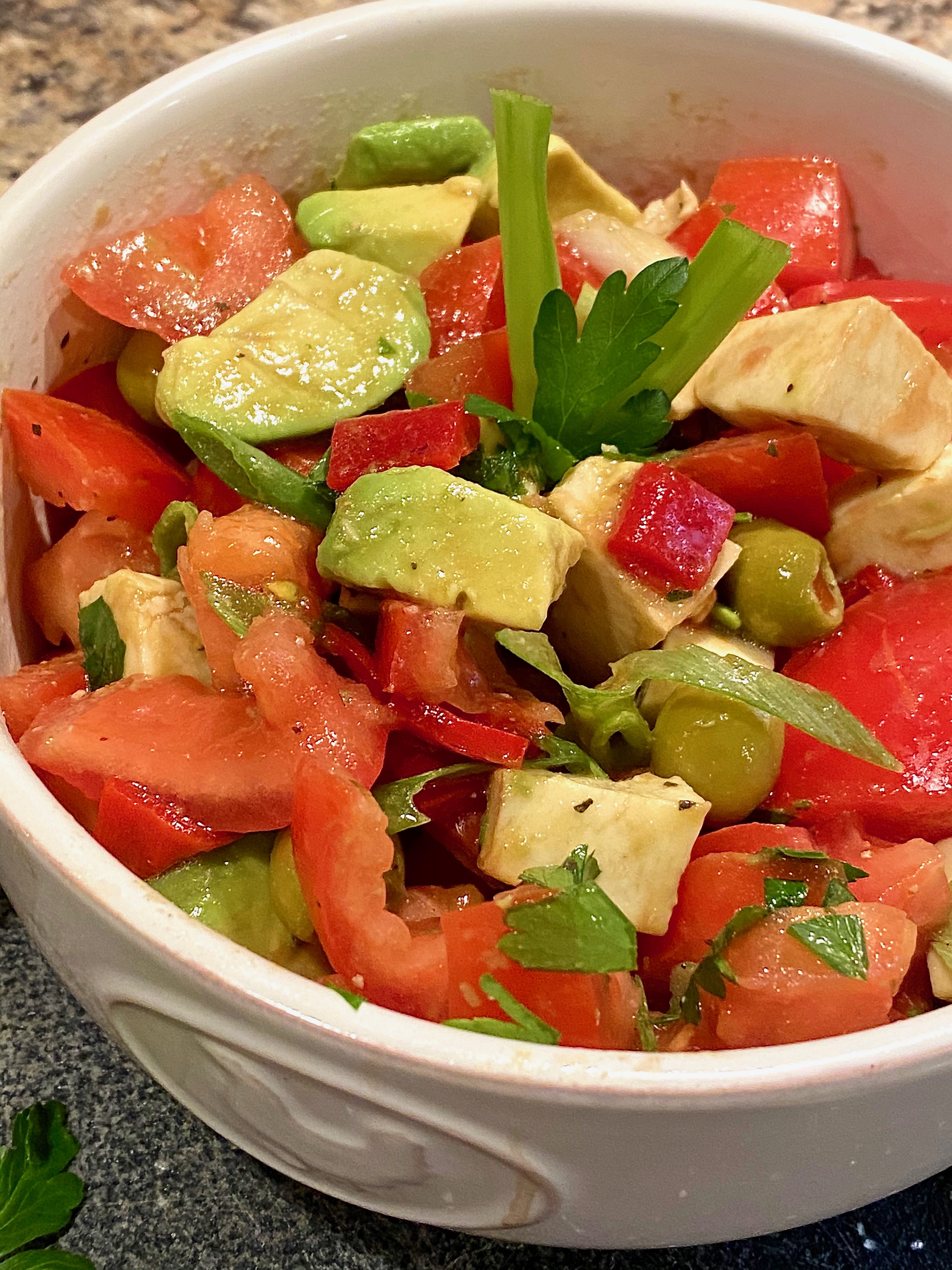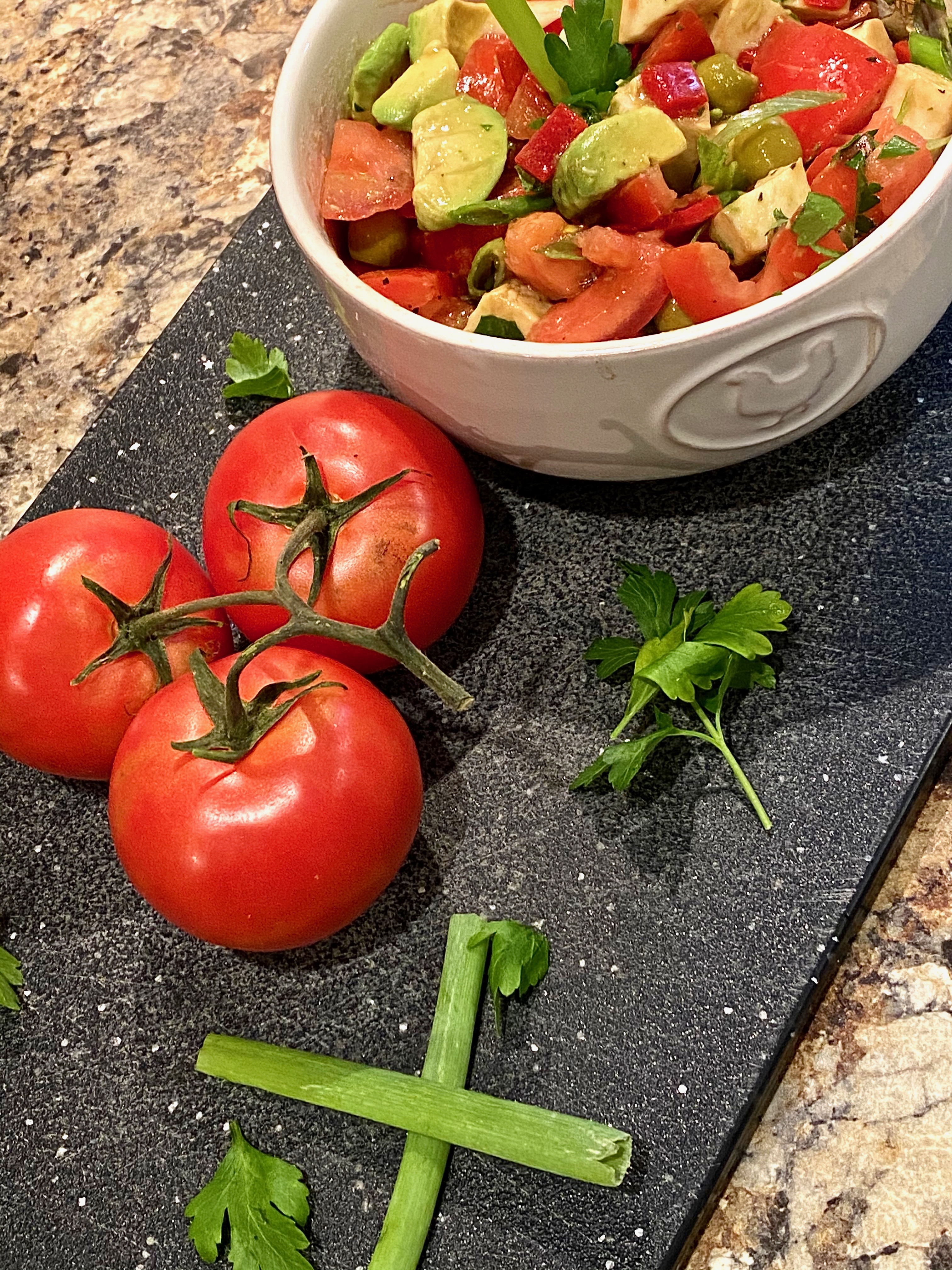 These next few steps are the steps that are going to make this caprese summer salad, deluxe edition! Once you have everything chopped up in the bowl, mixed all together with the oil and vinegar, toss in some briny green olives, small diced roasted red peppers (they go extremely well with mozzarella cheese), thinly sliced scallions, and chopped fresh parsley, to tie everything together! I always finish plating with herbs. Whether I have fresh, or dry on hand, it does not matter to me. Finishing, and garnishing with herbs is quite the experience for eating with your eyes, and also to enhance the flavors when you do go in, and experience the taste yourself.