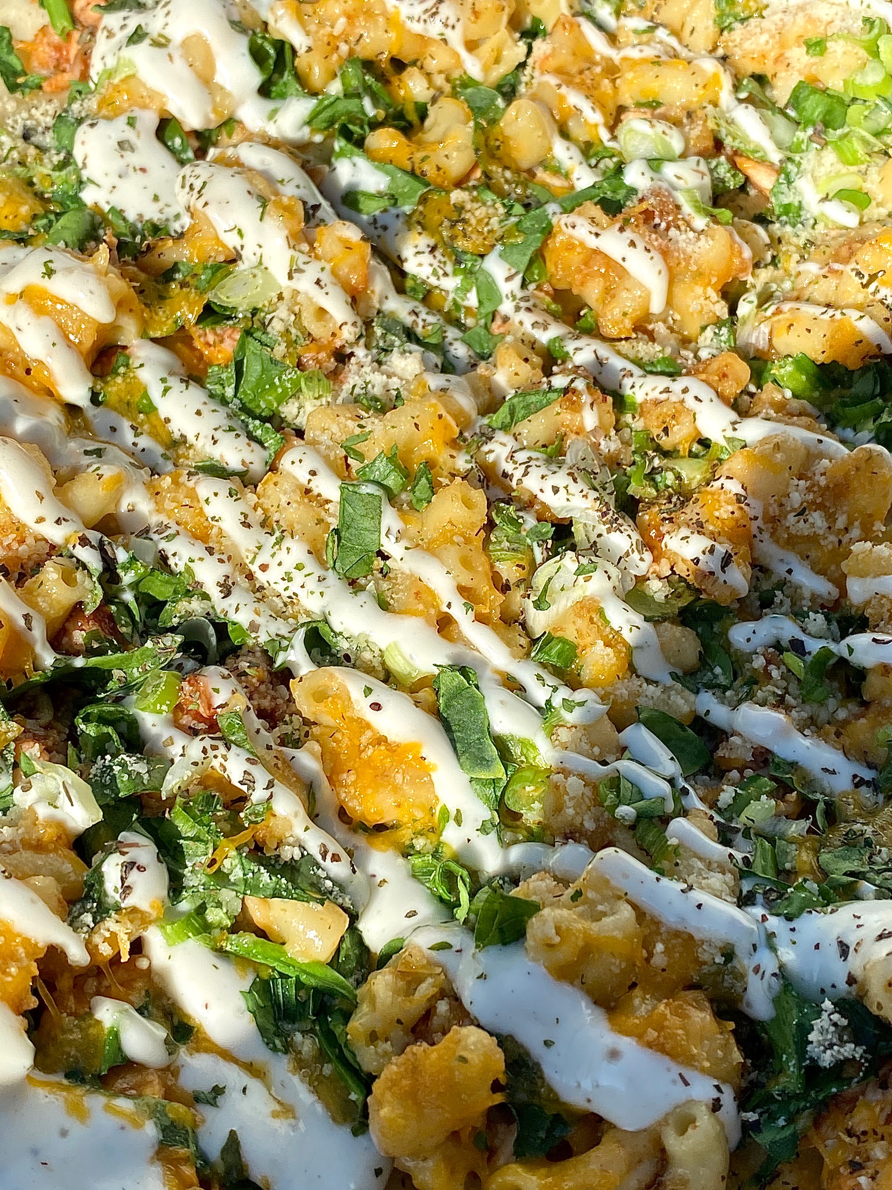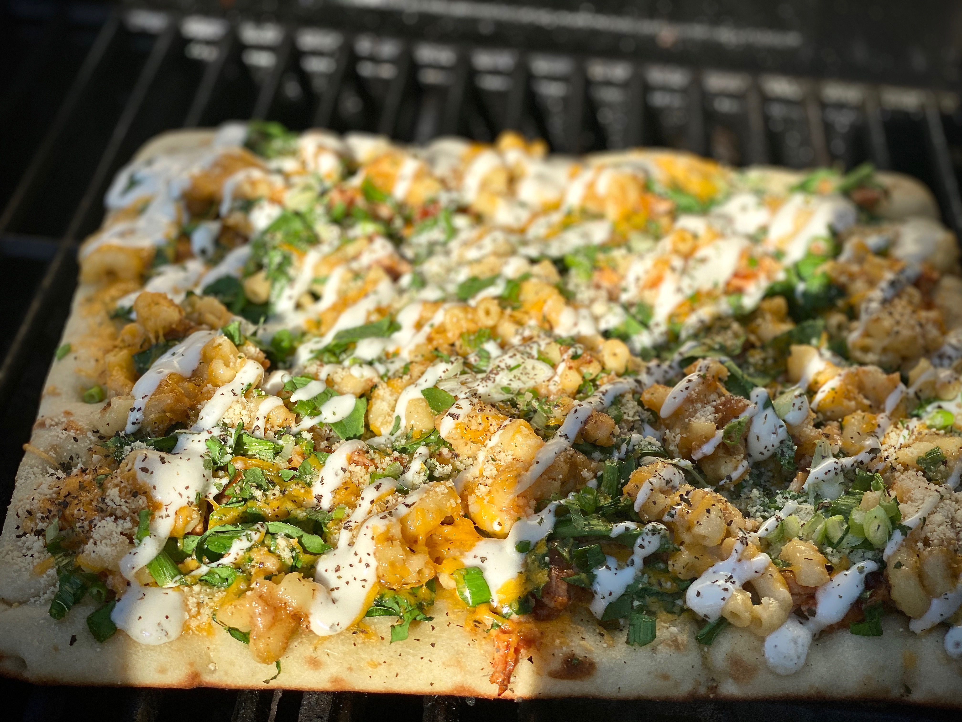 Barbecue chicken and macaroni & cheese Naan flatbread, drizzled with ranch for that extra ZIP!