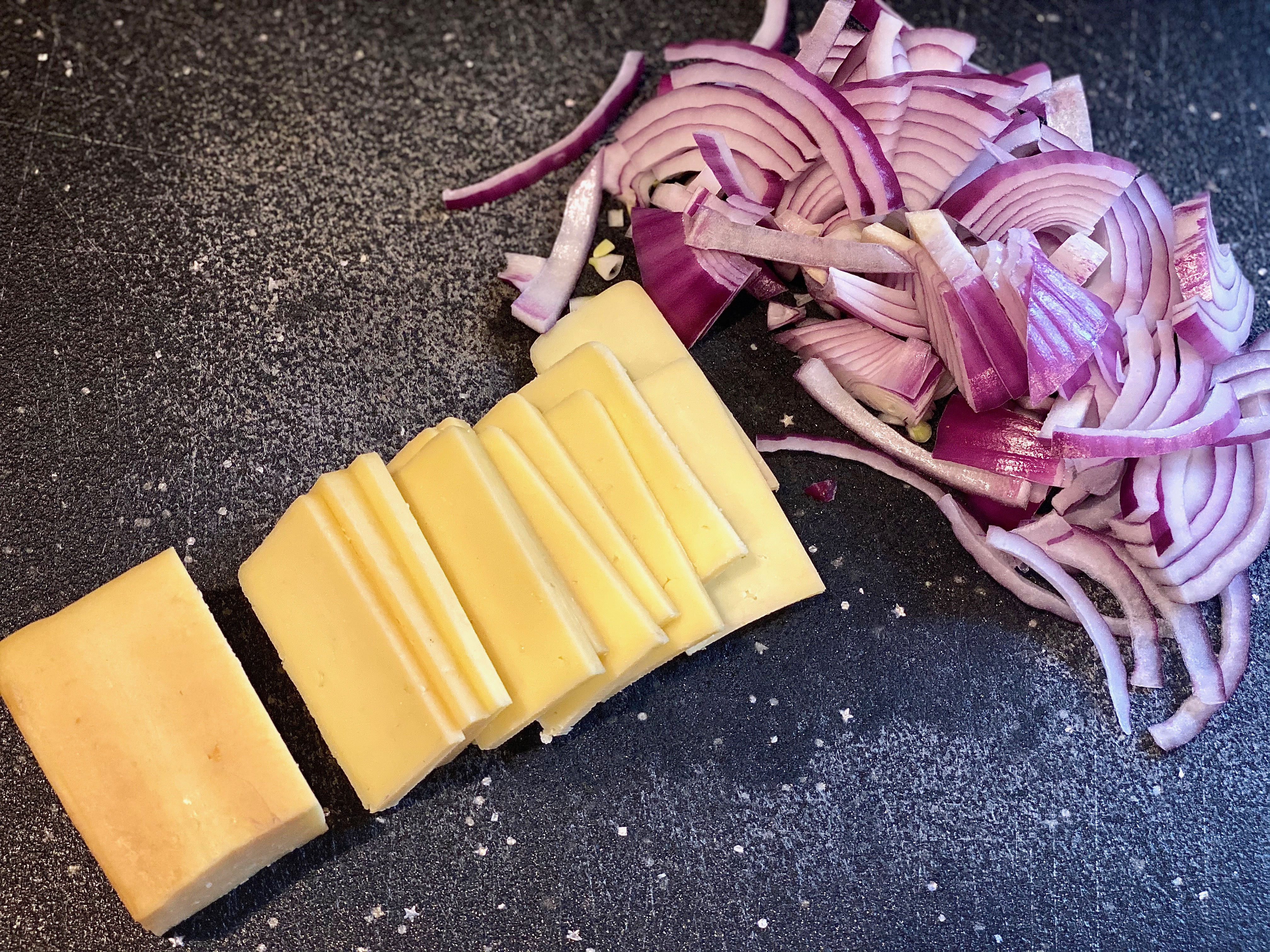 While you are letting the burgers set, you can go ahead and cut one small red onion, or multiple depending on how much you need, or want. You’ll want to also slice your smoked gouda cheese. Even if you don’t love this cheese with a cracker, you will adore it melted over top of this scrumptious, caramelized burger.