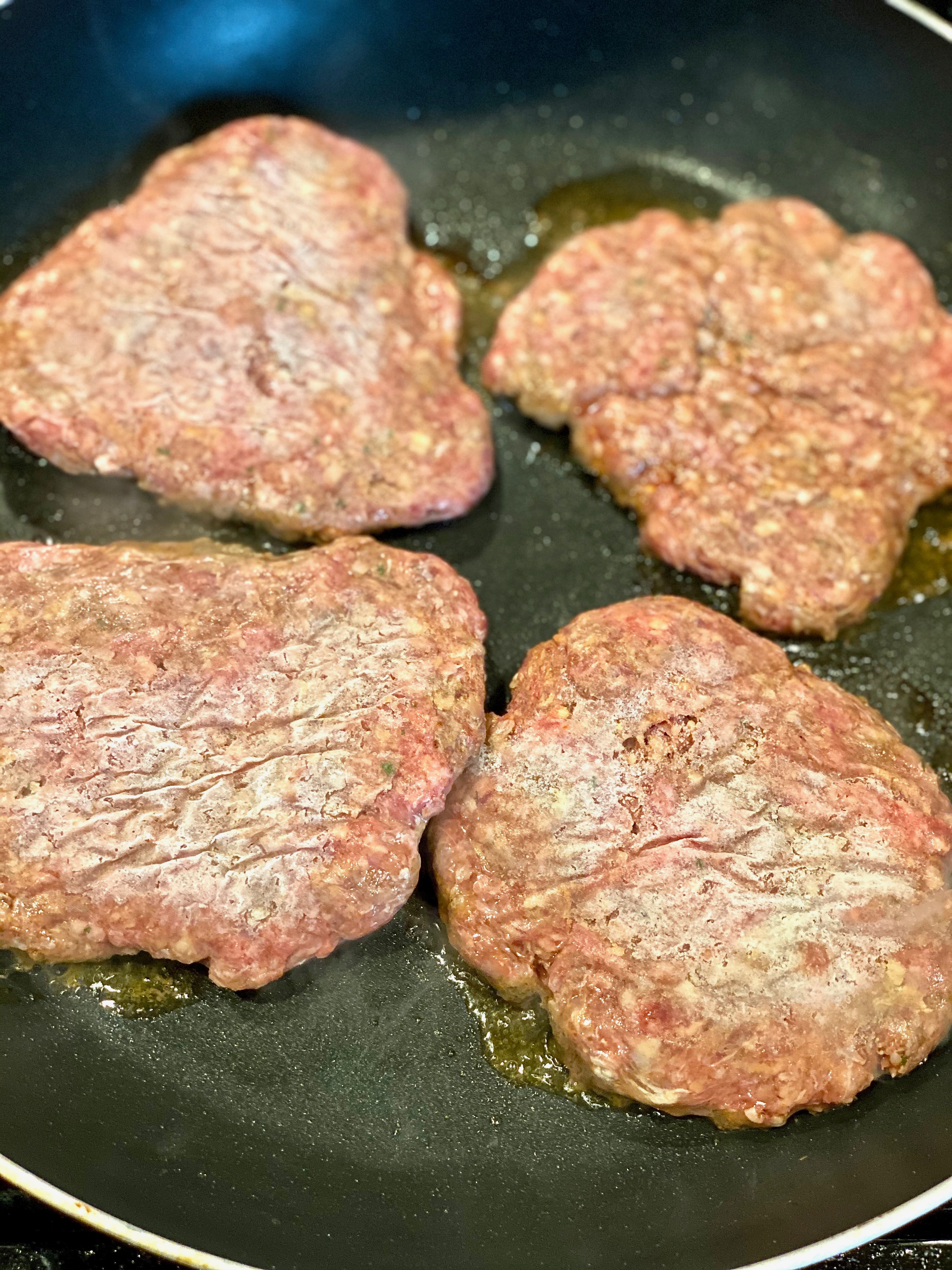 As I said before, if you’re taking the adorable things out to the grill, go right ahead! I turned a huge sauté pan up to medium-high heat, sprinkled with olive oil, and placed four patties inside. Cook the burgers on each side for 3-5 until they are browned, and slightly charred in certain areas. That’s when you know they are going to be incredible when you get that hit of crispiness in your burger bite!
