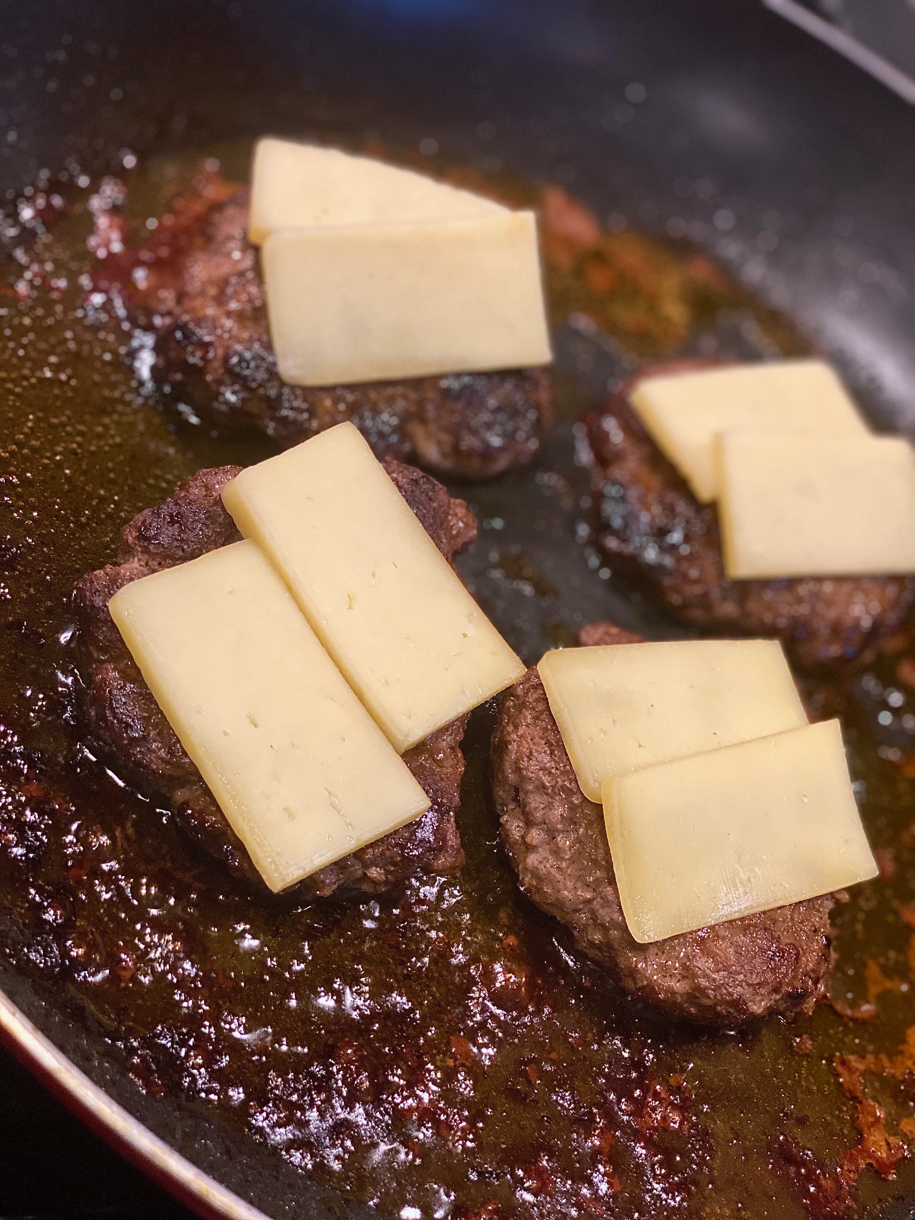 When you have about two minutes left of cooking on the last side, place the gouda cheese over each individual patty so that the gouda burgers can bring themselves to life!