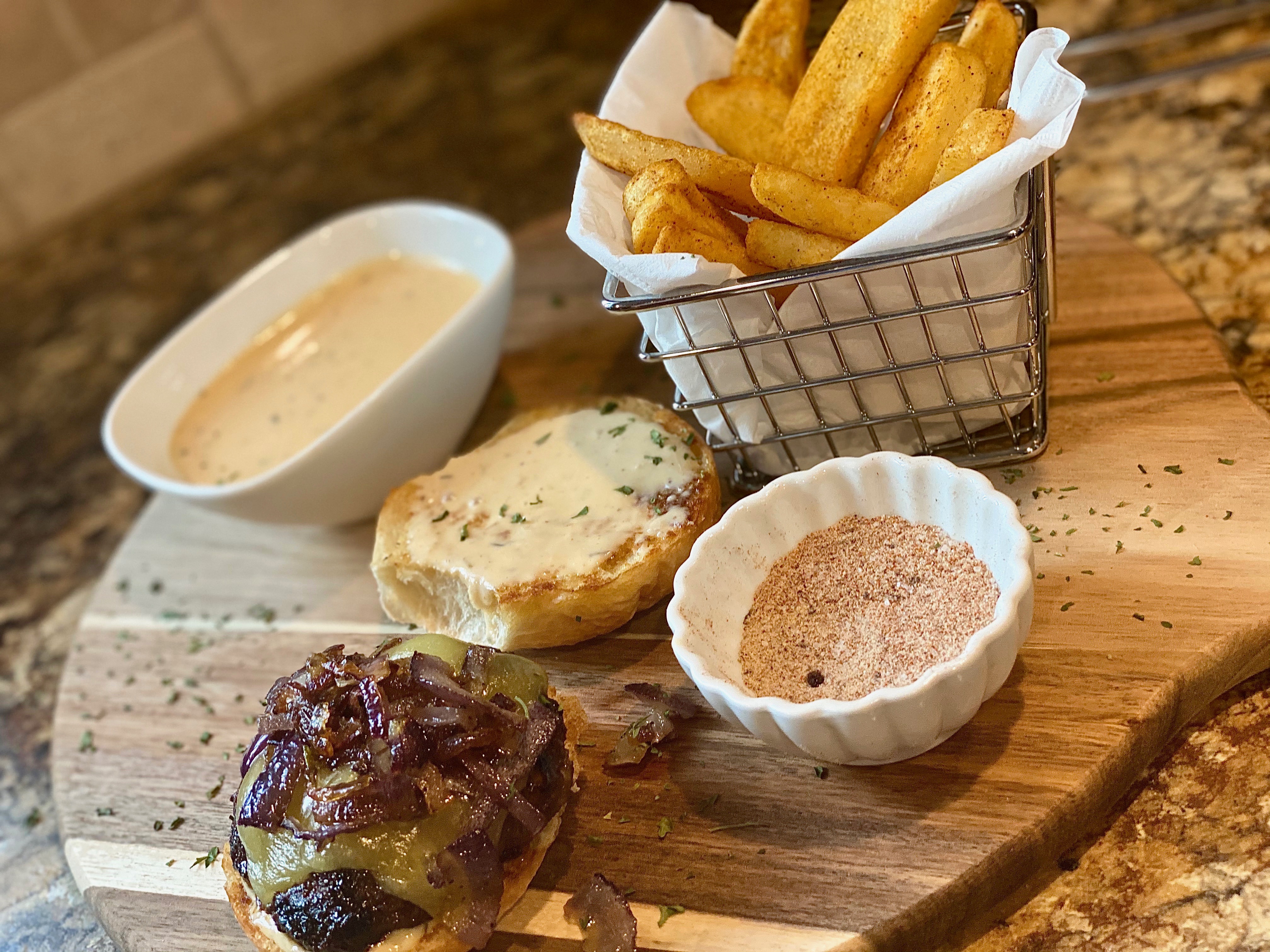 You can serve these smoked gouda cheese and caramelized onions burgers with anything you’d like, but seasoned steak fries are ultimately where it’s at with these puppies! This fry and seasoning combination compliments the smoky flavors so insanely well, so you’ll definitely be missing out if you don’t give this a shot! Aside from the fries, the most important missing puzzle is the creamy, dreamy, tangy dijon, and horseradish aioli. It is decadent, and literally makes your taste buds wanting more, so it ends up being iconic for dipping those fluffy fries into!
