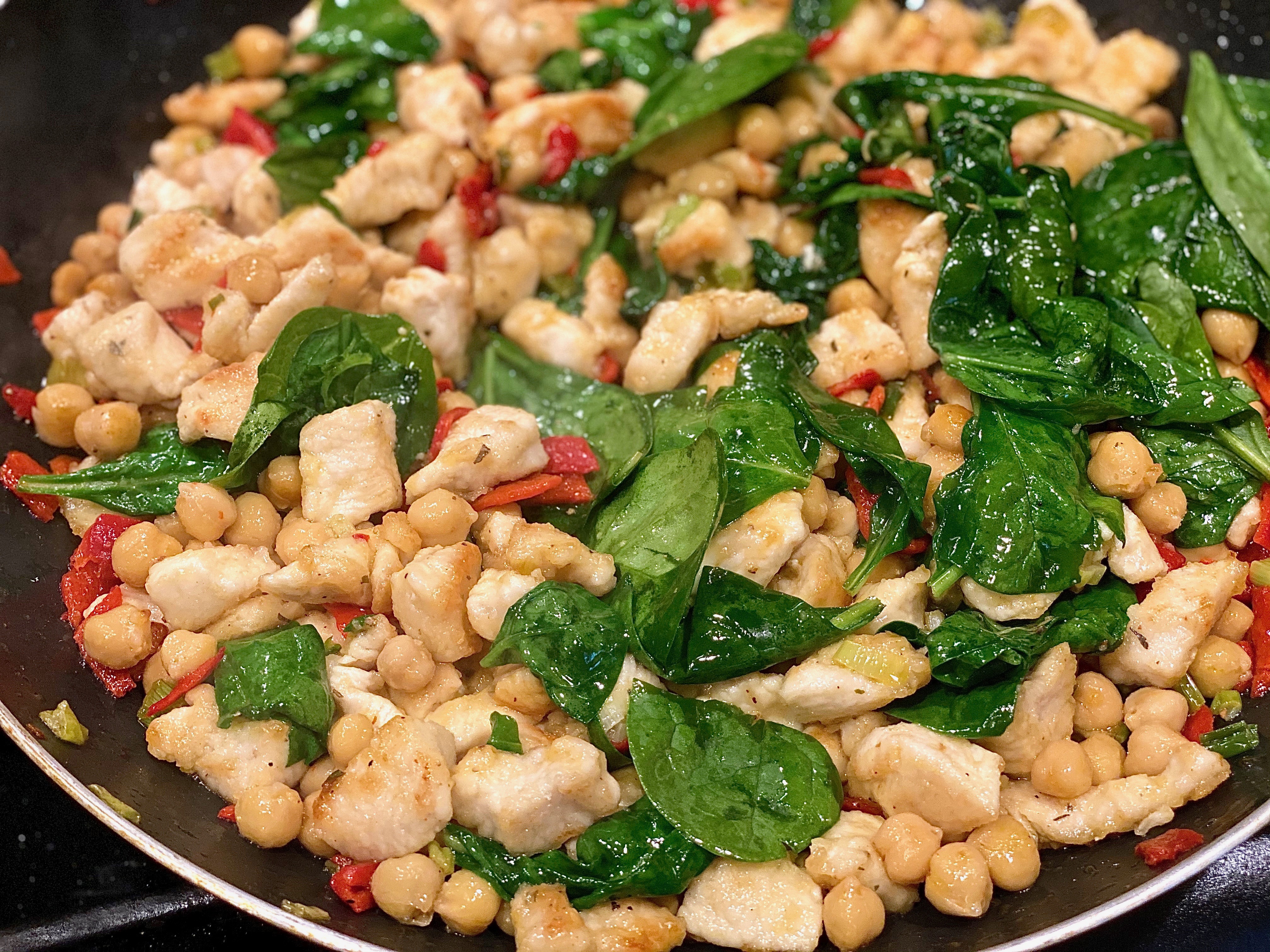 Once everything in the pan begins to get translucent, and the chick peas start turning color, throw the chicken back into the mix!
