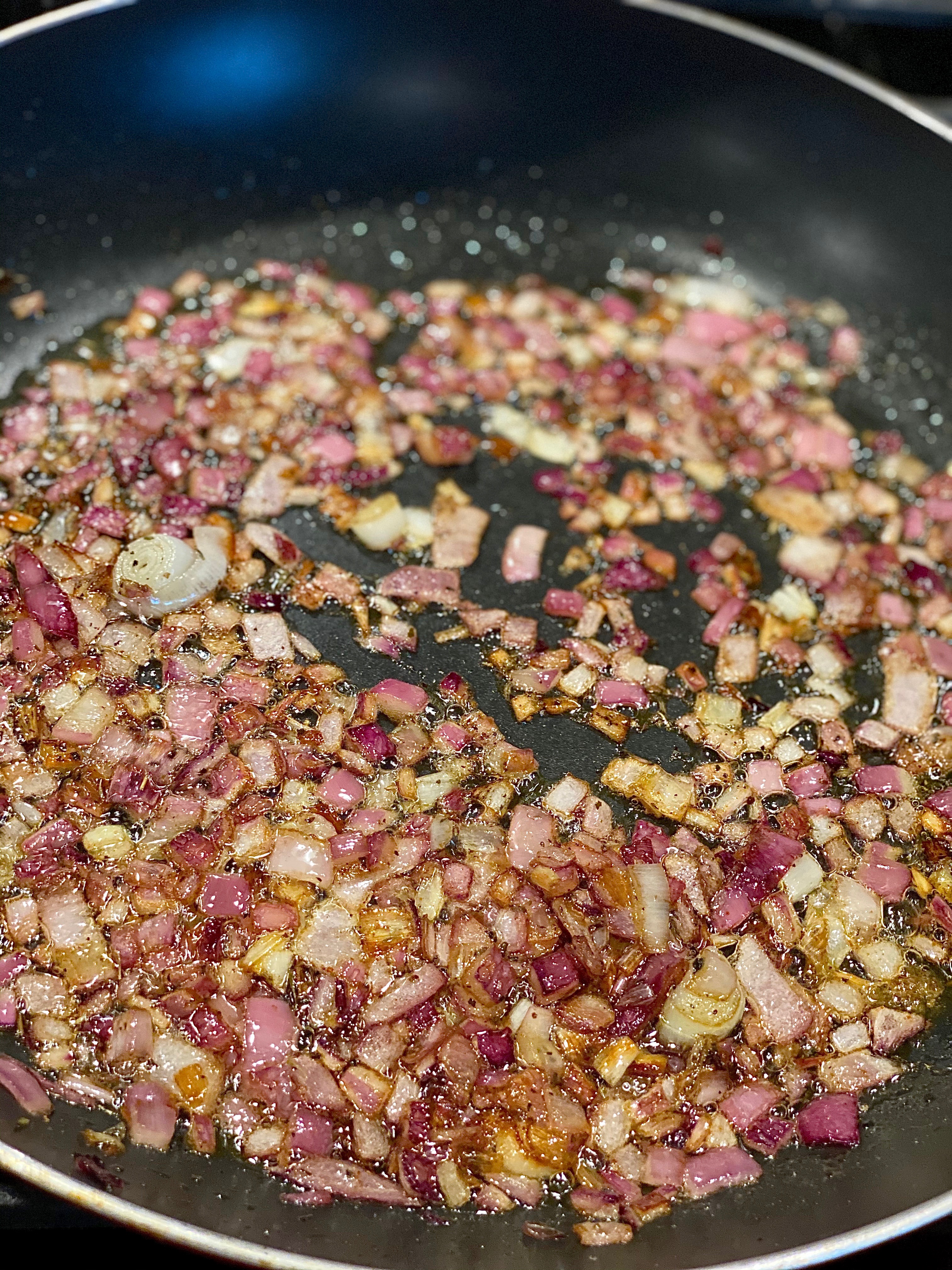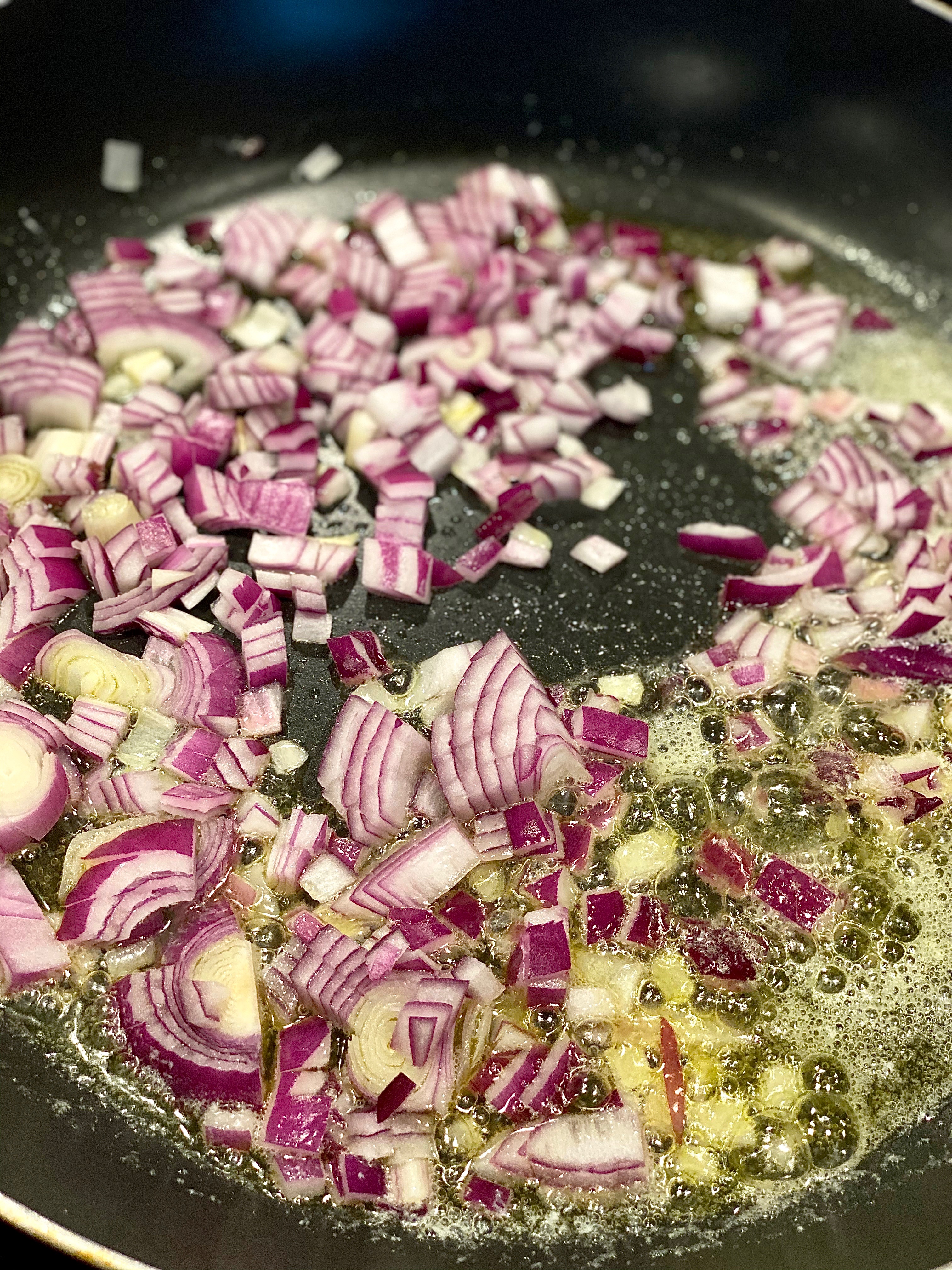 - Once the butter is melted, and begins to bubble.. add in one small diced red onion for extreme flavor on medium high heat. This onion is the key to a bit of sweetness, and big flavor to our entire pasta dish!