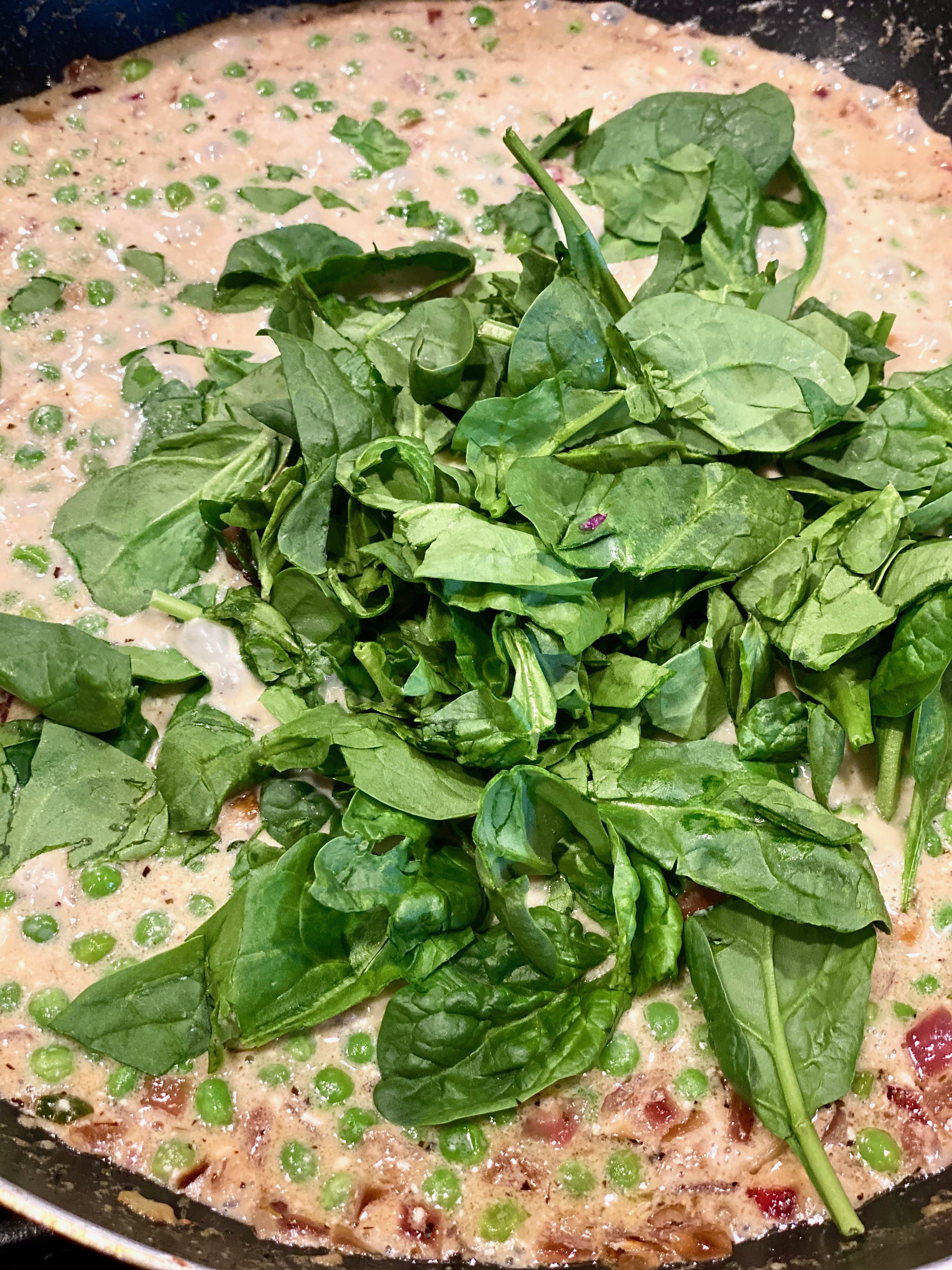 For some nutrition and more color.. I tossed in two handfuls of spinach, and just let that wilt into the rest of the mixture.