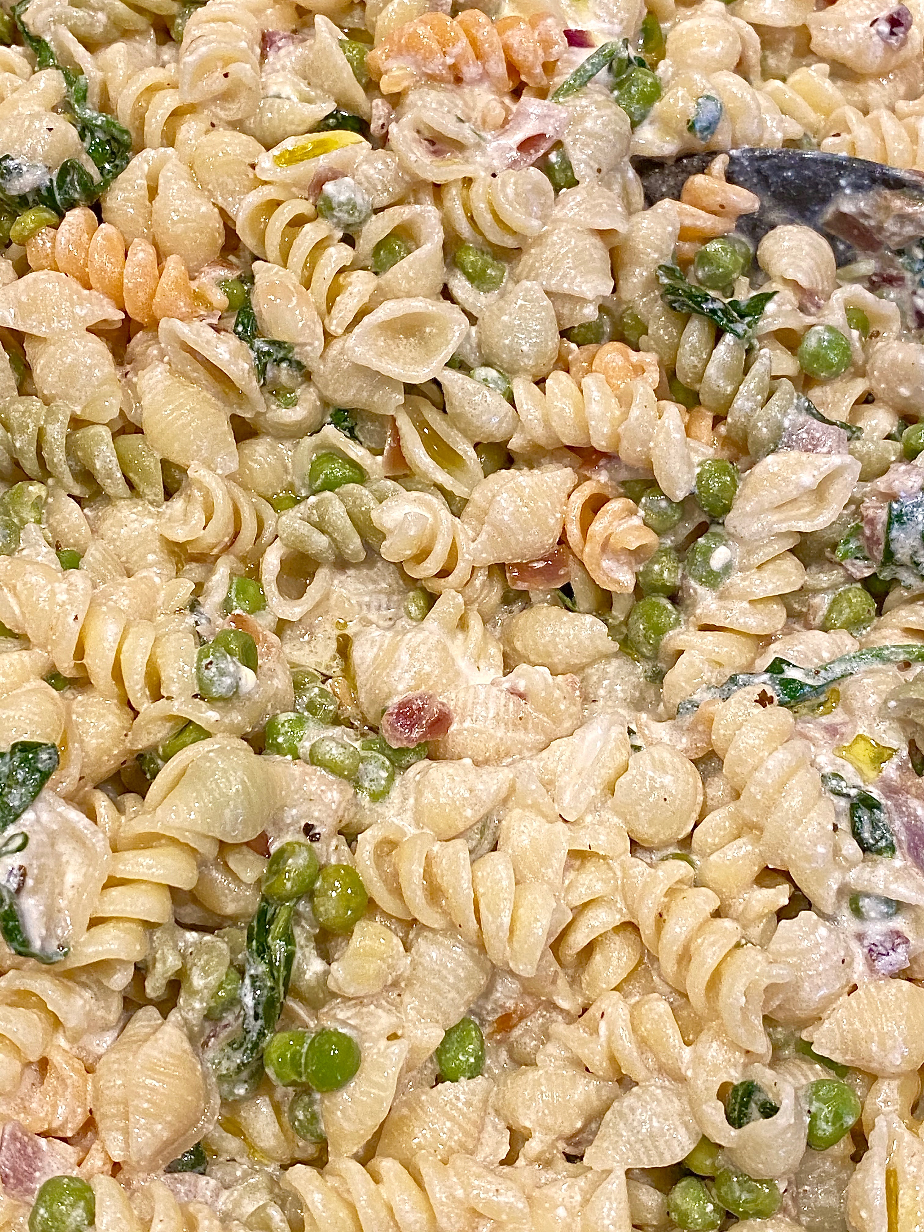 I threw in an entire bag of frozen peas. You could do fresh, or frozen, but definitely skip out on the ones that come from the can for this particular dish. I do love them truthfully which I know some people are so grossed out by them, but they’re just nostalgic to me, but for this macaroni and cheese they would be way too mushy. It simply wouldn’t work. We’re for sure looking for that pop, and burst of freshness; not softness!! Along with the bright green baby peas, I dumped in a whole regular sized container of ricotta cheese. Between the ricotta cheese and cream cheese, the pasta is really going to begin to get drenched in some cheesy goodness!