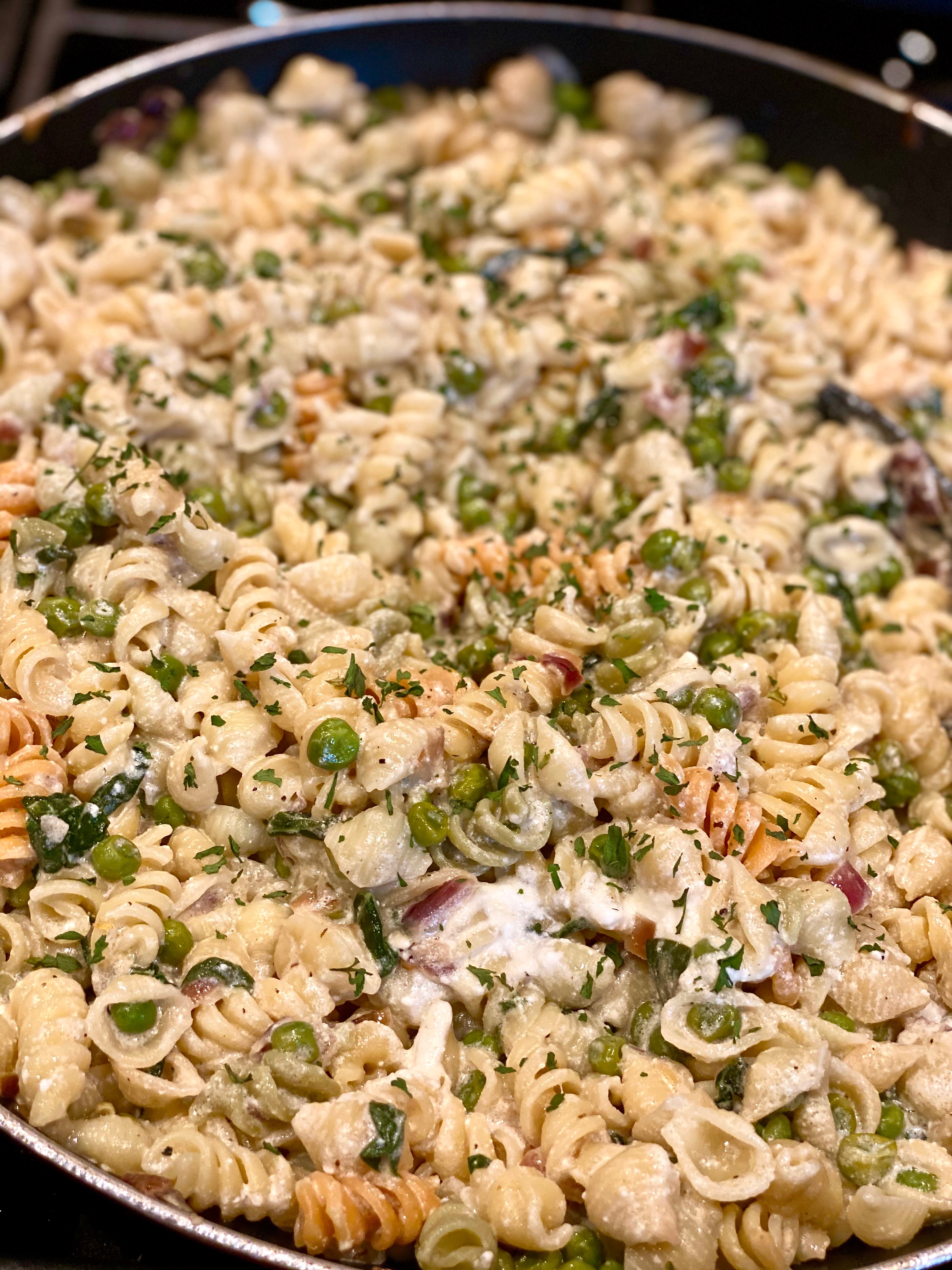 - Right after you start deglazing the pan, you can boil your noodle of choice! I actually wanted to have some fun with this so I used mini shells, as well as tri-colored rotini noodles!