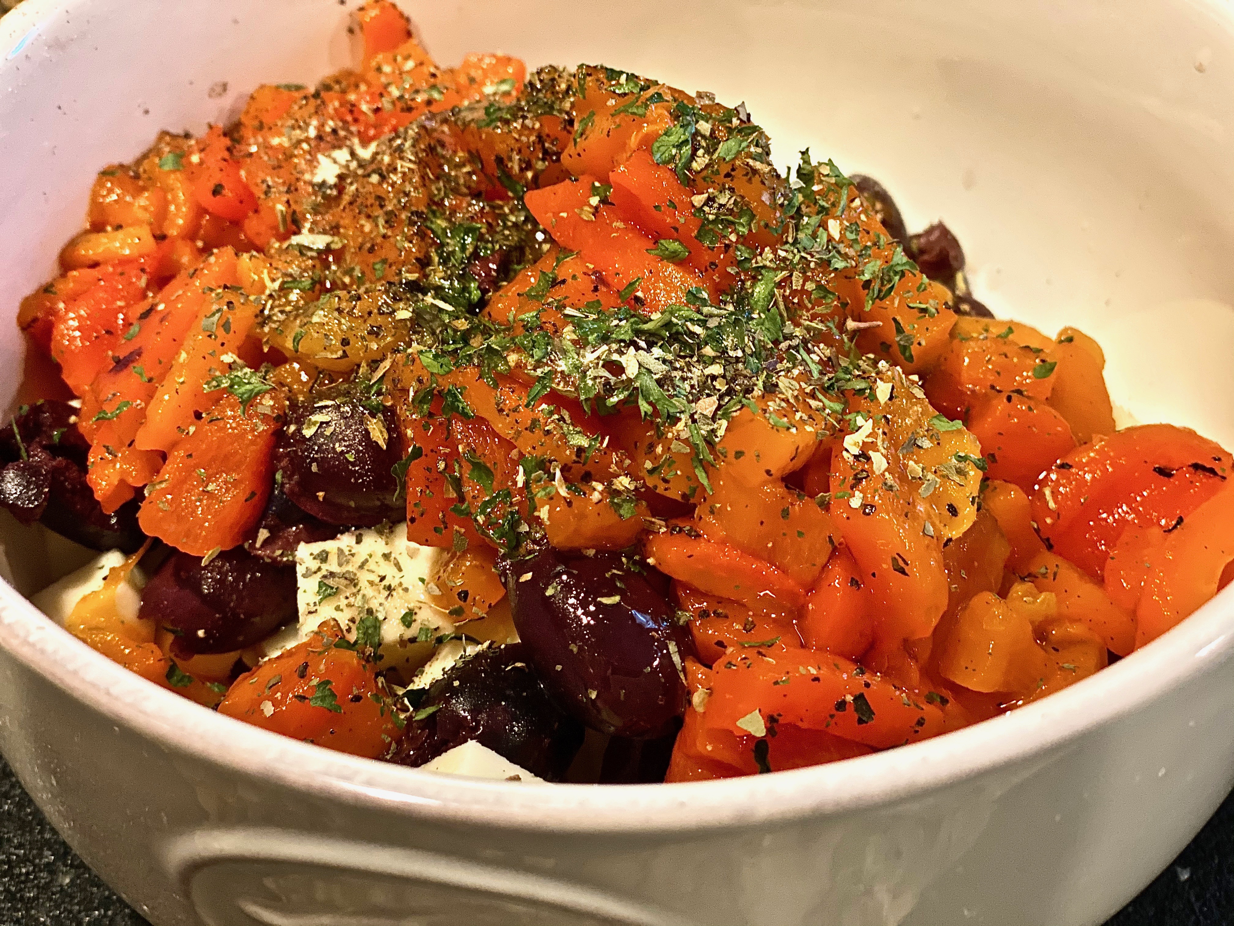 • Now.. for some kalamata olive talk: If you don’t love olives, or you think you dont.. still give this a try, and do not skip on the olives! The salty punch you get from olives when you take a bite mixing with the sweet, and smokiness from the pepper, along with the creaminess of the cheese is just phenomenal!