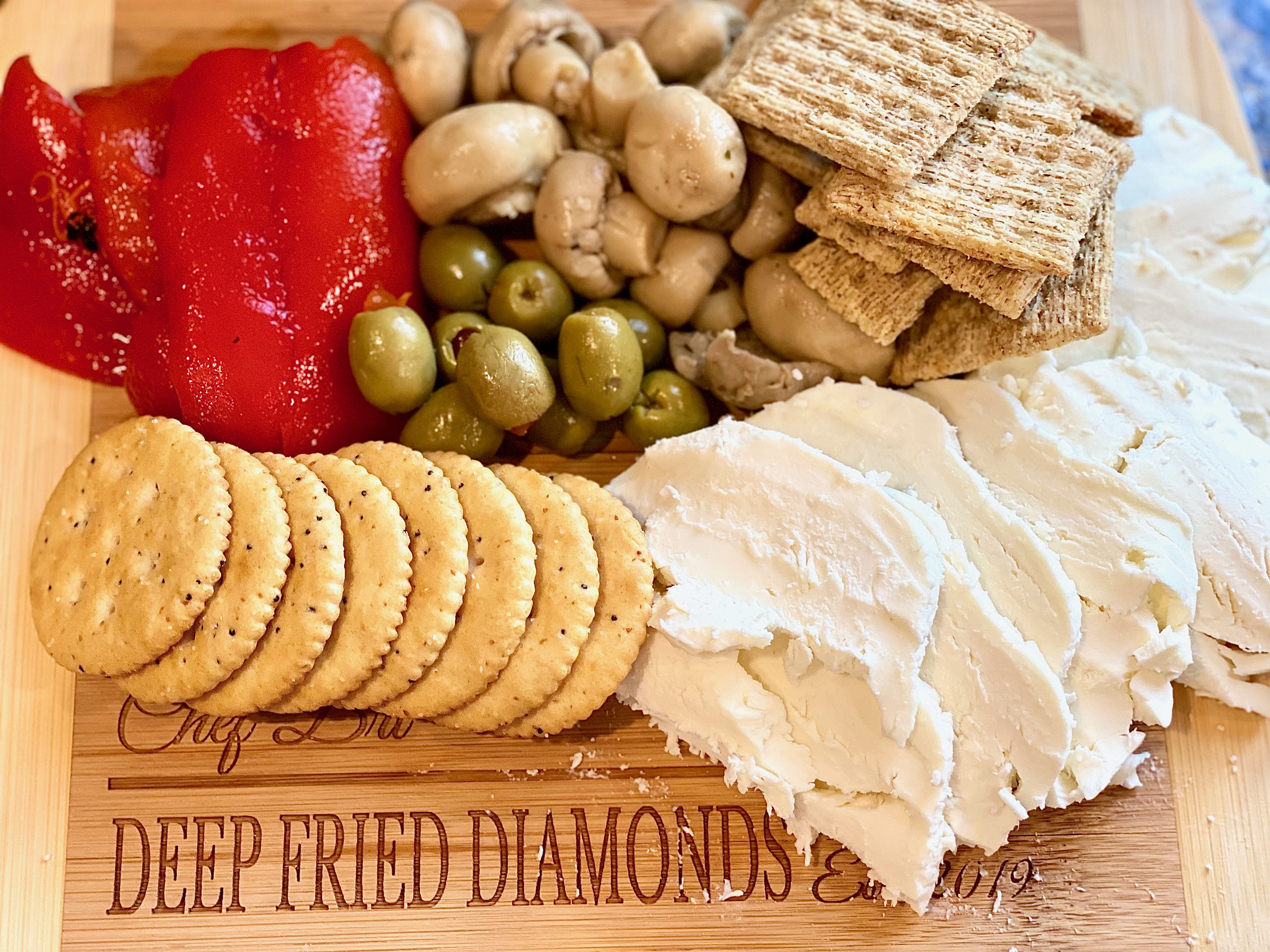 • Marinated whole button mushrooms. The texture up against the flakey, and crunchy wheat crackers is really really awesome!