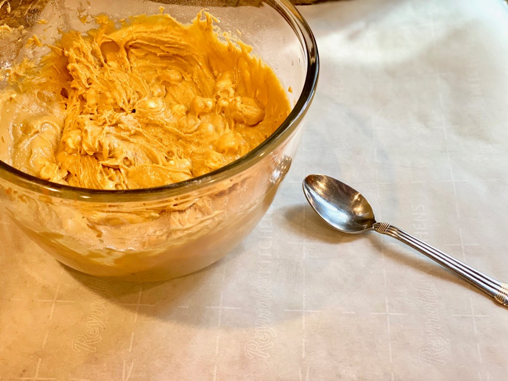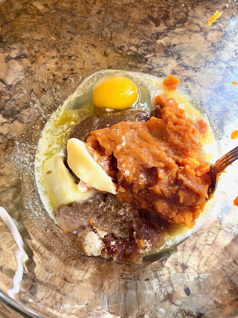 - For the wet ingredients I combined 1 large egg, 1/2 cup of brown sugar, 1/2 cup of pumpkin puree, 1tsp of vanilla extract, and 1 stick of melted butter together. The butter doesn’t have to be fully melted.. just make sure that it is really really softened!
