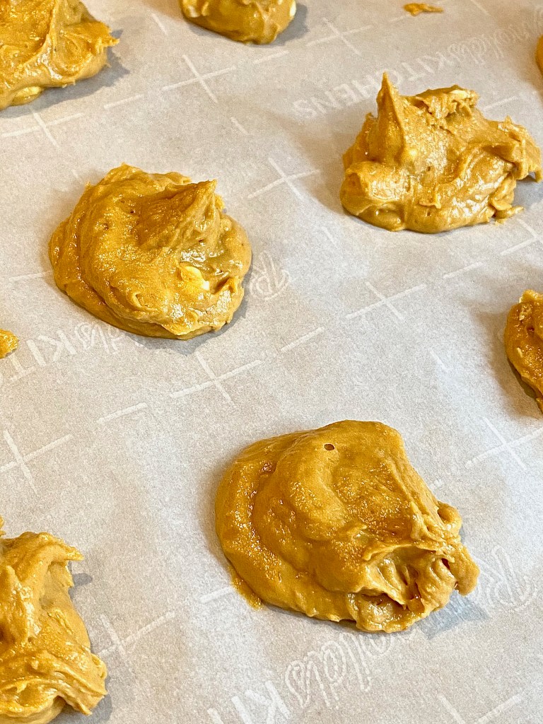 Combine all of the cookie ingredients together on medium speed with the mixer. Add 1/2 cup of mini marshmallows for that gooey bite of pure sugary sweetness that we’re going to long for when indulging in these cookies! You want to make sure the cookie batter isn’t too thin, but also not too thick. Then take a spoonful of the mouthwatering pumpkin batter, and place them into a circular shape on a baking sheet lined with parchment paper.