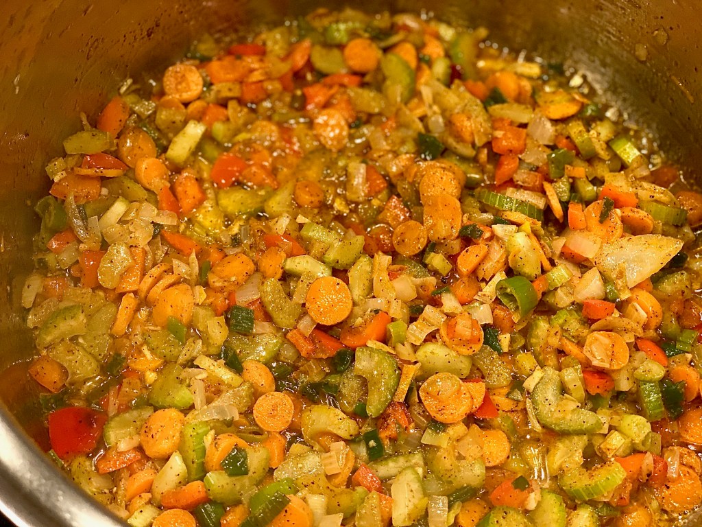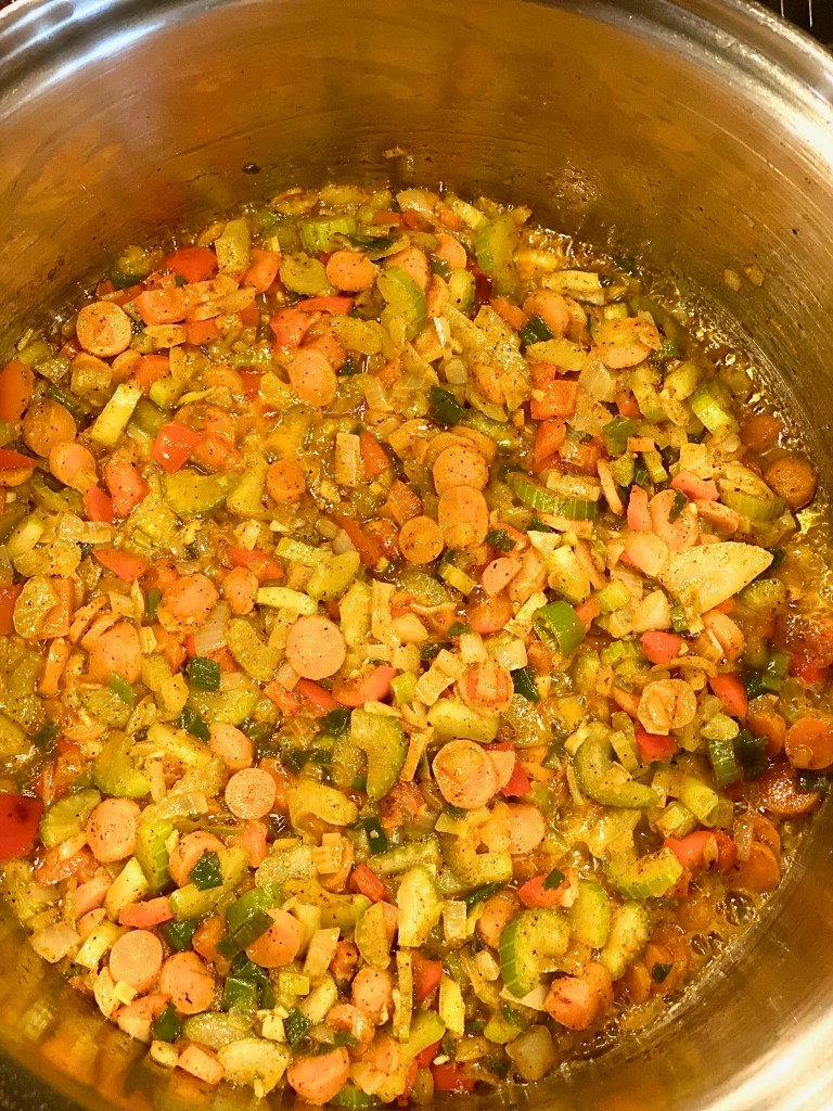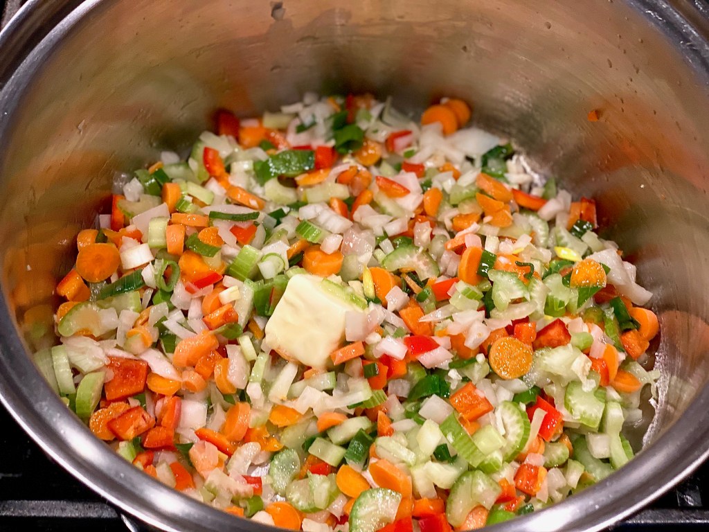 In a large stalk pot over medium heat, sauté your vegetables that you chopped up with a good gulp of vegetable oil, and a pad of butter. Let everything get translucent, and browned around the edges of each piece of produce.