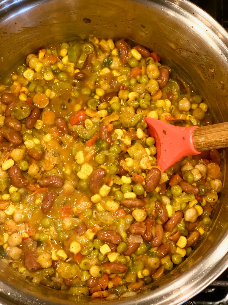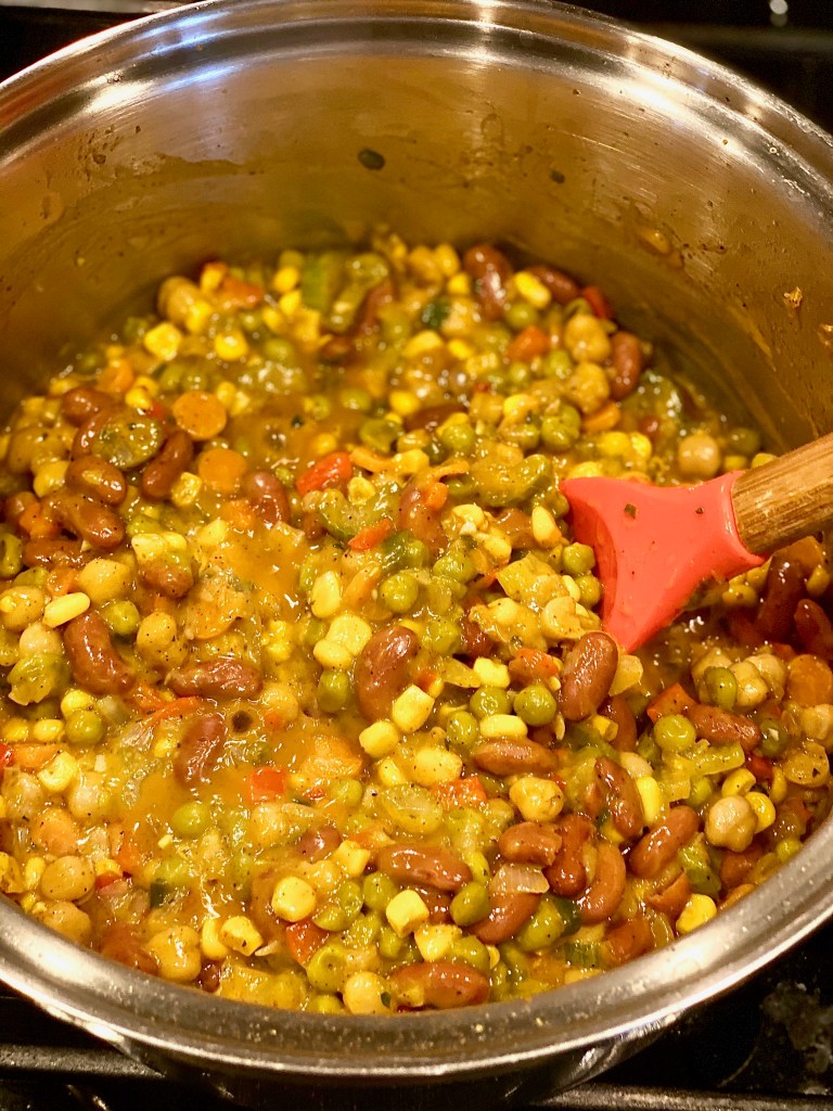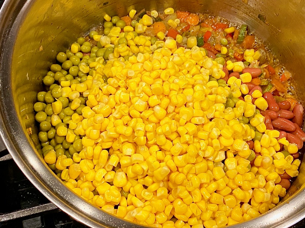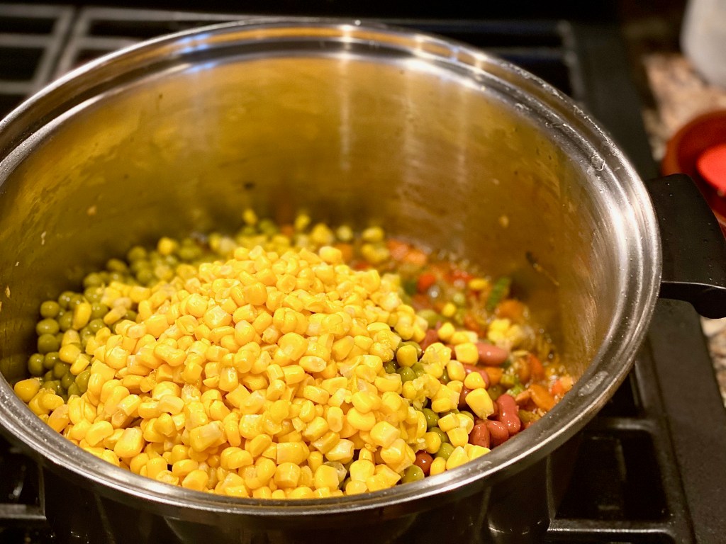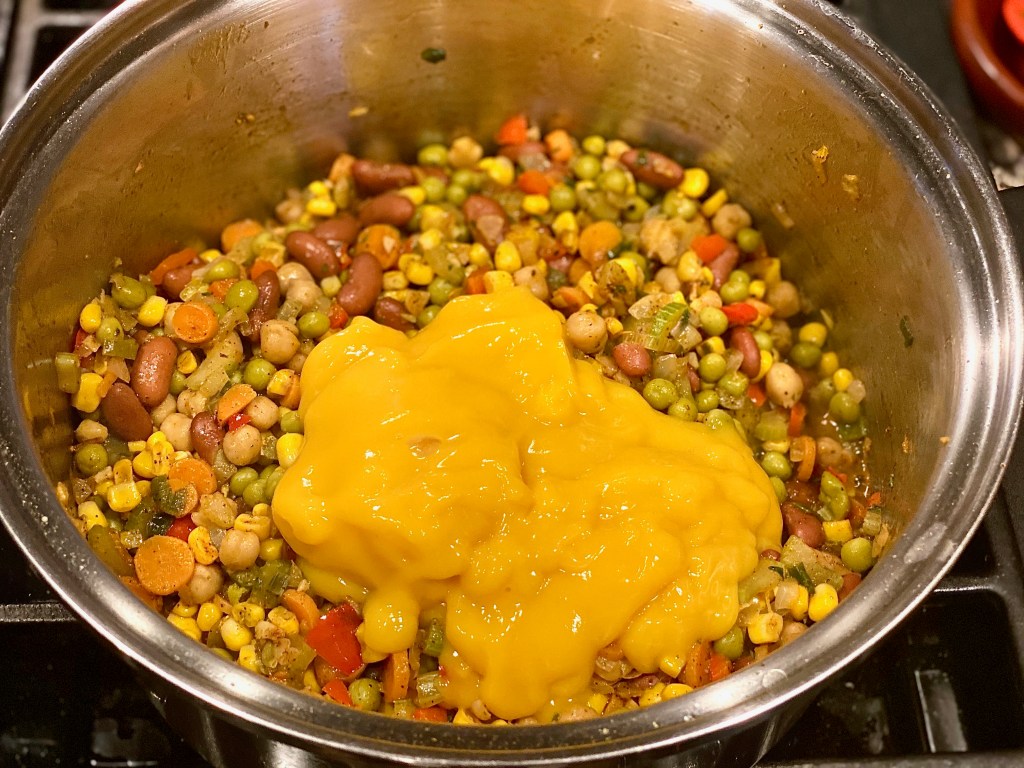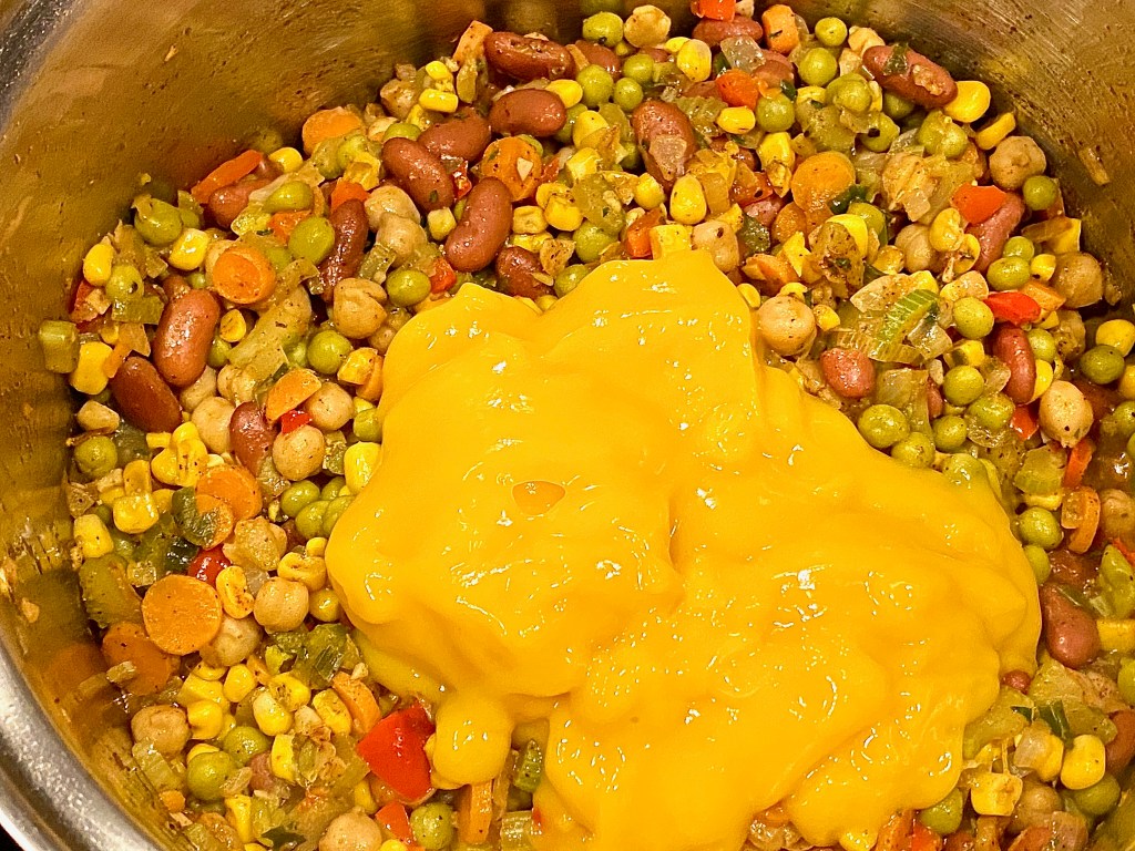 Once you’ve added all of those succulent spices, toss in a can of green peas, garbanzo beans, kidney beans, and a can of sweet corn. All of these ingredients are whats going to make this chili extremely thick, and filling since we are in fact missing the meat, but not actually missing the meat. If you Diamonds catch my drift! 😉 After all the rainbow goodness gets mixed in the pot, then it’s time for the cheesy goodness of it all!