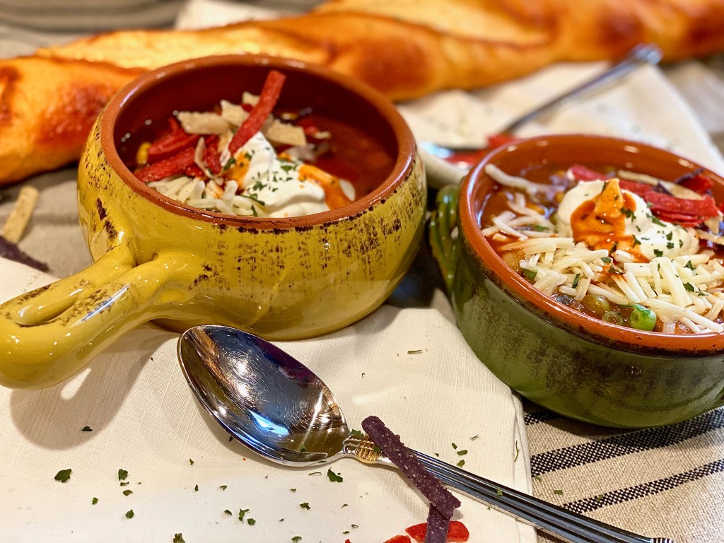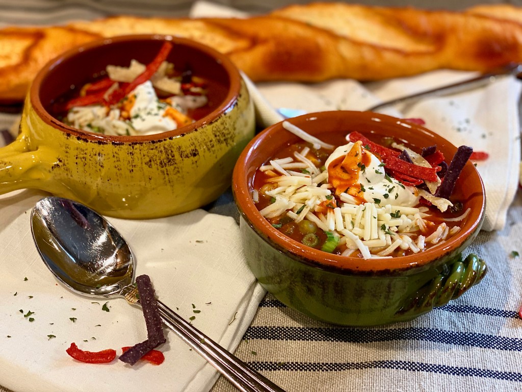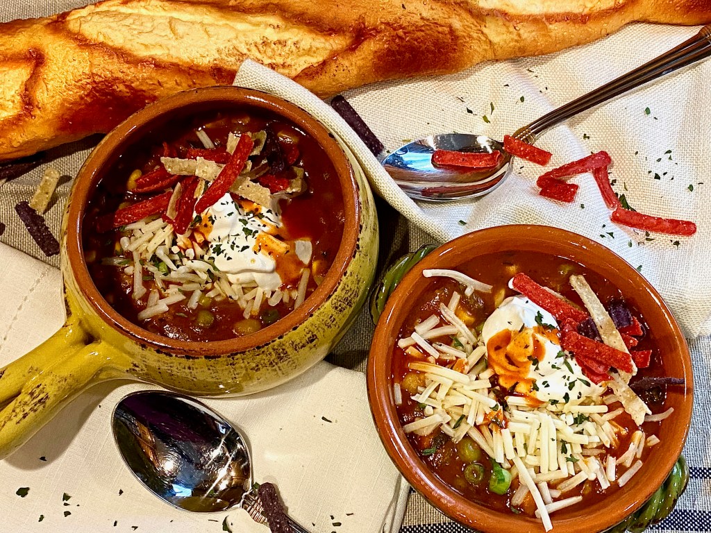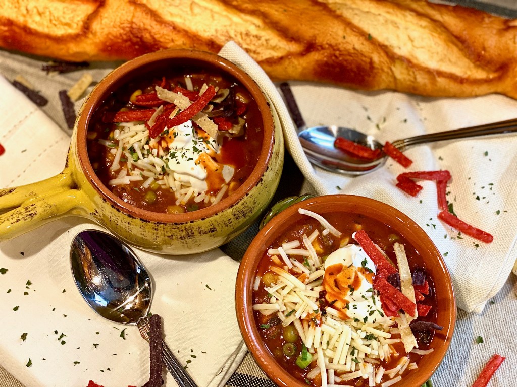 This is a vegetarians dream! Everything they could ever want all wrapped inside a warm bowl of comfort! Even if you’re not a vegetarian, you will absolutely not be missing the meat in this dish what so ever. It’s filled with all the delicious spicy, warm flavors that we all know and love when it comes to enjoying the classic bowl of chili, but with a delicious cheesy spin, along with tasty toppings that will make your mouth water before even taking your first bite! I feel like you can never just eat a bowl of plain chili.. I always have to be piling the goodies on top, including mountains of cheese, a dollop of sour cream, crushed up salty tortilla chips, and a few dashes of good hot sauce for that bite that we all look for when indulging in the coziest bowl of fall that there is! I mean it is CHILI! I always say.. you can’t really enjoy it unless there’s a nice chill in the air because I’m sure we can all agree that this is one meal best served hot, curled up on the couch watching your favorite football team play on the big screen!