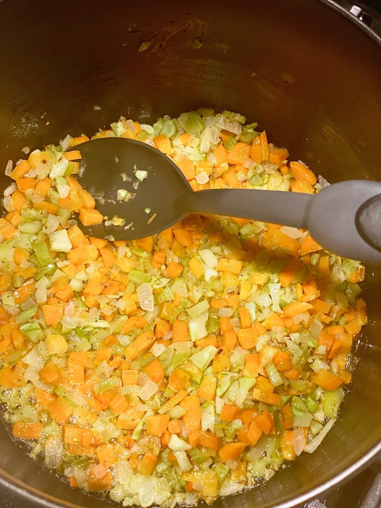 You’ll want to first small dice a white onion, peel & chop a large carrot, and medium dice two stalks of celery. It’s the tried and true trio for every single soup that I make! Even if you feel like you don’t need the carrot or celery because you’re not crazy about either vegetable, you do! It gives such immense flavor, so you’d be missing out on all that if you’d skip out on adding these ingredients.