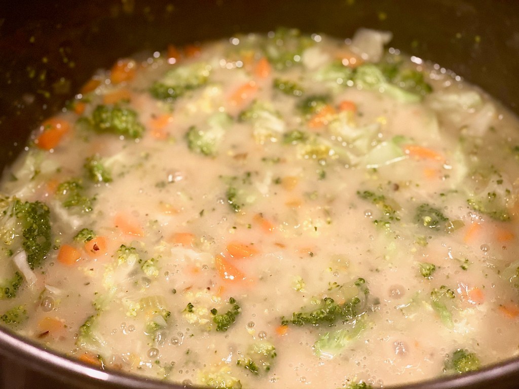- Throw the broccoli on top of our thickened vegetable mixture, and add a whole box of chicken or vegetable stalk. Whichever you prefer will work really great!