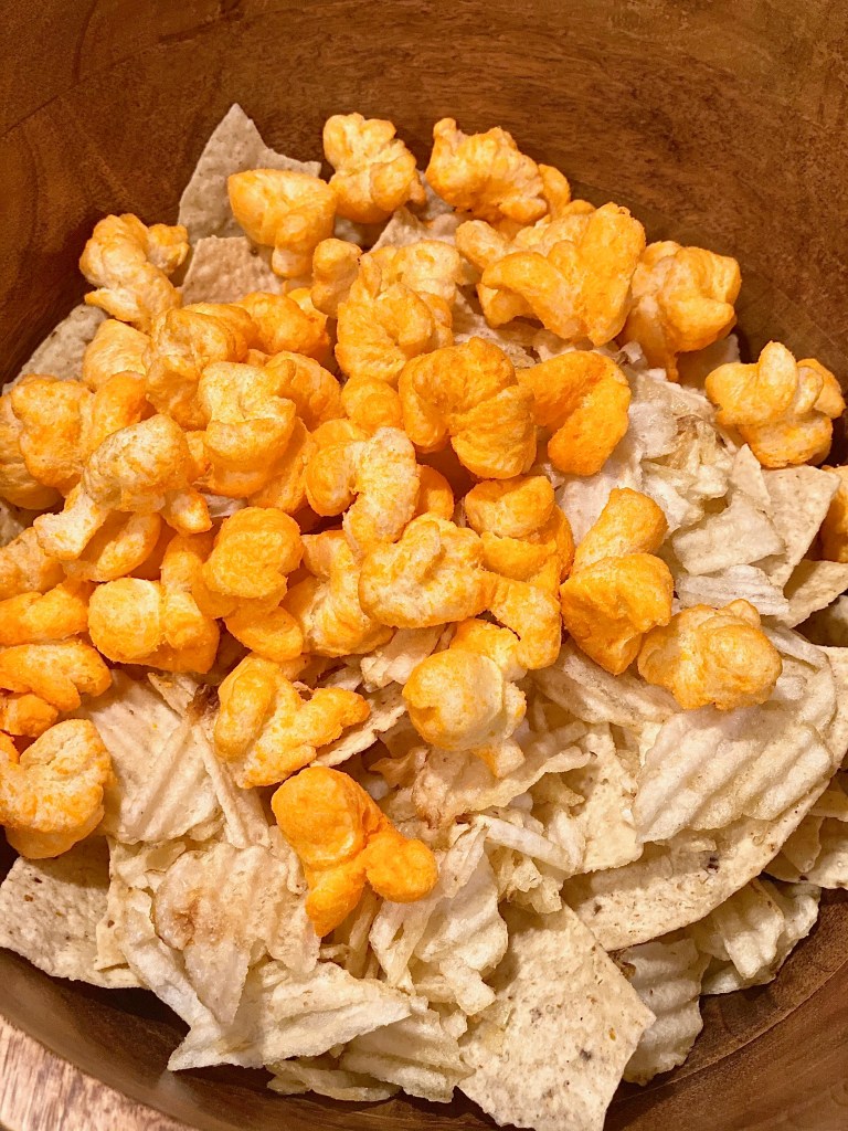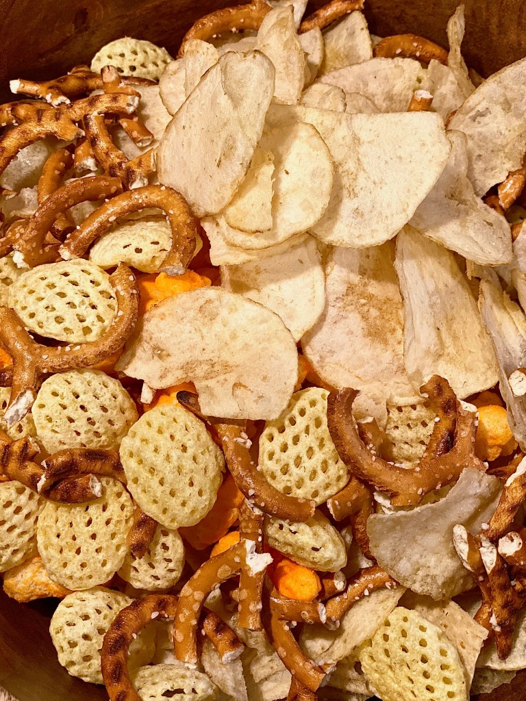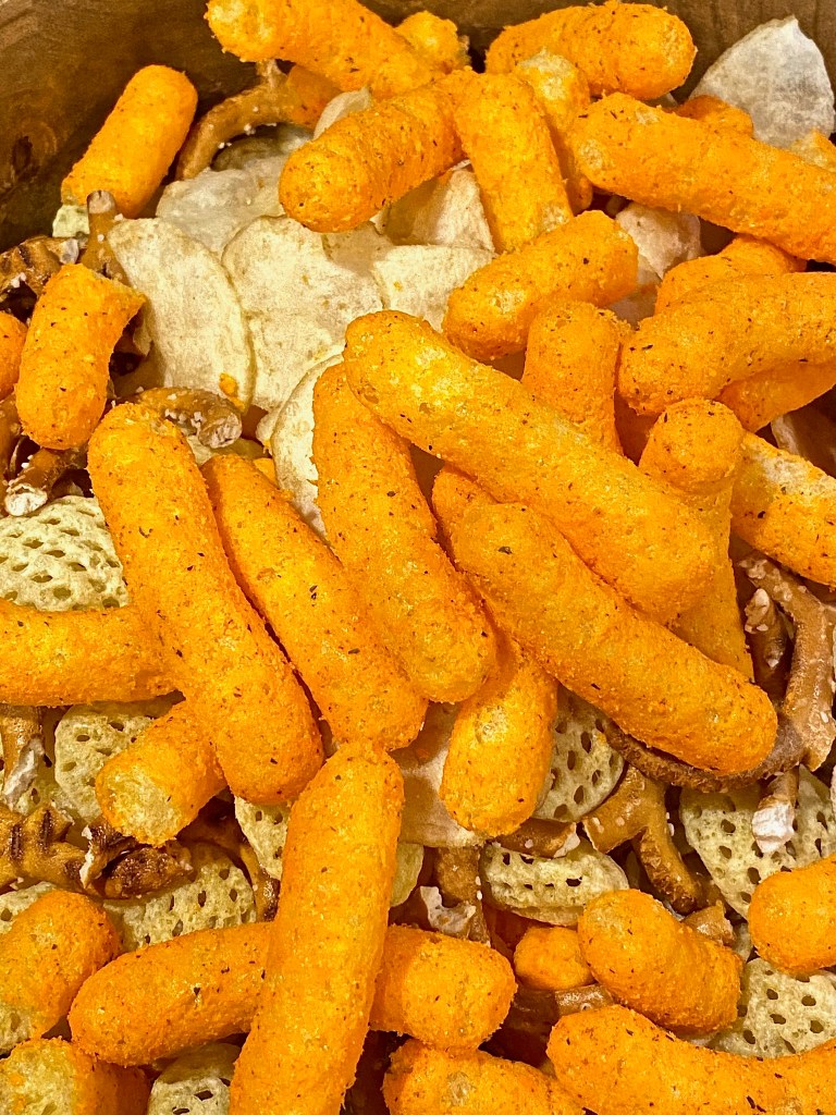I wanted this snack mix to be insanely crunchy & cheesy, so I went for all different kinds of chips, and cheesy, yummy snacks!