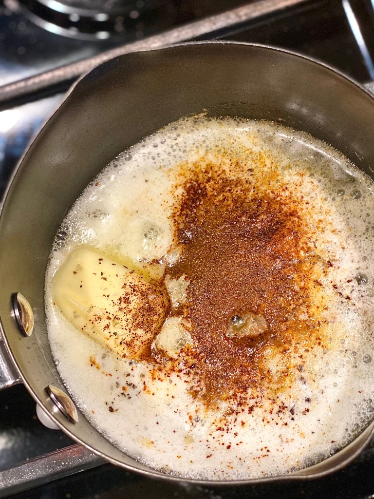 This is exactly how seasoned your melted butter should look! Also, when you brown your chili butter you want to do it on really low heat for just a few minutes; otherwise your butter will burn, and nobody likes burnt butter..especially not us Diamonds! 😉