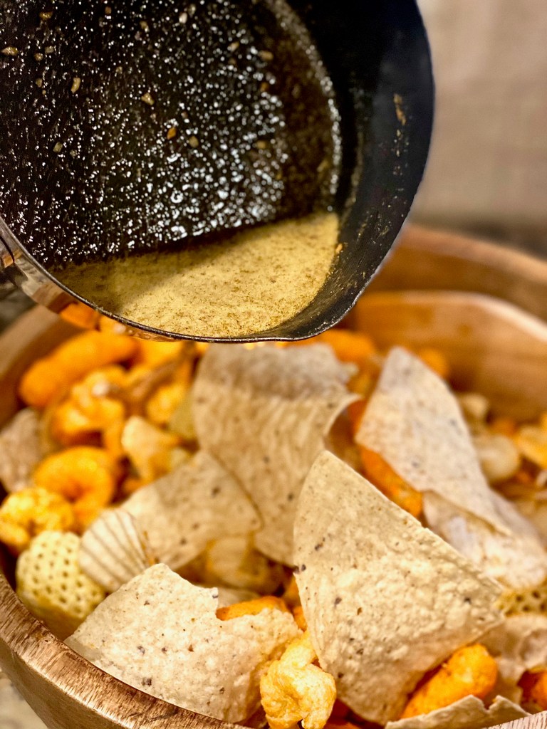 It’s very simple to make the key flavor blasting ingredient to this snack mix. The chili butter. All it is.. is 3/4 a stick of butter, along with 2 teaspoons of chili powder, 2 teaspoons of paprika, 2 teaspoons of cumin, 1 teaspoon of garlic powder and 2 teaspoons of dried onions. If the cheesy snacks in the chip mix isn’t enough for you, you’re more than welcome to add in nacho cheese seasoning to amp up the cheese flavor!