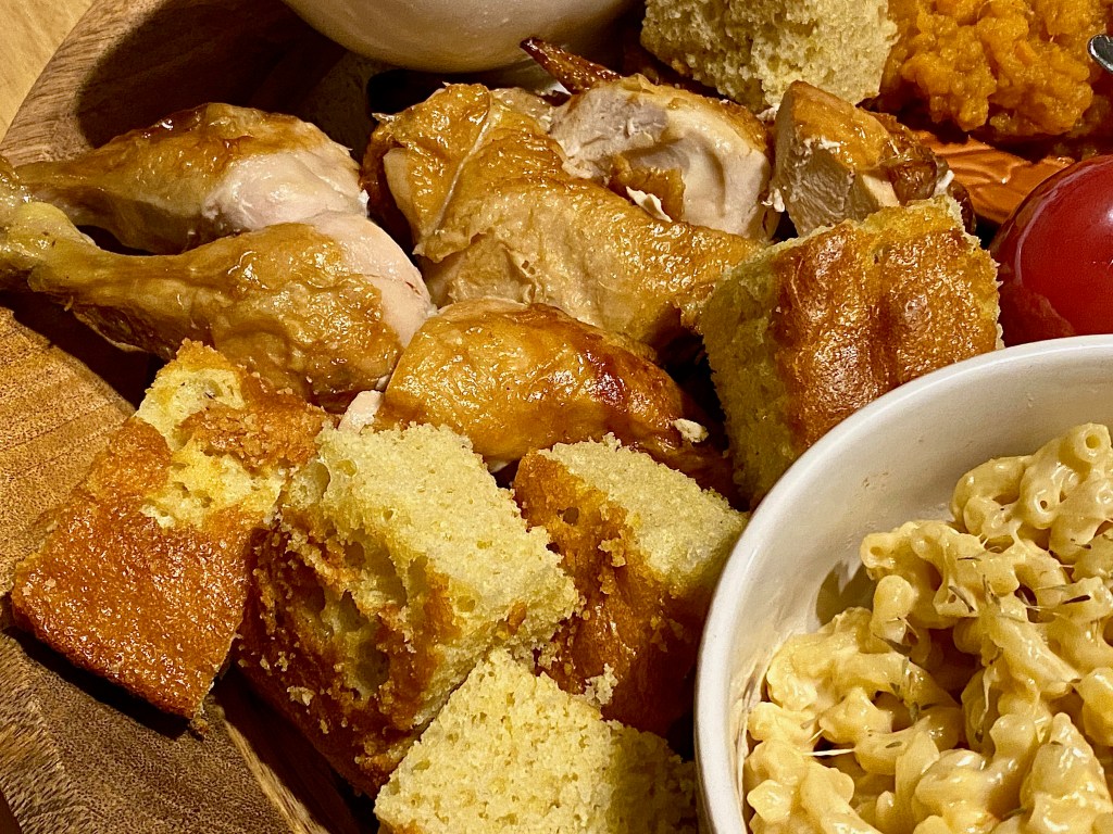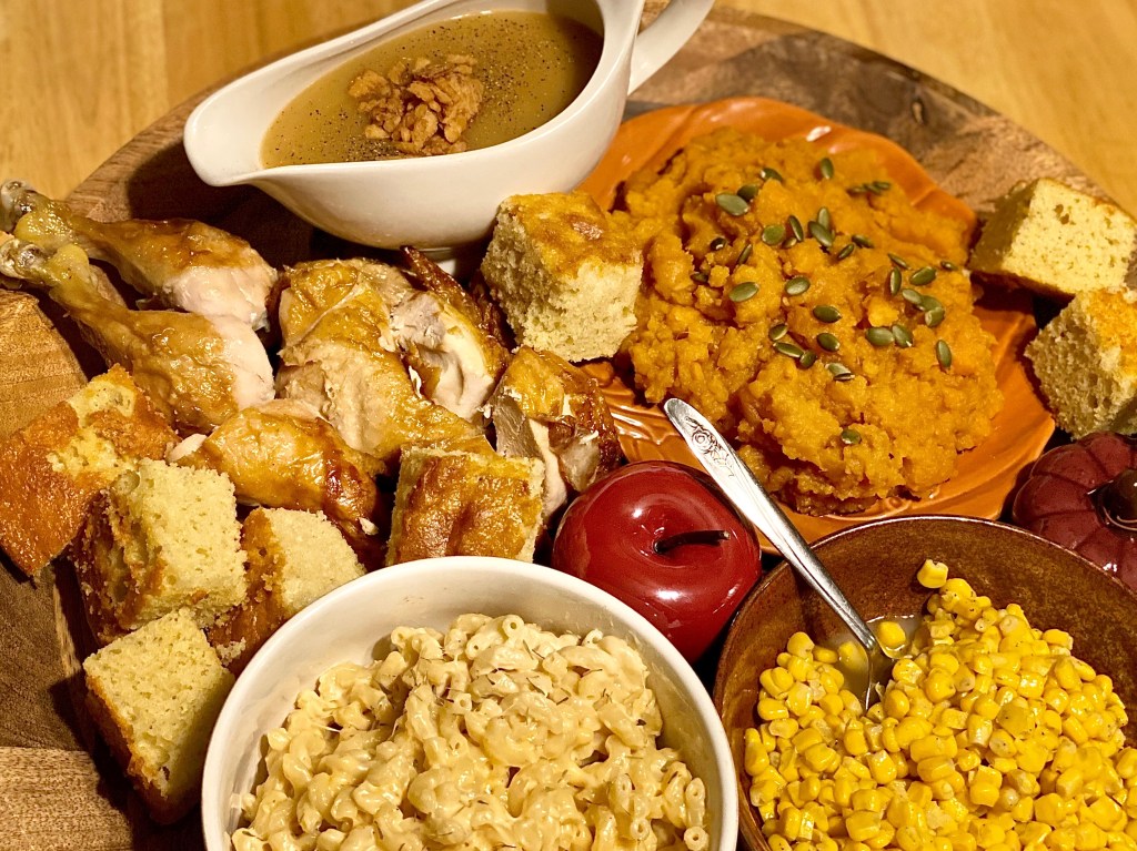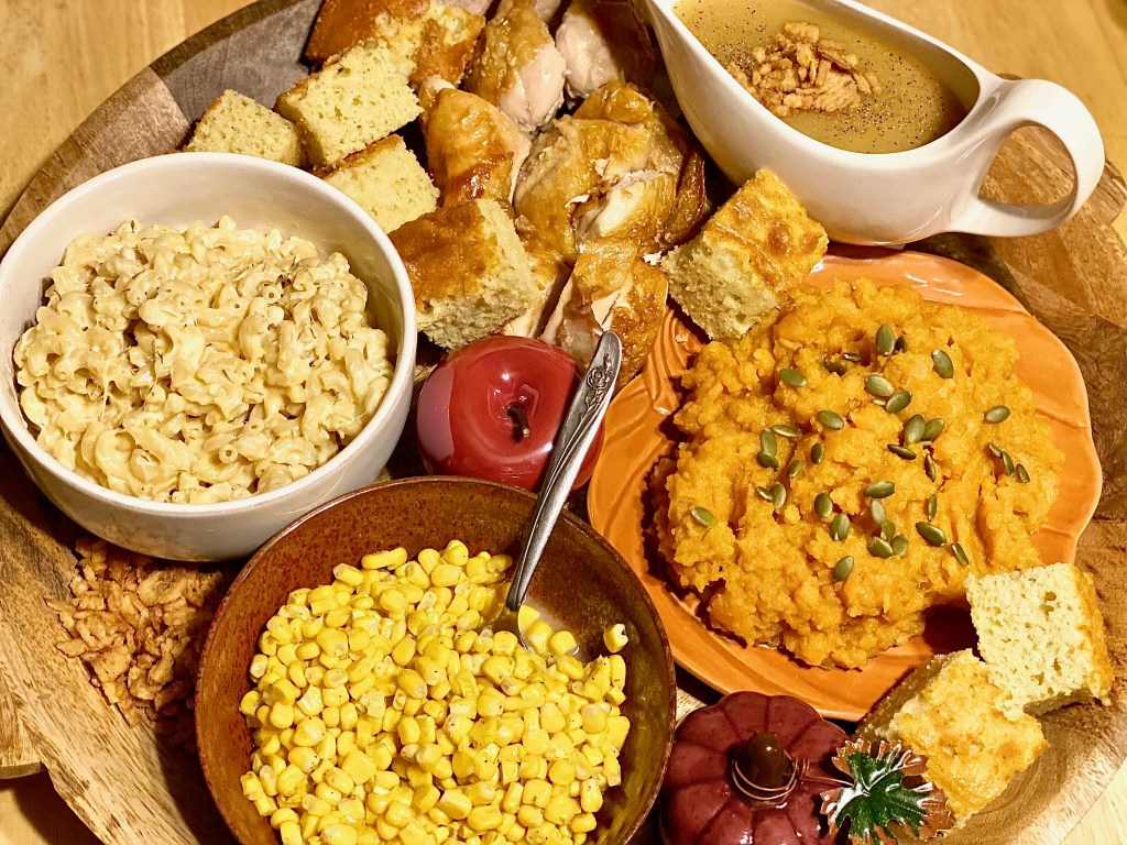 The traditional way to celebrate Thanksgiving is to gather around a long dinning room table thats adorned with all of the worlds best known side dishes that warm our hearts, and fill our bellies. You of course can’t forget about the star of the show, and the centerpiece of the whole meal.. the Thanksgiving turkey!! However.. this year is being planned very differently for everyone all over which is causing stress, and confusion on what the menu will be, and how much of it they’re going to make. These seem like hard questions considering when you think of a Thanksgiving meal you think of course after course with bowls of delicious comfort foods piled sky high, but it doesn’t have to be exactly like that to celebrate exactly like you normally would. You may be wondering how you would succeed at having such an amazing meal with a variety of choices, without serving a 20lb. turkey, and 10 different accompaniments… but with this beautiful big roasted chicken board, it is absolutely more than possible! Now I know it’s not classic to serve roasted chicken instead of turkey, but there is no better time for change of traditions than right now considering everything else that is changing around us.