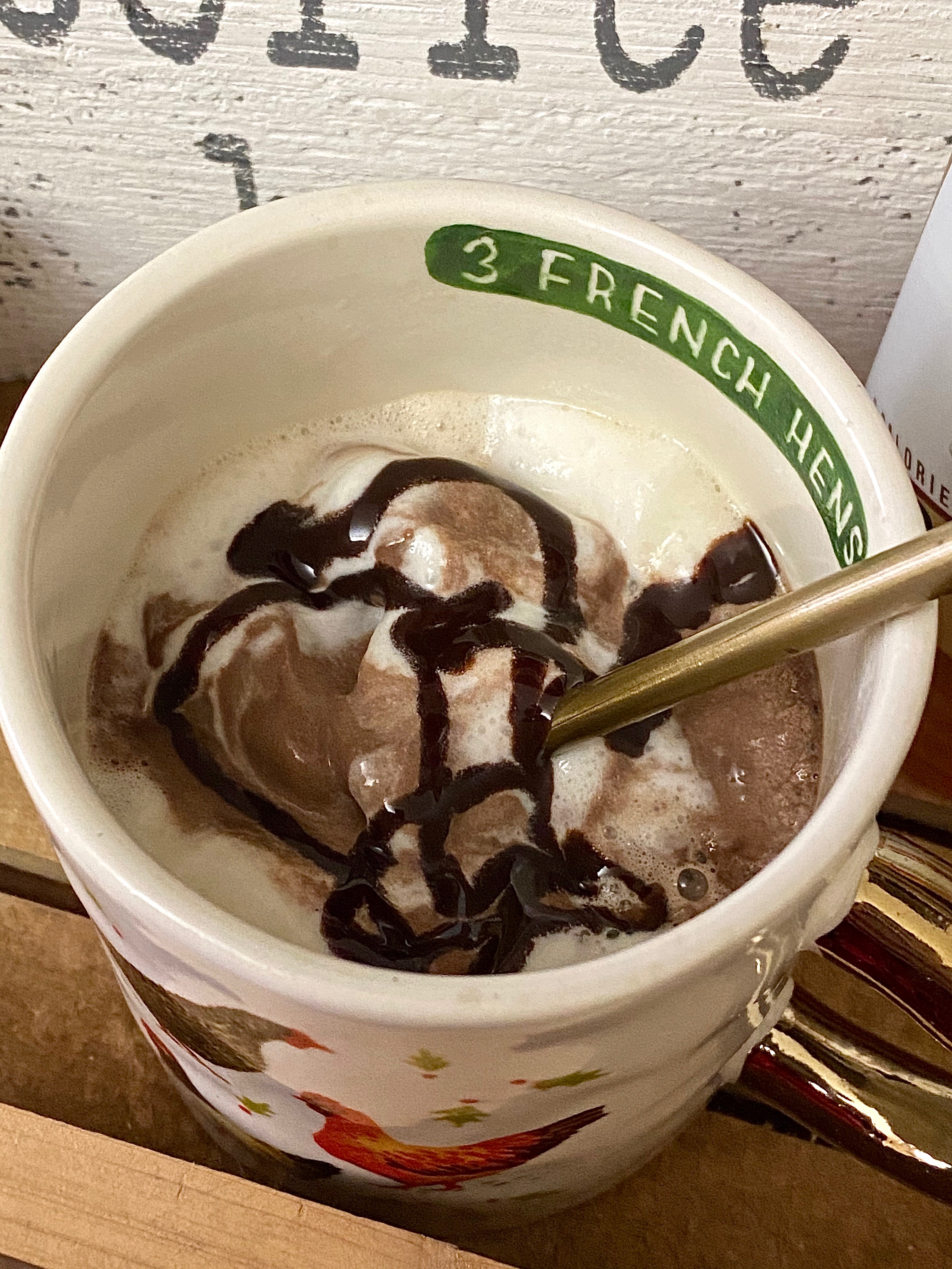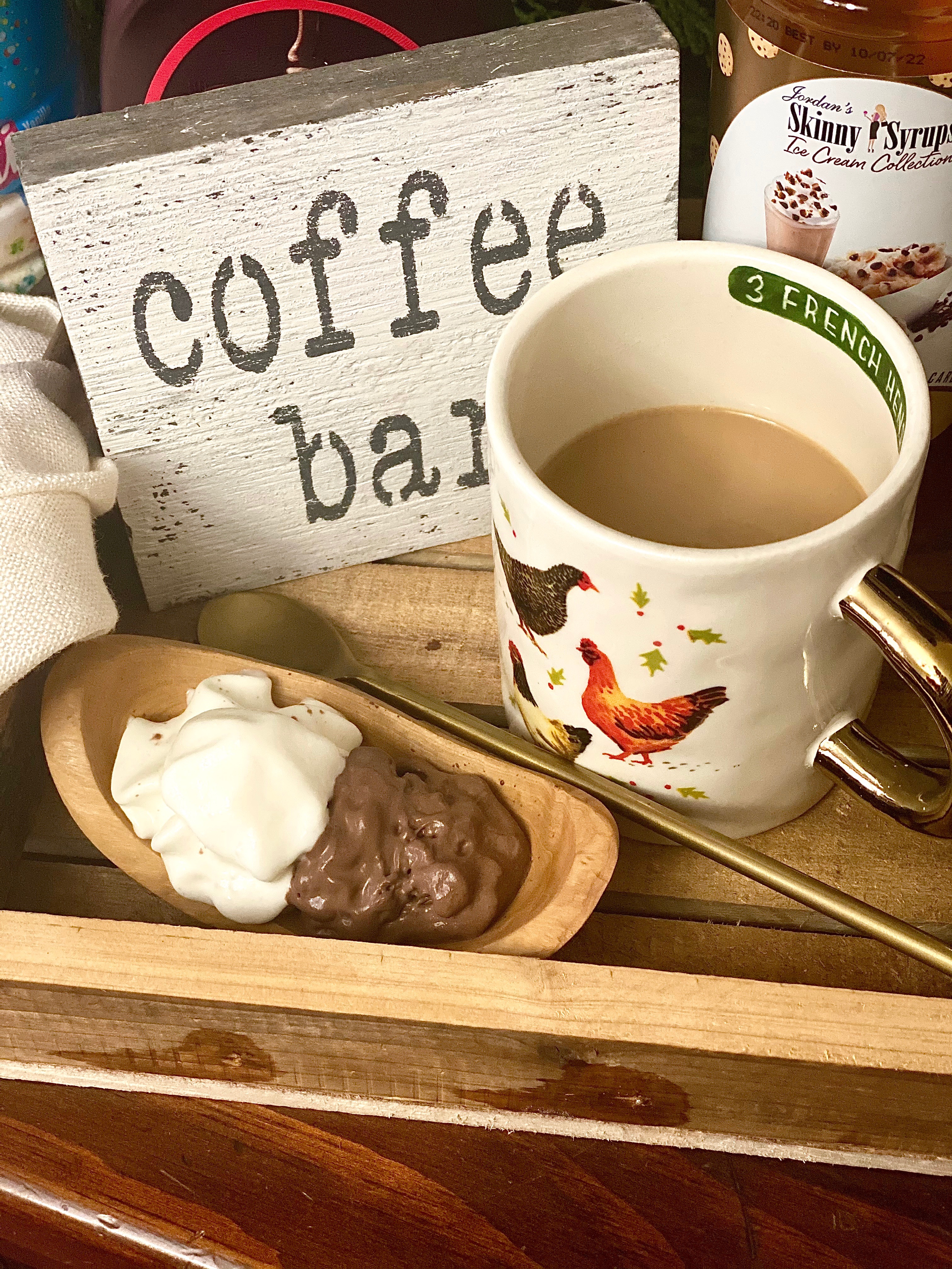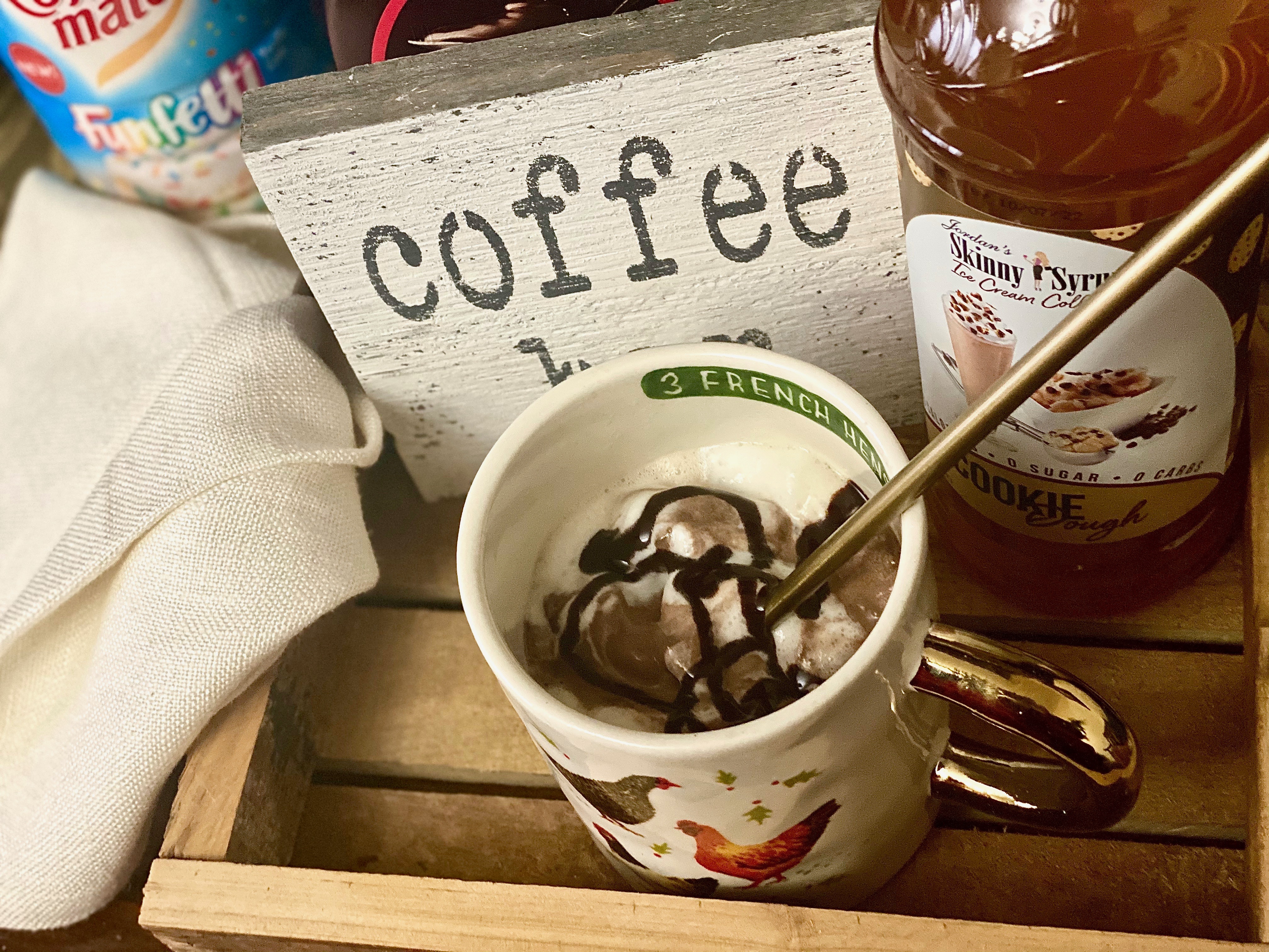 My favorite way to make the most perfect indulgent cup of coffee at home is to add a splash of creamer that I’m enjoying at the moment, some syrup if I’m feeling sassy, and then I top it with whipped cream! You can use regular or chocolate, but for this special moment I did both and it really hit a coffee lovers heart! 🙂 Now I will say I am not a sugar person, so I never ever add that in with my coffee. I am however a mocha gal though, so I love to a drizzle hot chocolate syrup over top of the whipped cream.