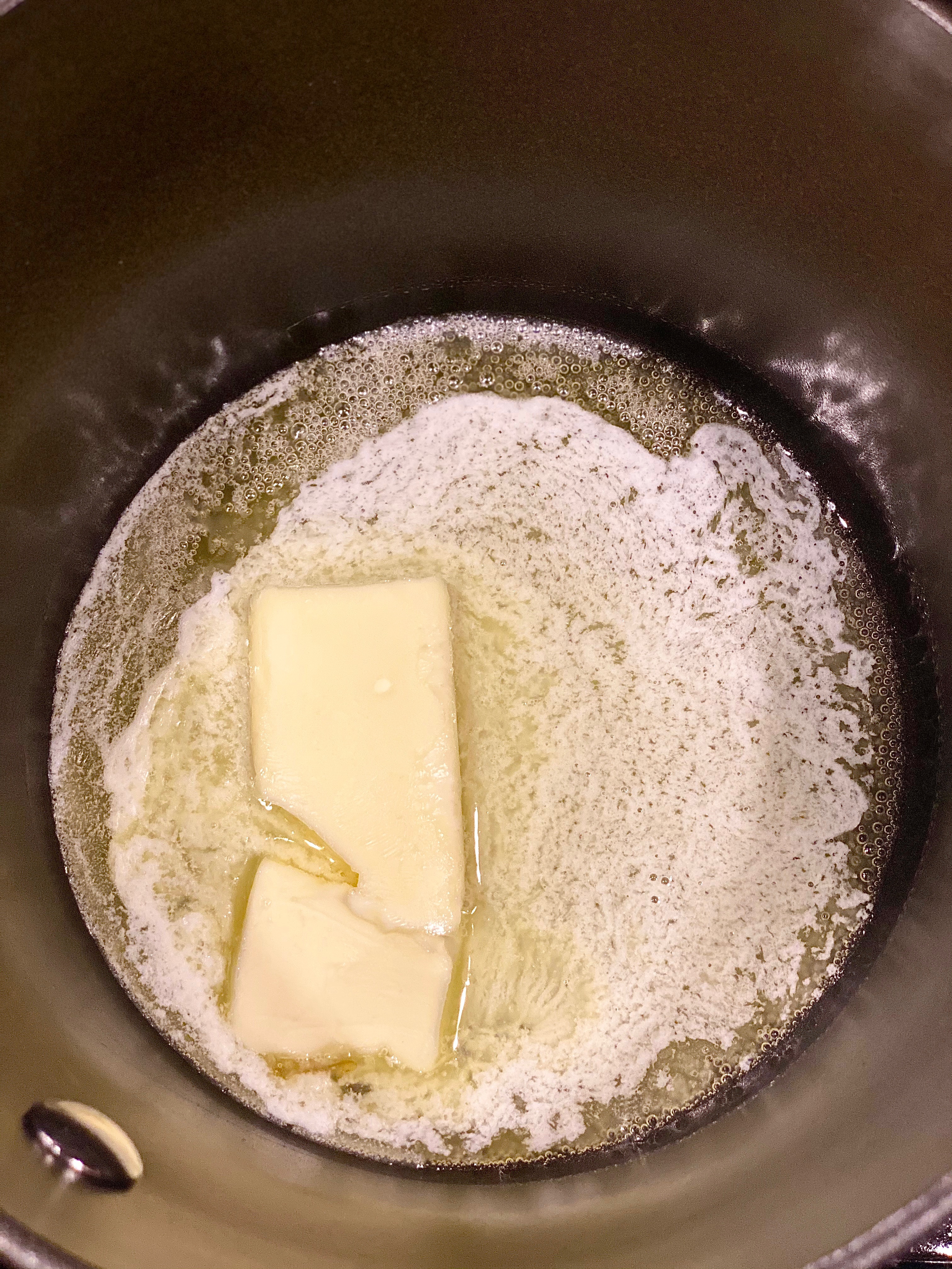 Melt one stick of butter with two tablespoons of brown sugar. Whisk until you get a caramel color over low-medium heat.