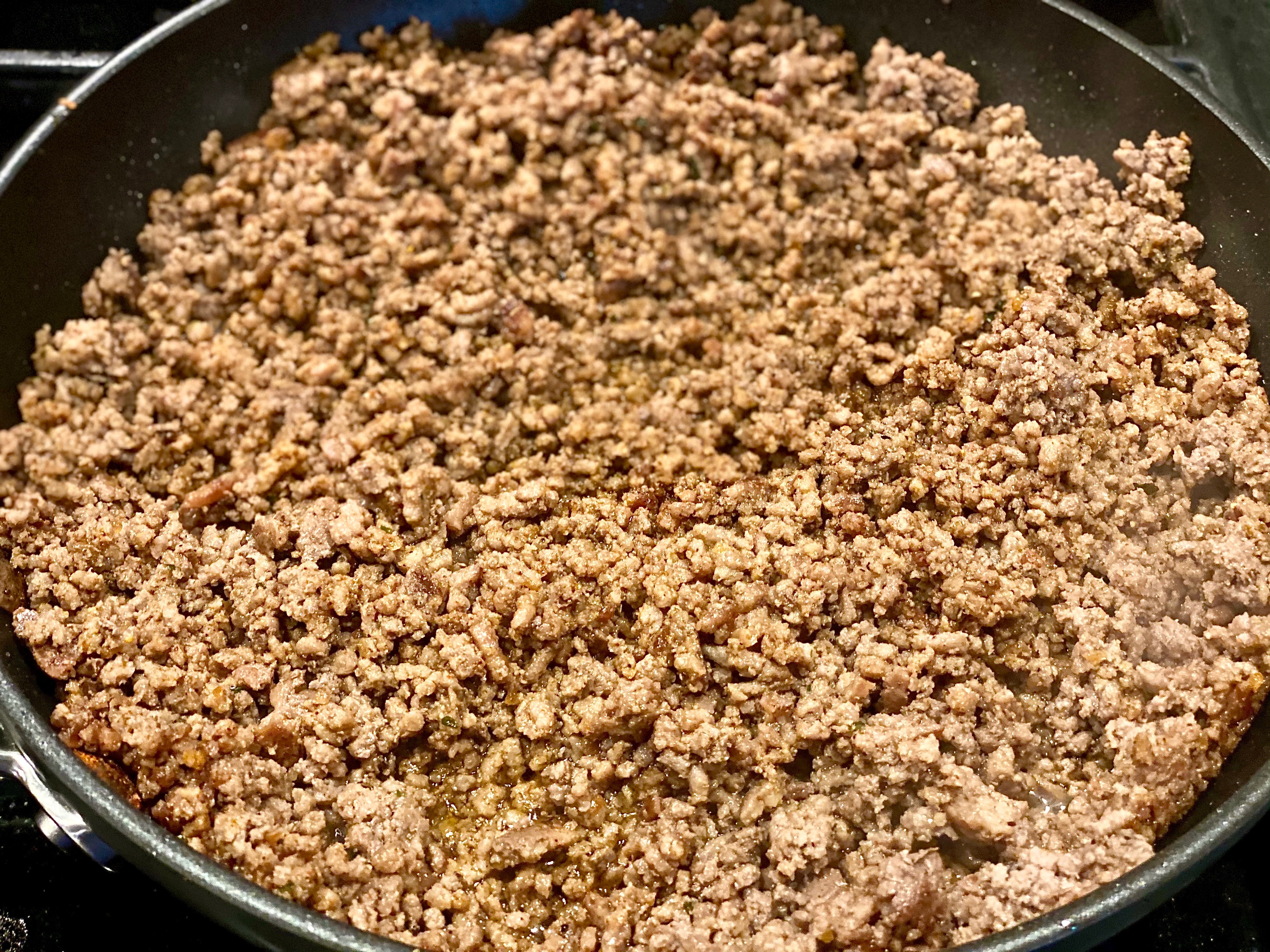 - Brown the meat for 5-7 minutes over medium heat. DO NOT add oil into the pan before cooking the meat. The natural fat from the beef will get released into the pan once it begins to cook.