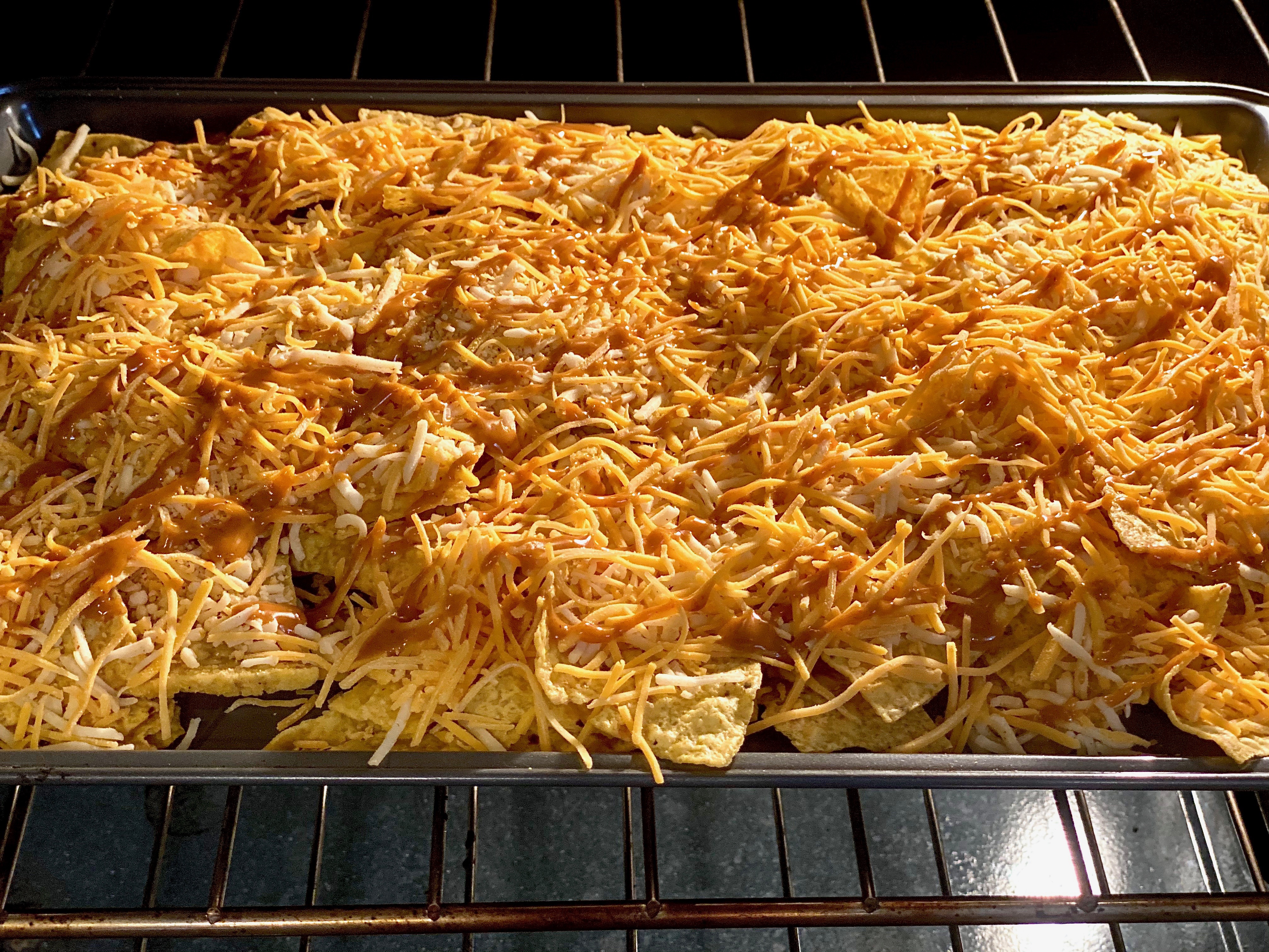 - Set the oven to 400 degrees, and place the chips covered in cheese and sauce into the hot oven for 5 minutes. Then voila!! You have unbelievably melty chipotle chips that quick!!