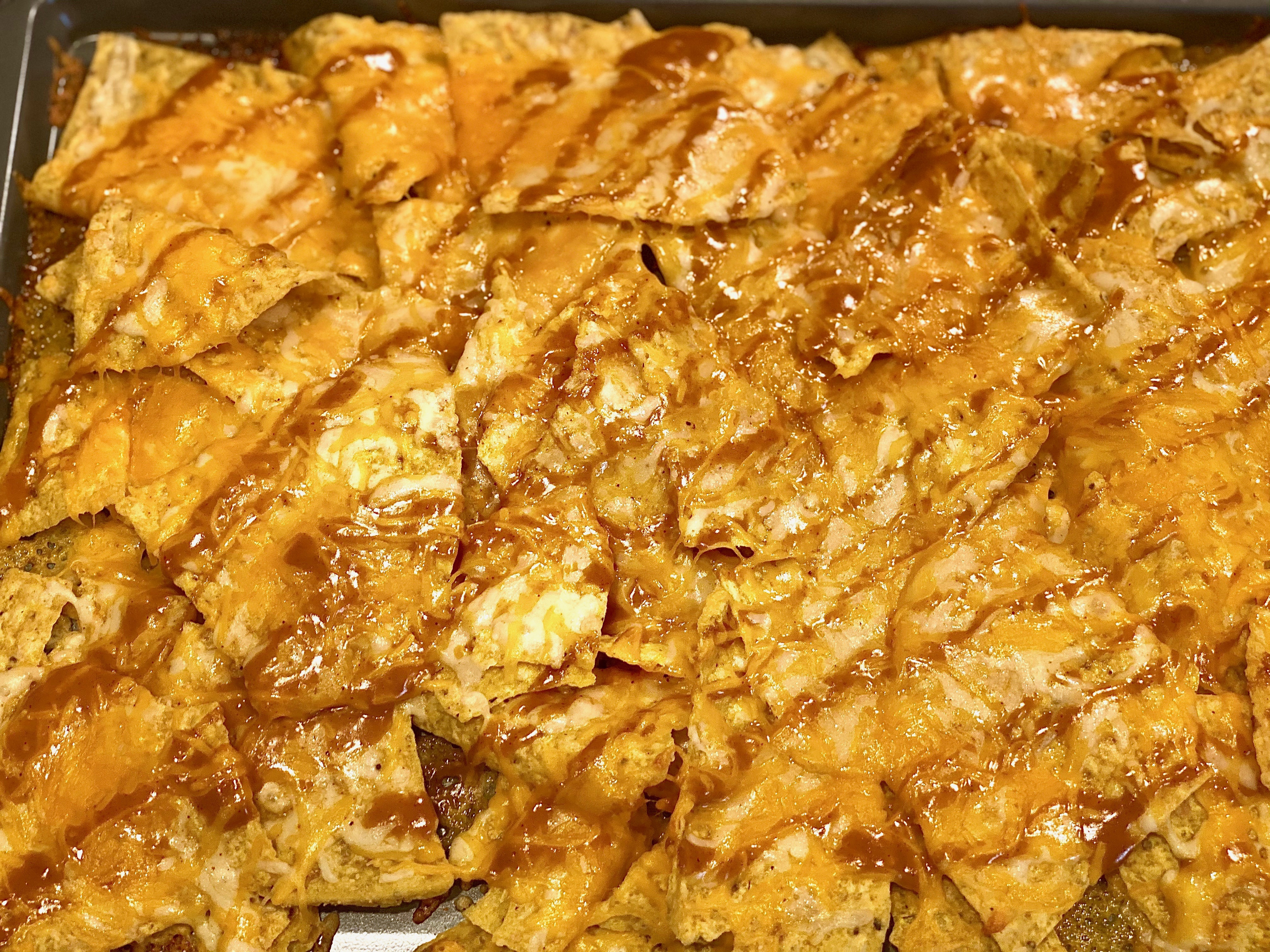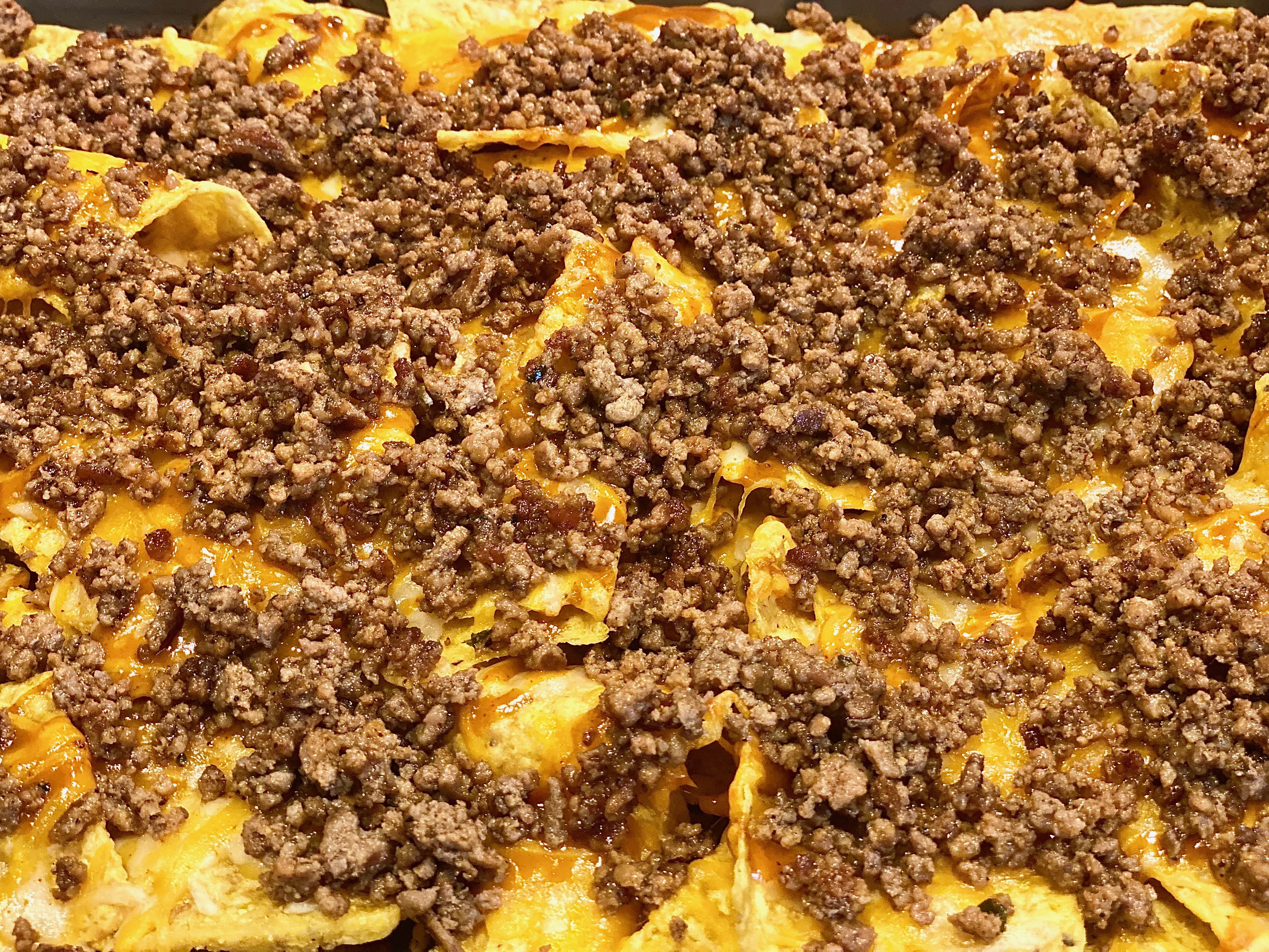 - As your meat cooks, line your baking sheet nicely with tortilla chips of your choice! You can even make them homemade if you really want to get fancy. 😉