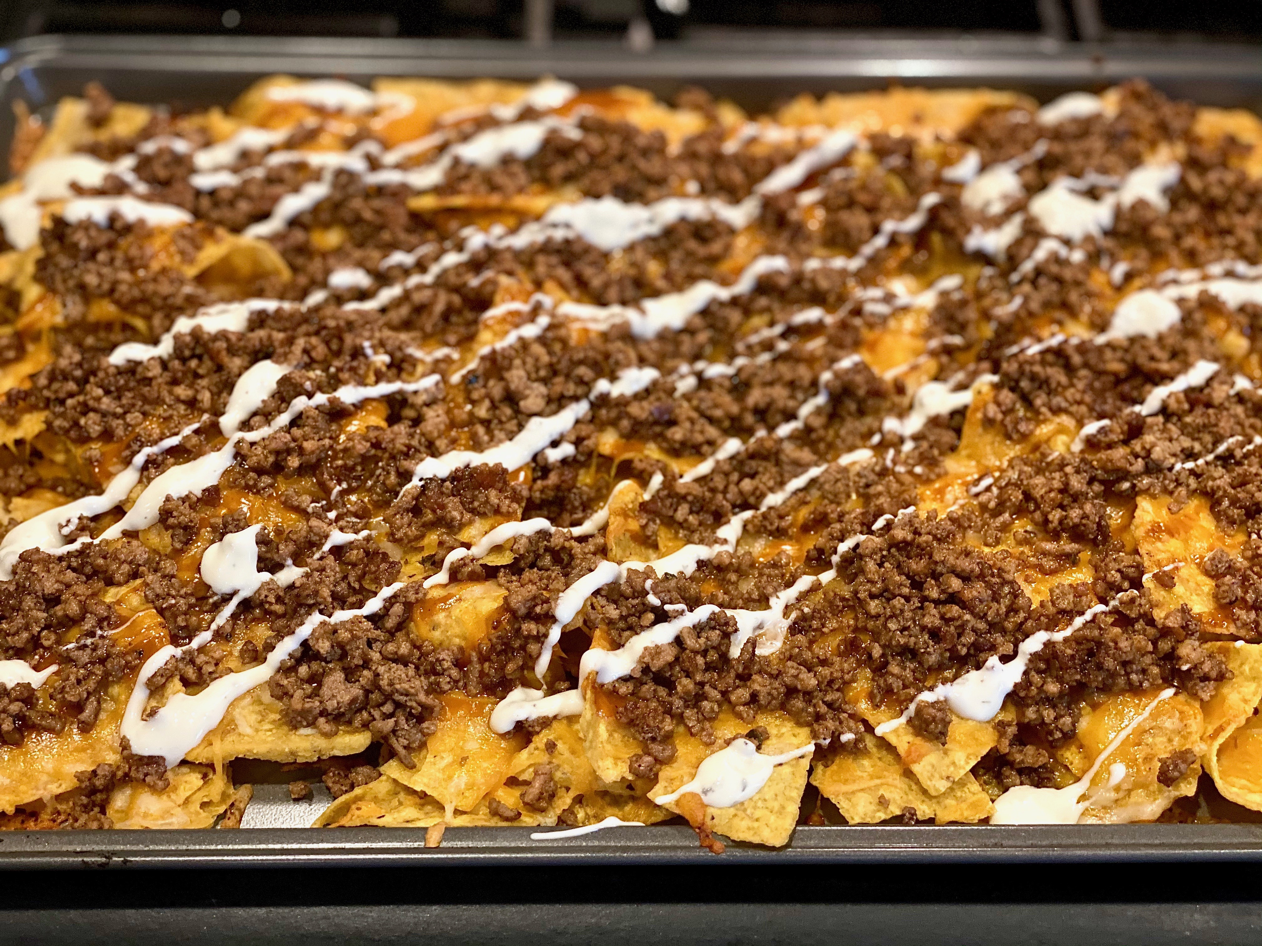Layer the deliciously seasoned ground beef all over the cheesy nachos! Then drizzle cool ranch dressing all over the beef as well.