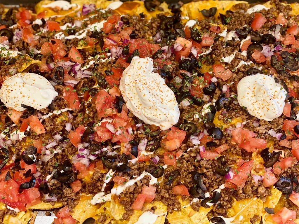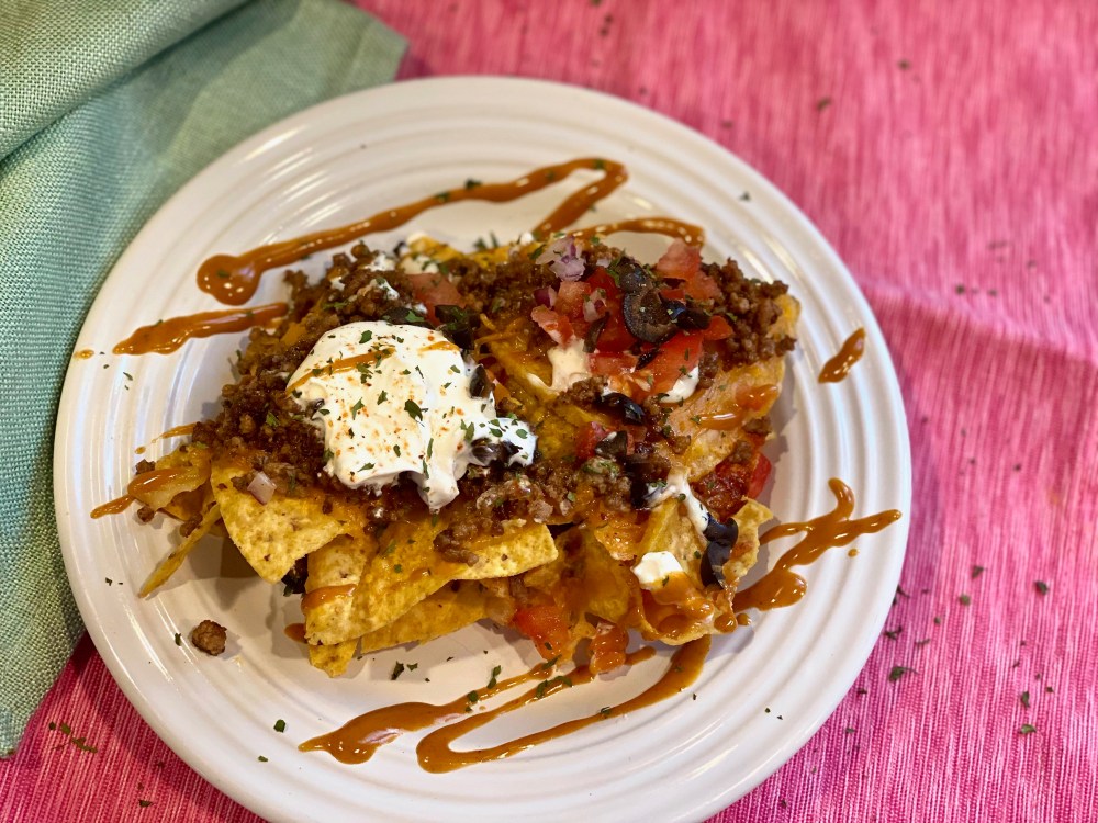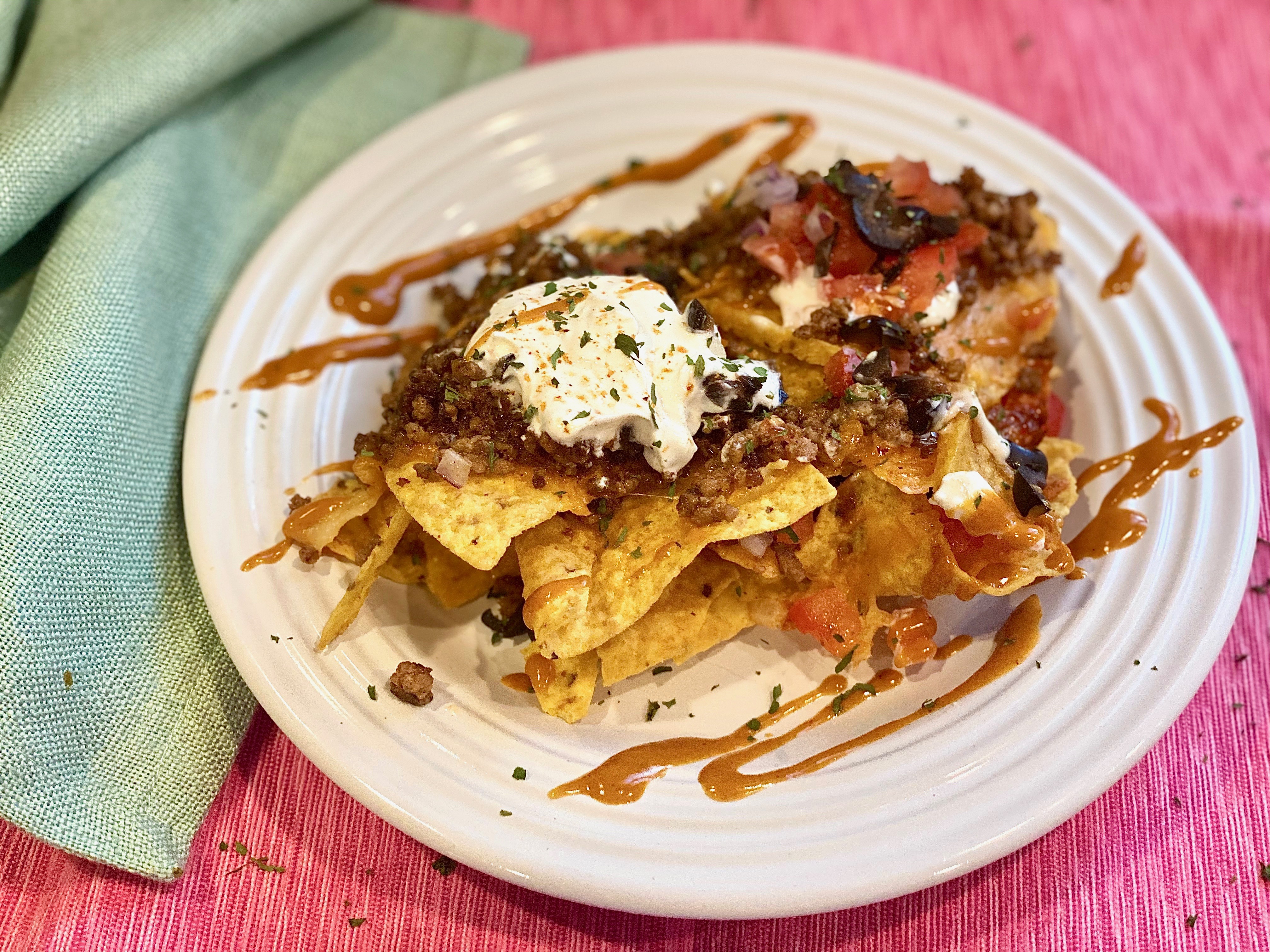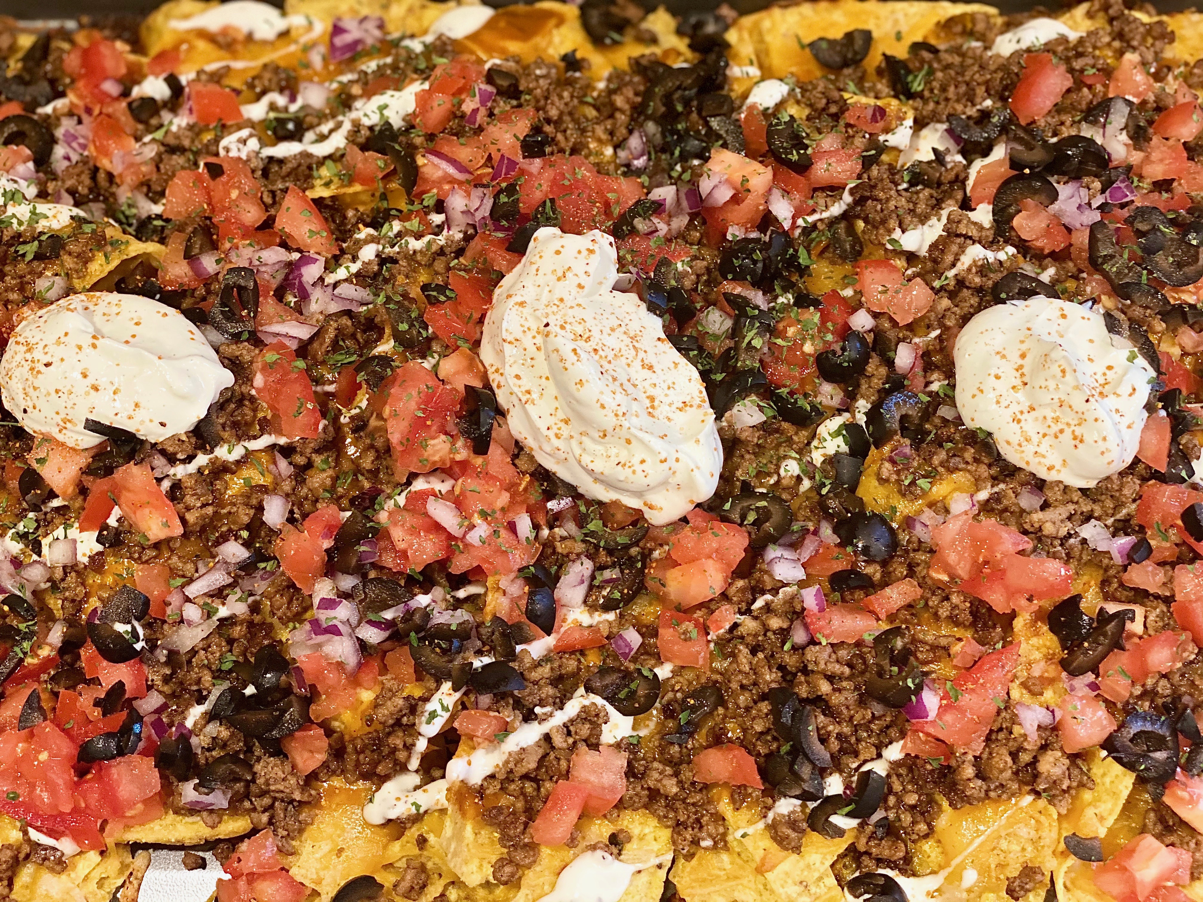 All you need to top off these creamy, spicy, and wonderfully cheesy nachos are chopped black olives for an earthy bite, diced red onions for some zip, finely chopped vine ripened tomatoes for a burst of juiciness, and a few dollops of sour cream!