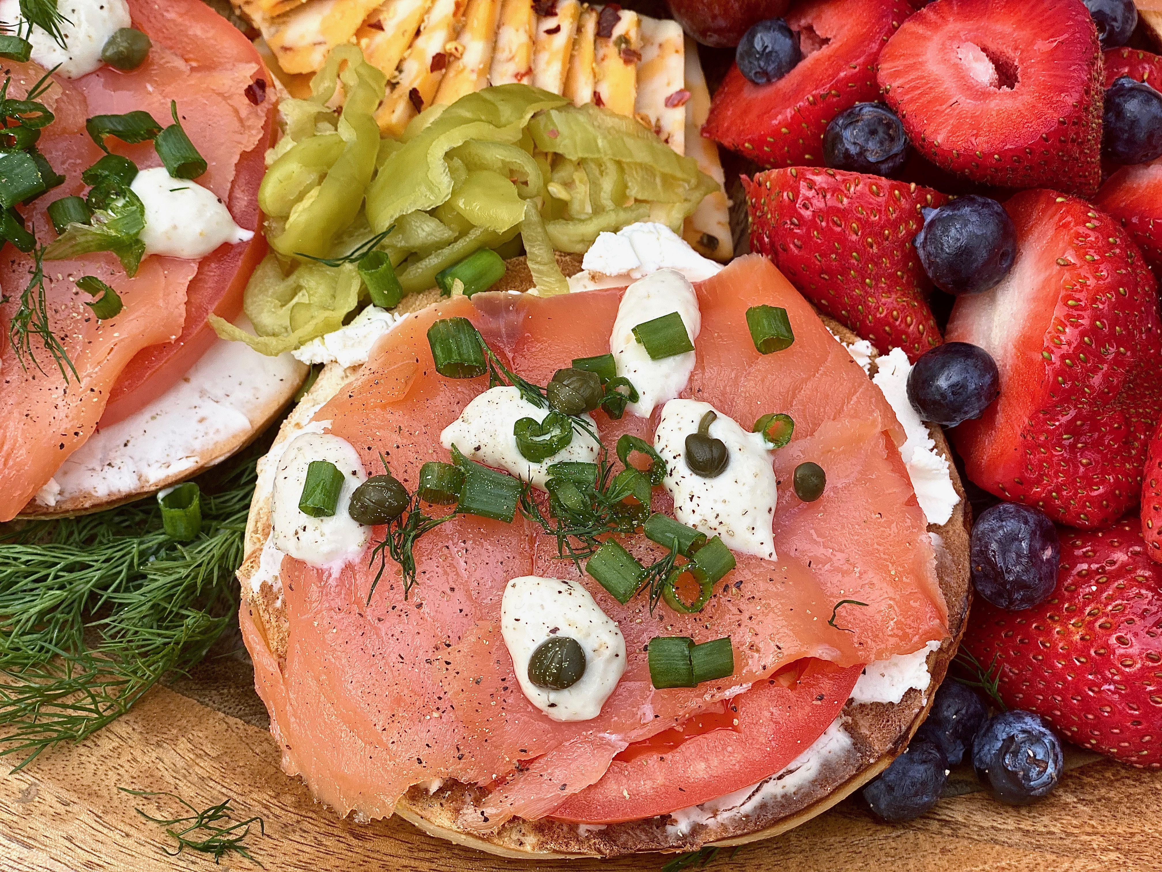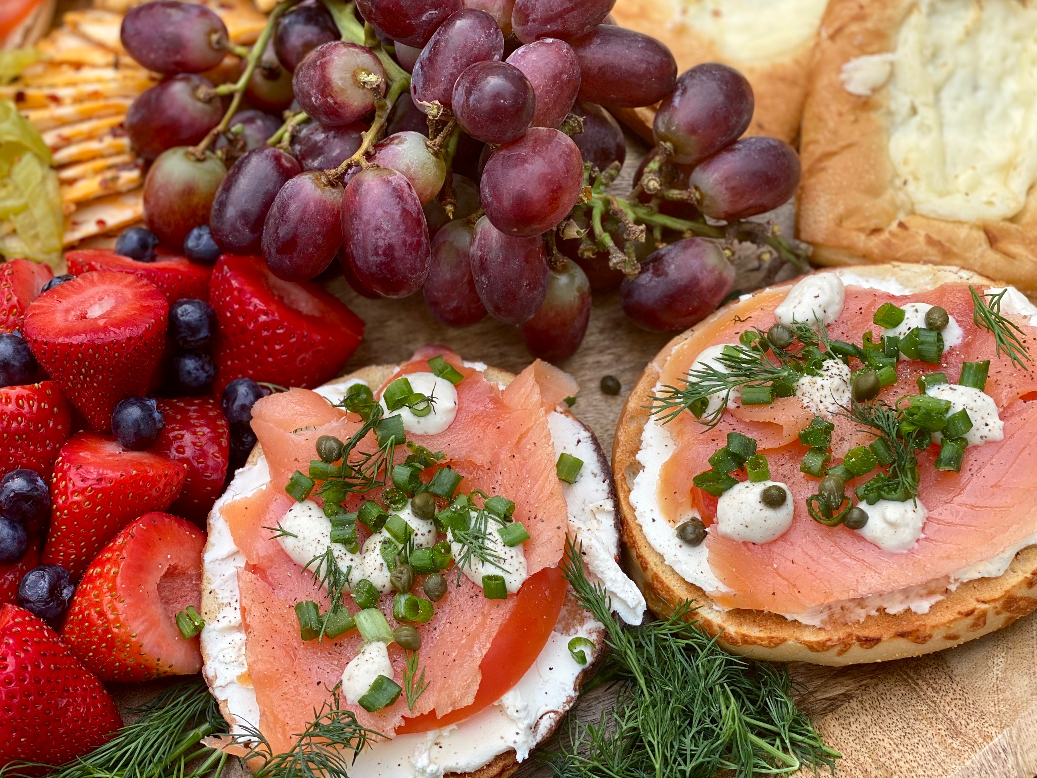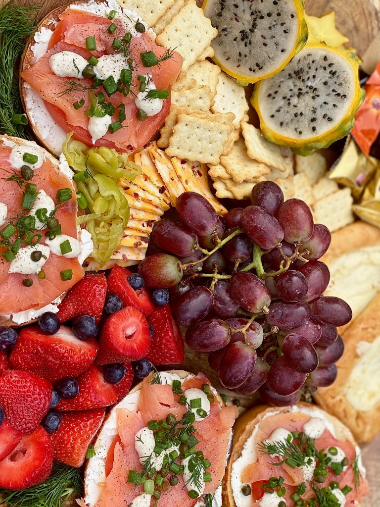 One of my boyfriend & I’s favorite brunch menu items is lox and cream cheese! His birthday had just passed and we wanted to celebrate with a relaxing brunch together at home instead of going out.. which sometimes we end up enjoying more! It all depends what kind of mood we’re in, but we’re always in the mood for a crusty, chewy smoked salmon bagel; smothered in cream cheese and adorned with all the most perfect toppings! It’s definitely one of his favorite dishes in the world, so I wanted to take one of the things he loves to eat most, and completely combined it with one of the things I love to create most in life. Of course, that had to a board!! Since the salmon is smokey & savory.. I wanted to counteract all of that with sweet, sensational wonders! Fresh fruit alongside a few sugary pastries are absolutely perfect to decorate all around any kind of brunch board.. especially this smokey one right here! Even if you’re not celebrating a birthday, you can create a board just like this to enjoy on a Sunday morning watching your favorite shows, or reading a book you can’t take your eyes out of.
