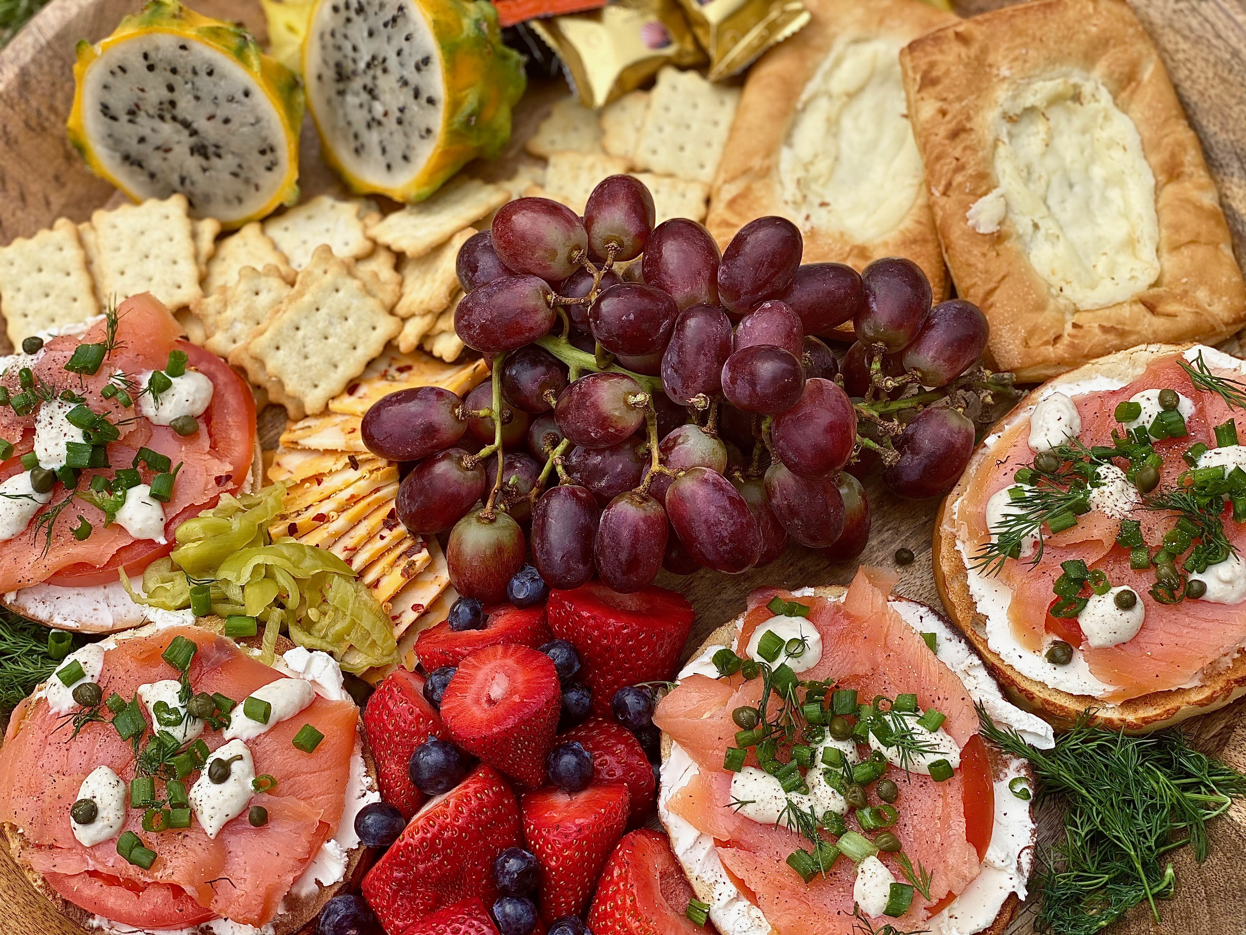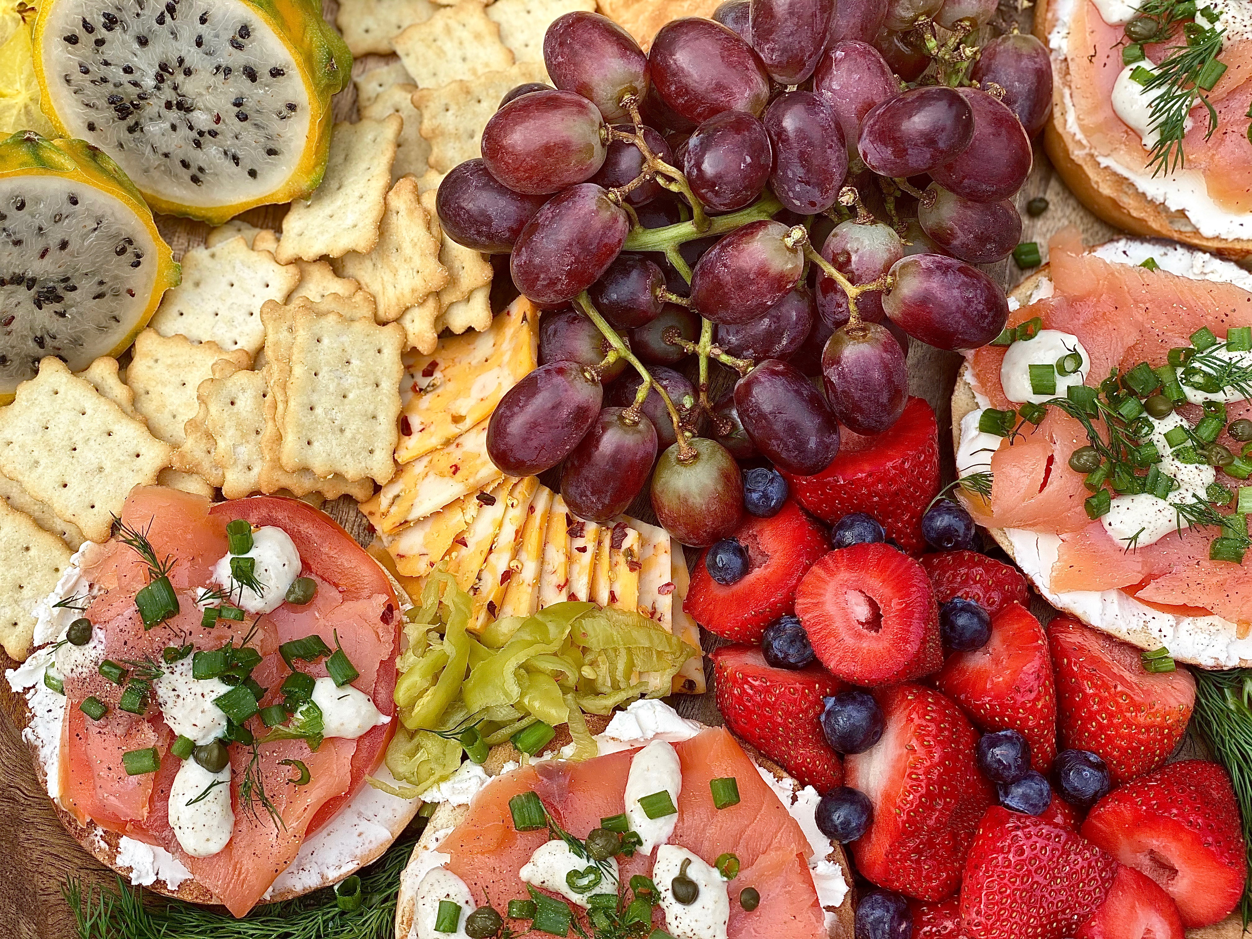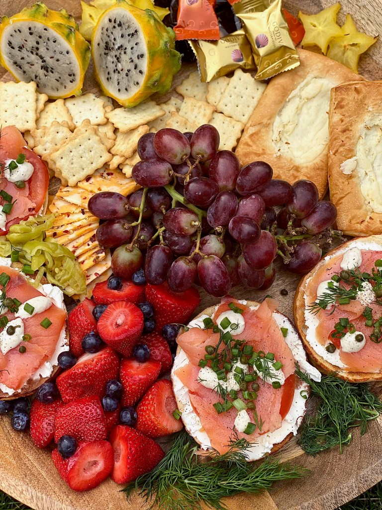 One of my boyfriend & I’s favorite brunch menu items is lox and cream cheese! His birthday had just passed and we wanted to celebrate with a relaxing brunch together at home instead of going out.. which sometimes we end up enjoying more! It all depends what kind of mood we’re in, but we’re always in the mood for a crusty, chewy smoked salmon bagel; smothered in cream cheese and adorned with all the most perfect toppings! It’s definitely one of his favorite dishes in the world, so I wanted to take one of the things he loves to eat most, and completely combined it with one of the things I love to create most in life. Of course, that had to a board!! Since the salmon is smokey & savory.. I wanted to counteract all of that with sweet, sensational wonders! Fresh fruit alongside a few sugary pastries are absolutely perfect to decorate all around any kind of brunch board.. especially this smokey one right here! Even if you’re not celebrating a birthday, you can create a board just like this to enjoy on a Sunday morning watching your favorite shows, or reading a book you can’t take your eyes out of.