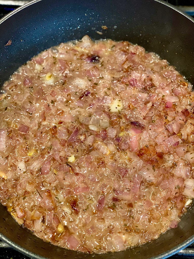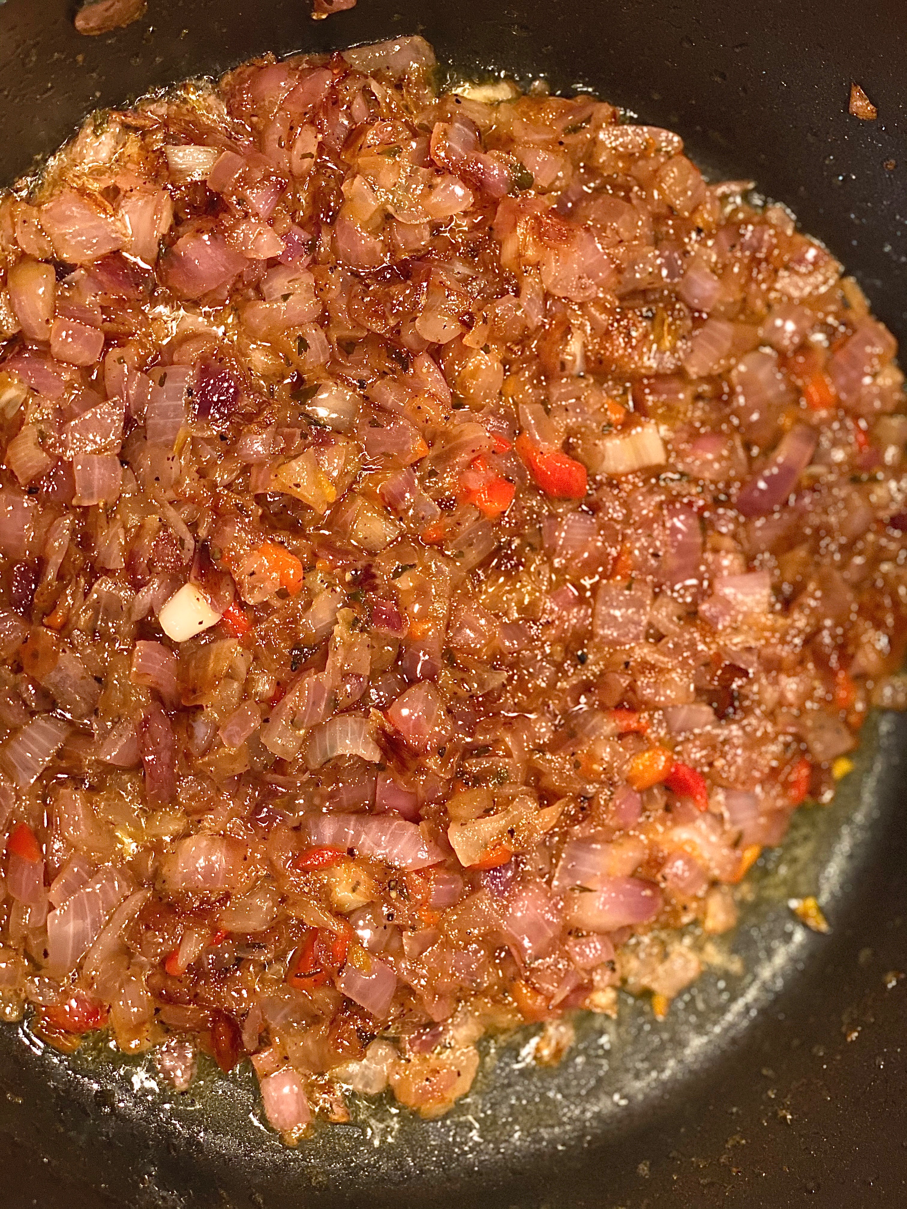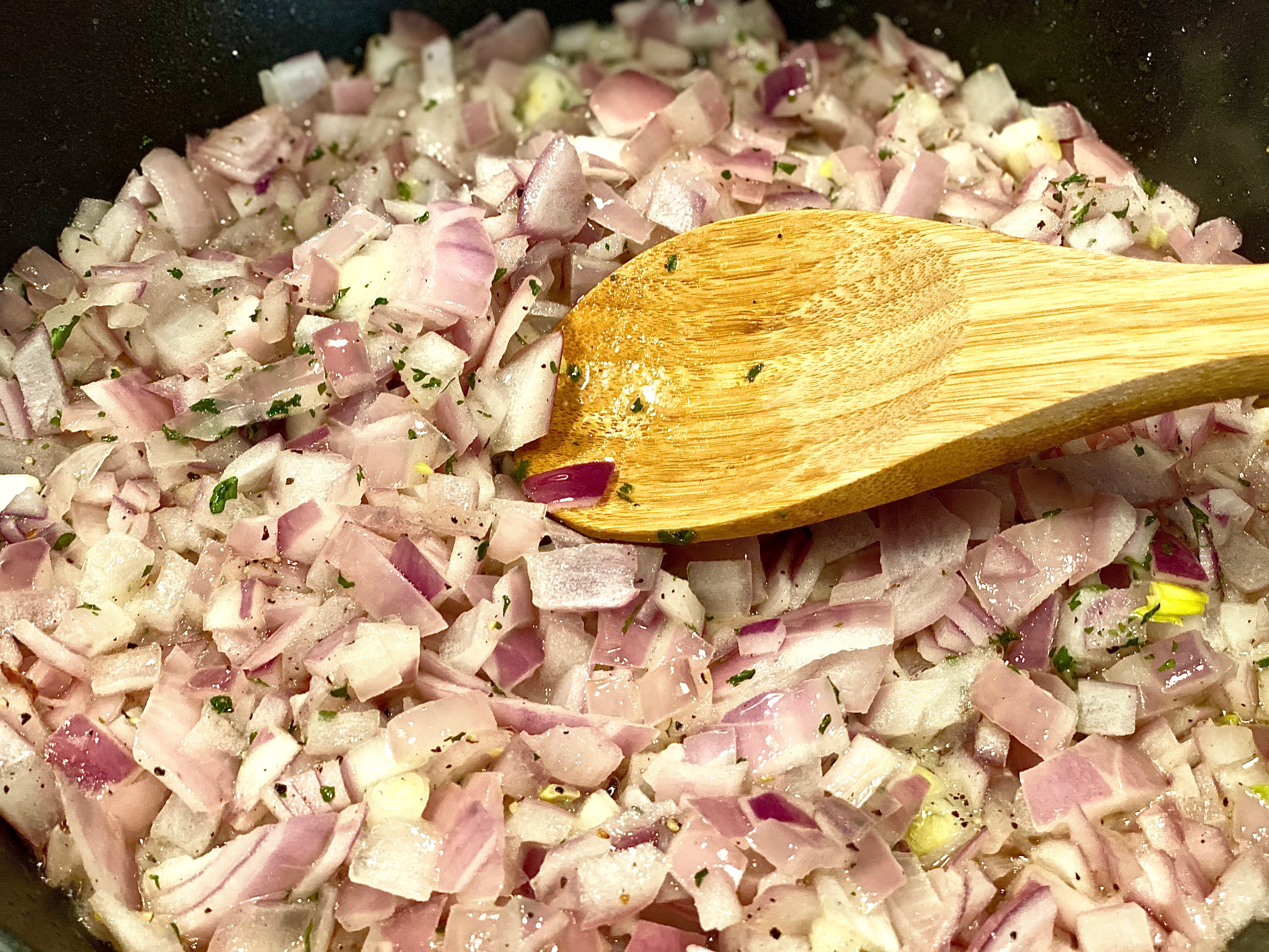 Dice up two large red onions and toss them on top of the melted butter. Mix in garlic powder, parsley, salt & pepper and cook on low for 30-40 minutes, stirring occasionally. To amp up the natural sweetness of the onion itself you can add in two tablespoons of granulated sugar as well.