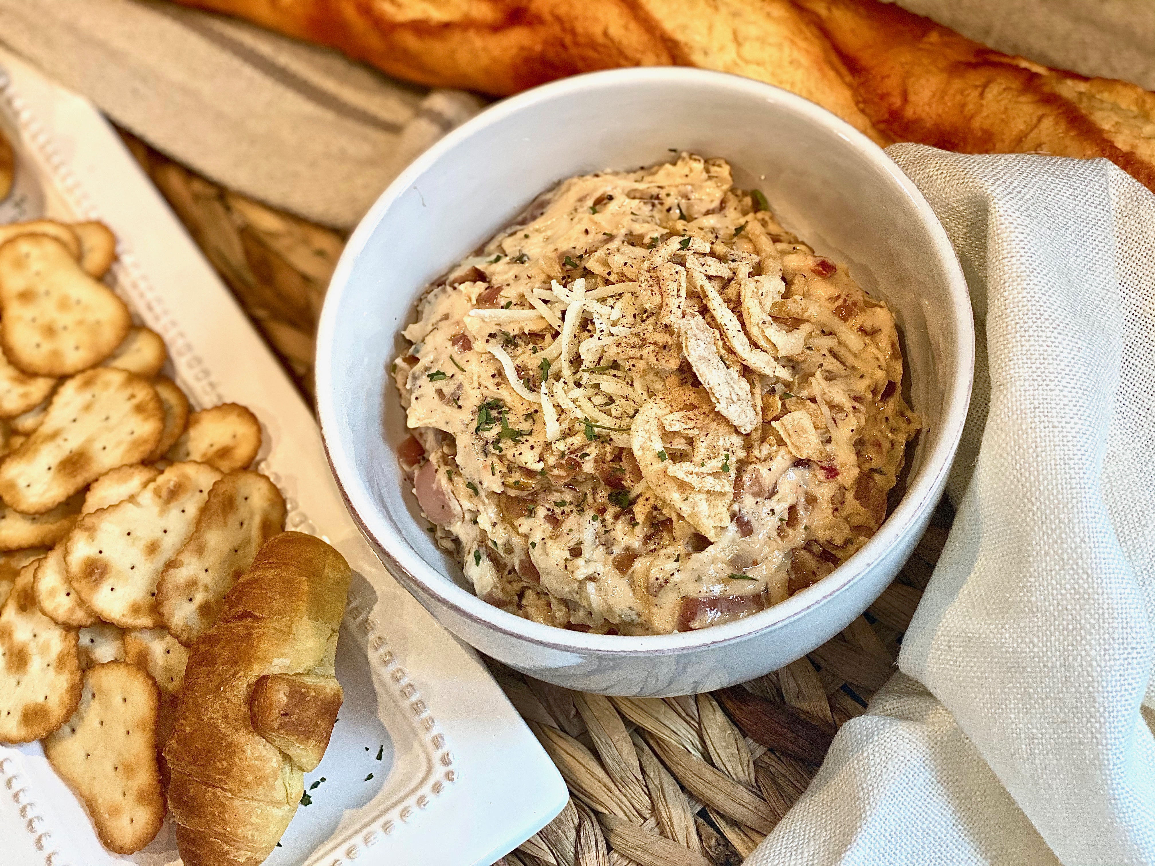 - Stir everything together and pile it into a serving bowl. Garnish your glorious caramelized onion dip with French fried onions, mozzarella cheese, parsley, and fresh cracked black pepper!