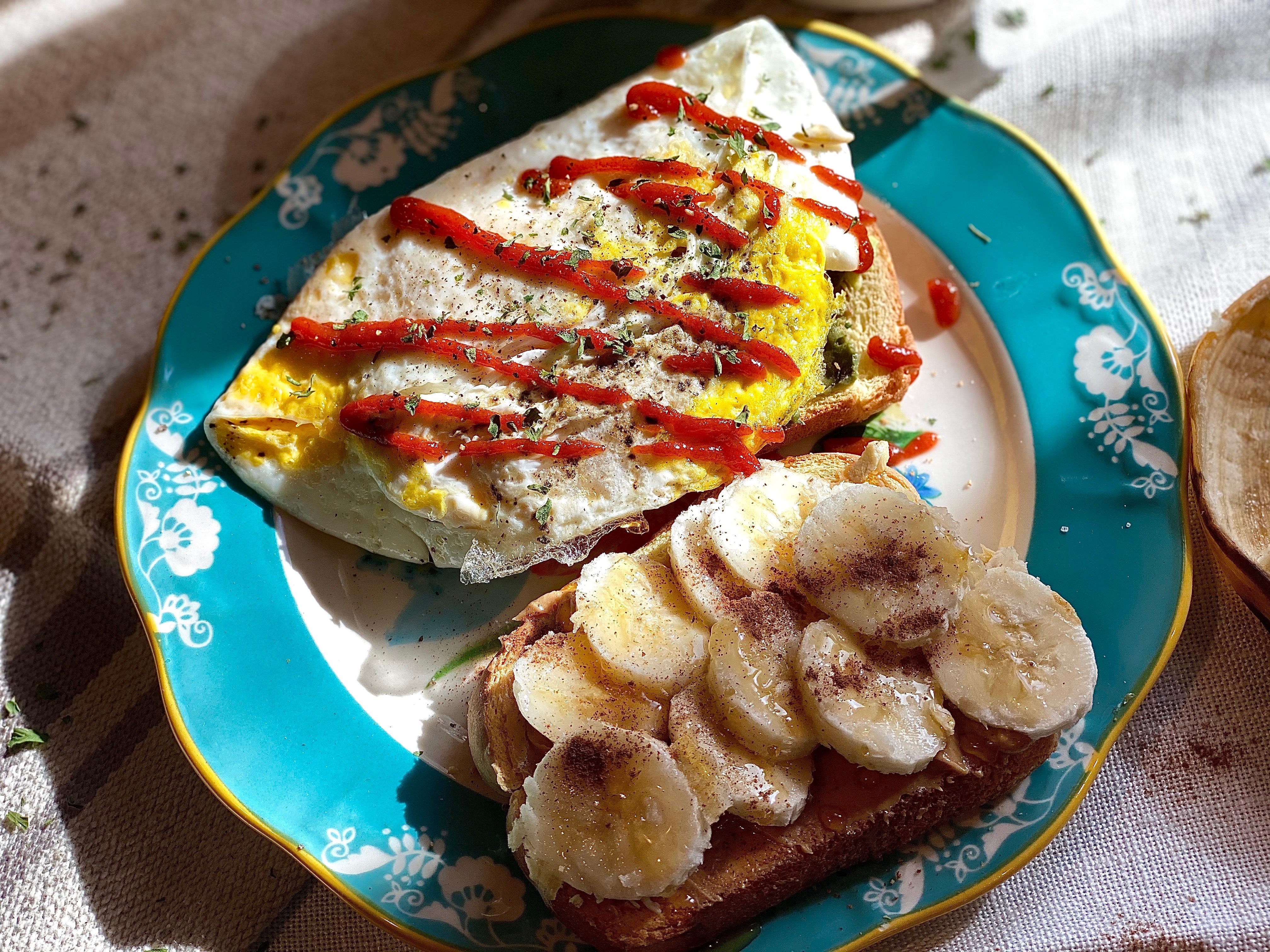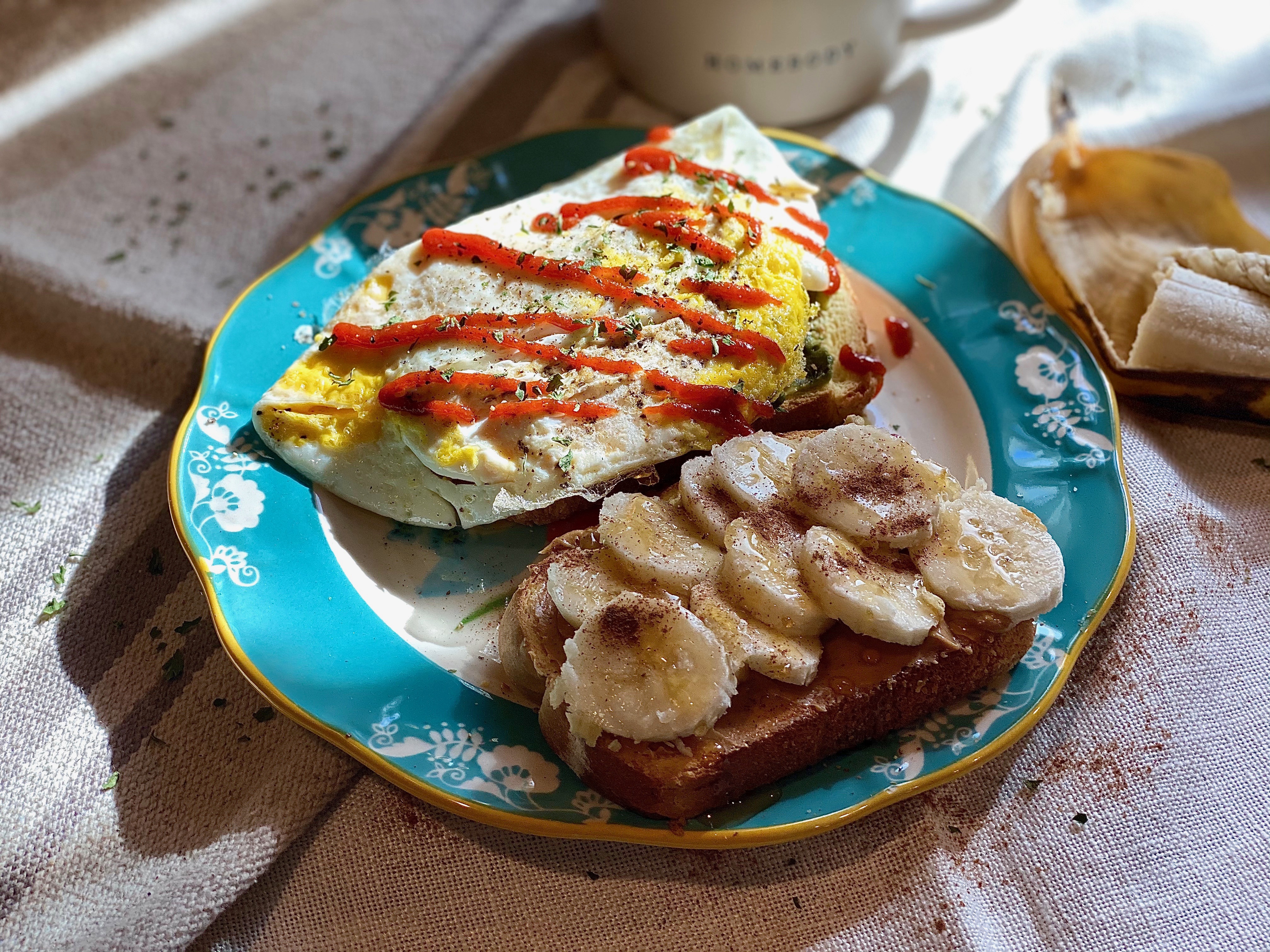 - For my second piece of toast I chose to go super sweet, soft, and sticky! The trifecta of S’s if you will. 😉 I generously spread my favorite peanut butter all over one slice of freshly toasted brioche bread.. sliced up half of a banana, drizzled on local honey, and a dash of cinnamon for that extra finish!