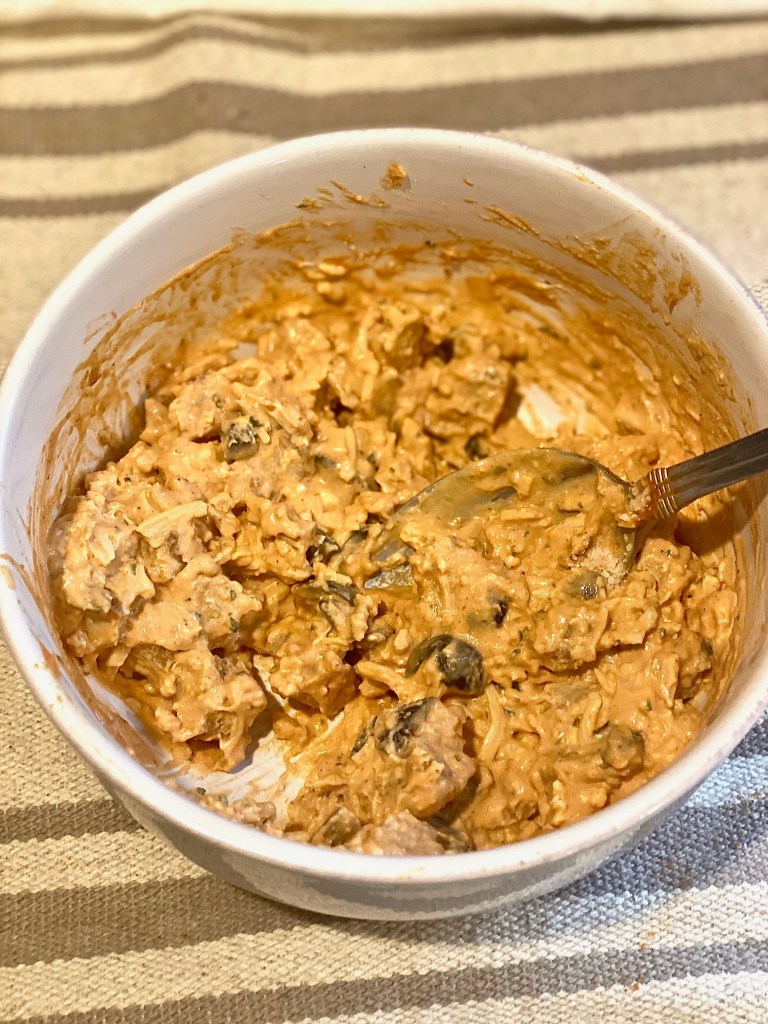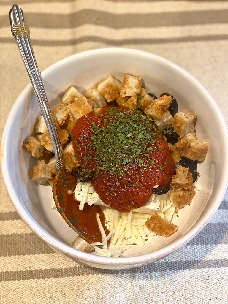 - Combine all of the ingredients with 3 tablespoons of pizza sauce or plain marinara sauce. Whatever you have on hand will taste just as amazing.