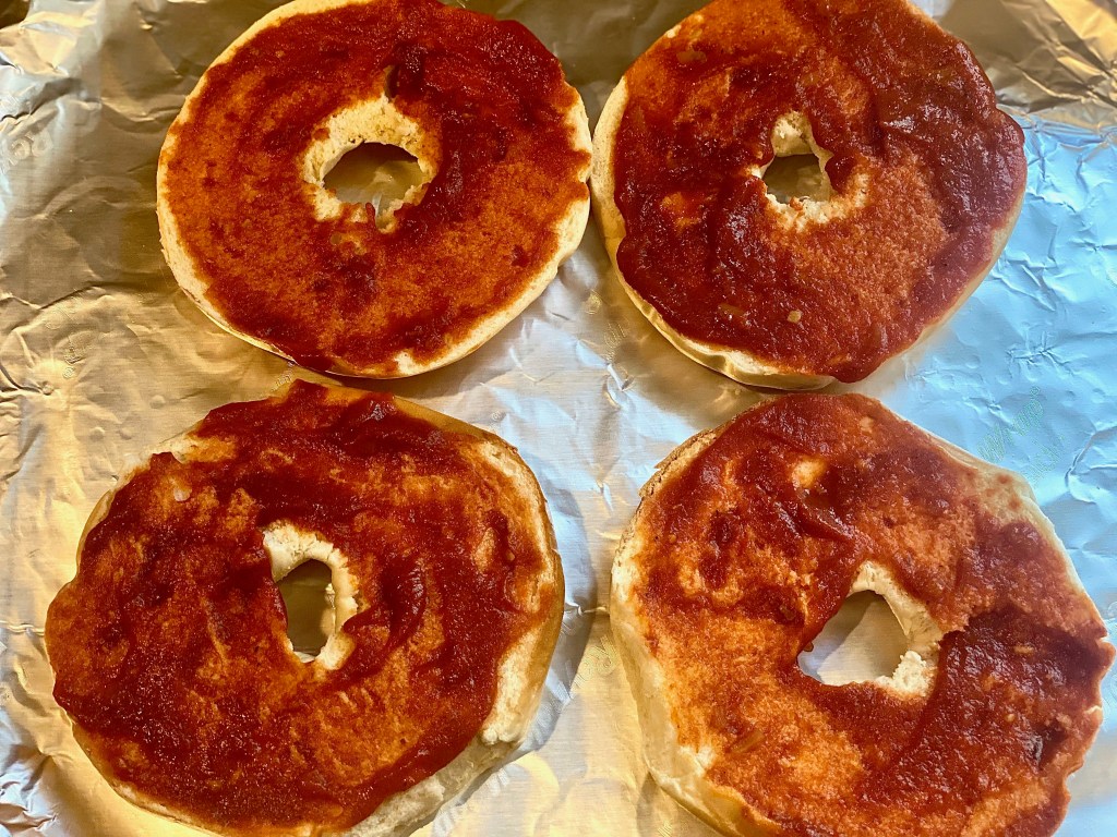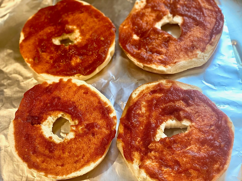 Take any flavored bagel of your choice.. none of the sweet ones of course, and smother a generous layer of pizza sauce all over the inside of each half. I made two bagels but you can obviously make however many you need to suit your family or guests.